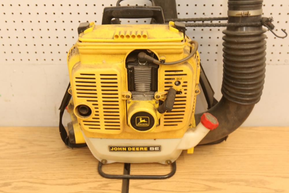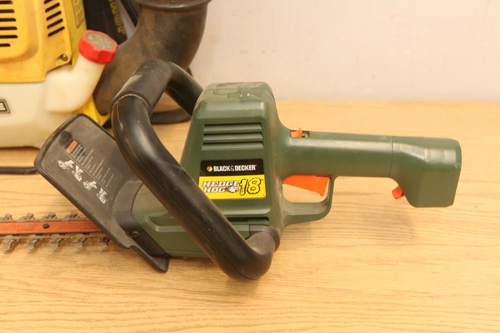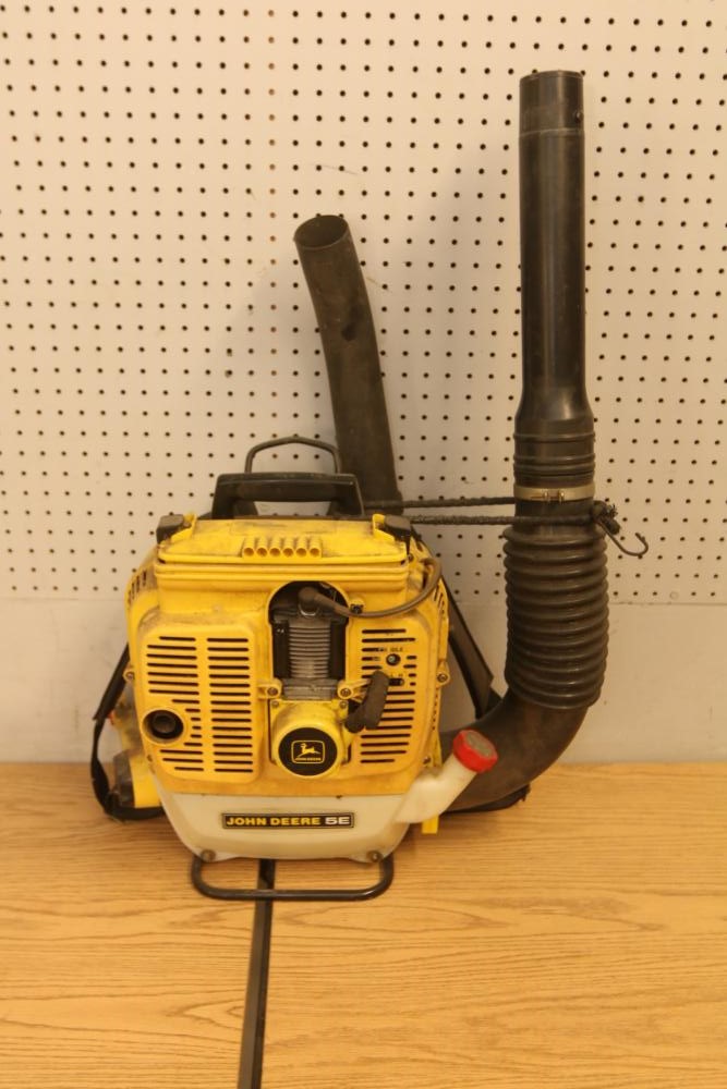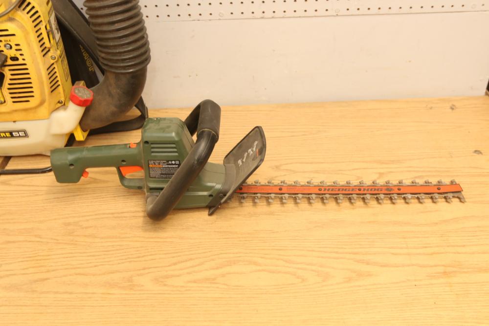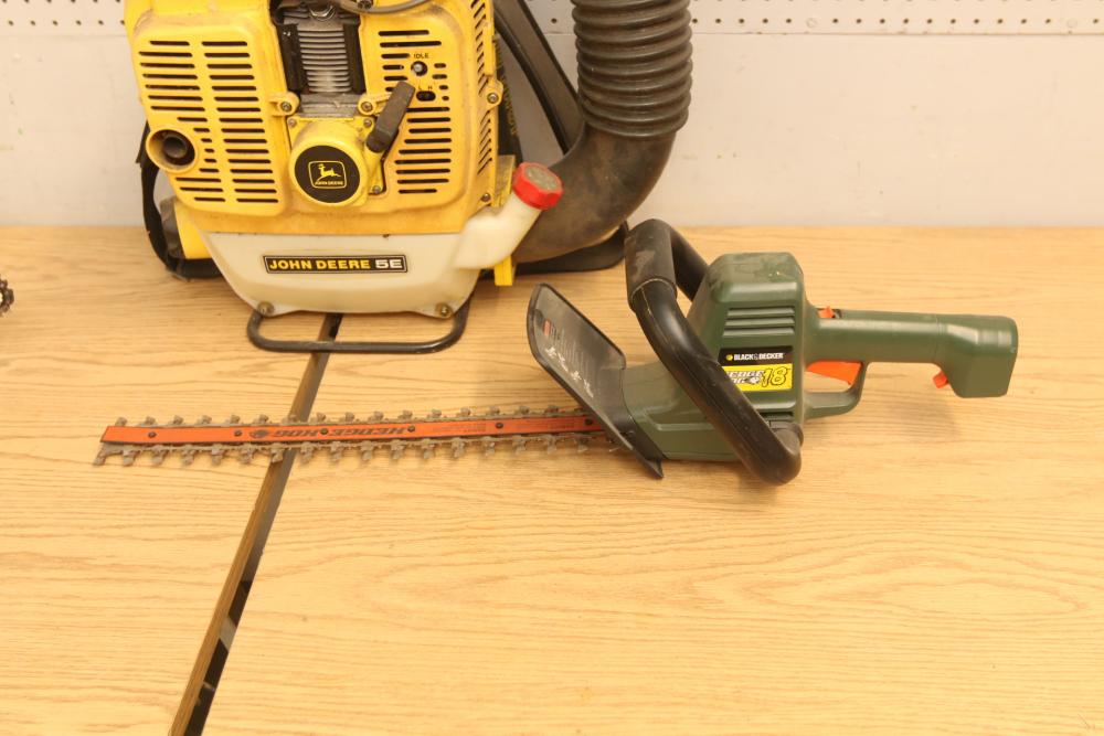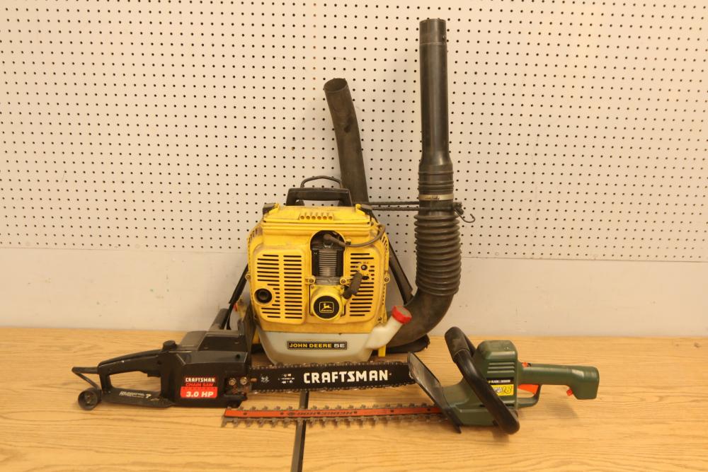 Landscaping equipment incl John Deer 5E gas backpack leaf blower, wired Craftsman 3hp chain saw with a 16" bar model 358.341020, Black & Decker Hedge Hog 18" hedge trimmer model HS1000. Pickup only.