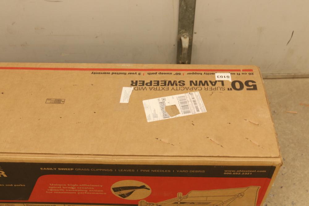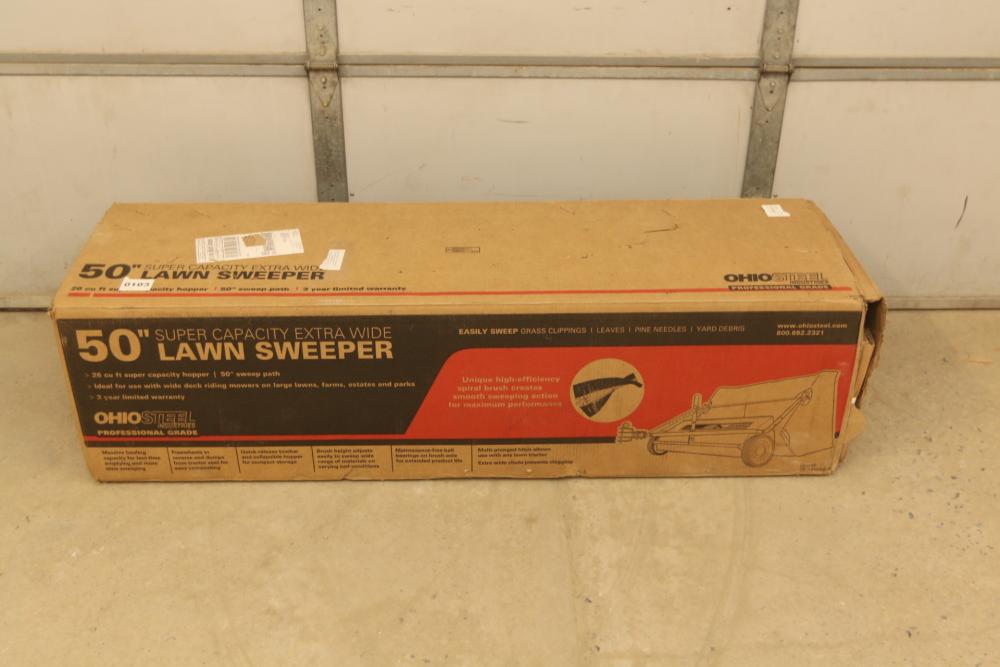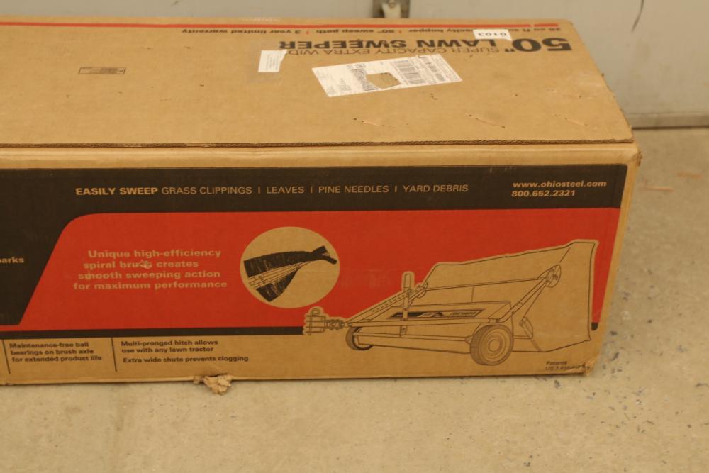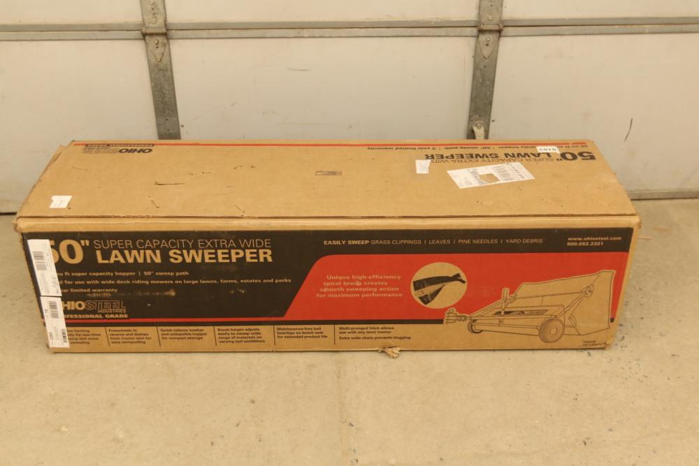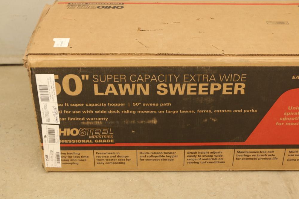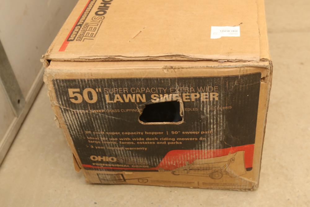 Ohio Steel Industries professional grade 50" lawn sweeper model 50SWP26, appearing to be in original box. Pickup only.