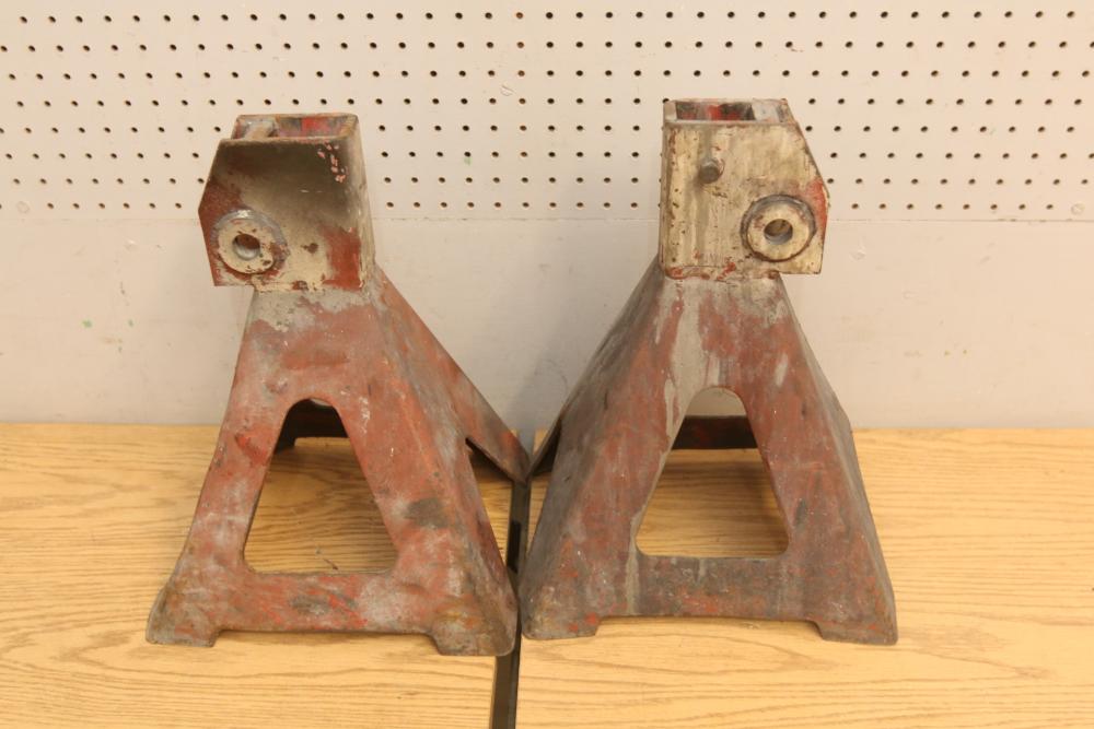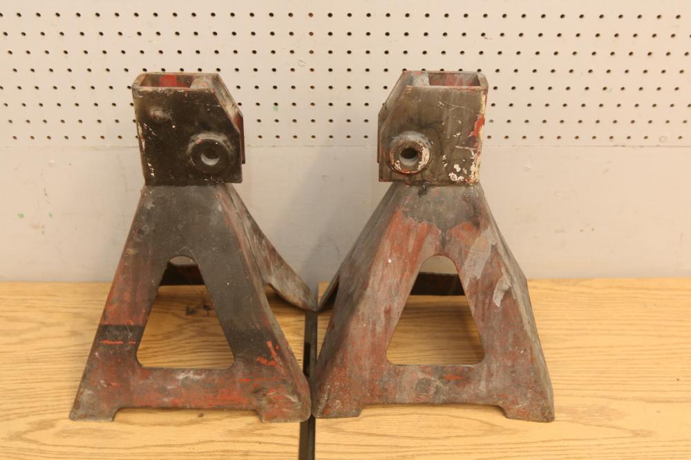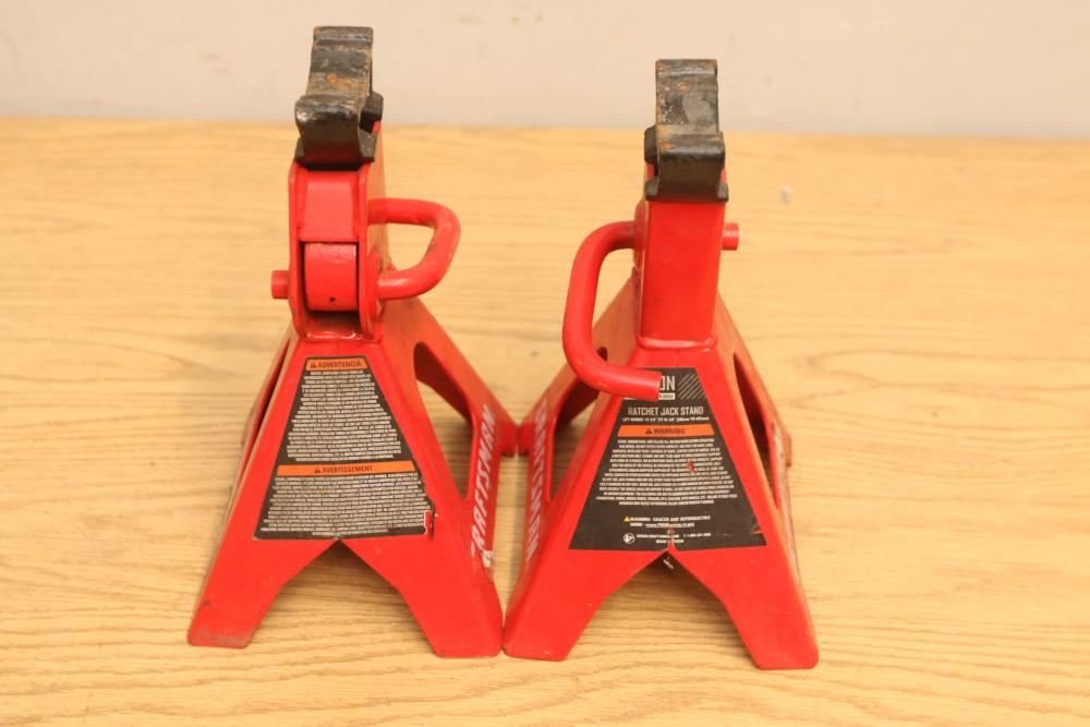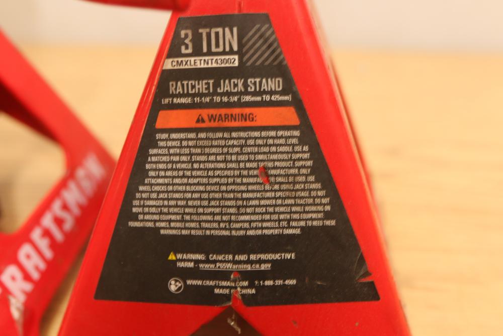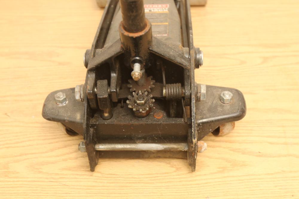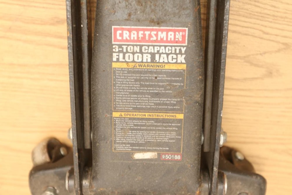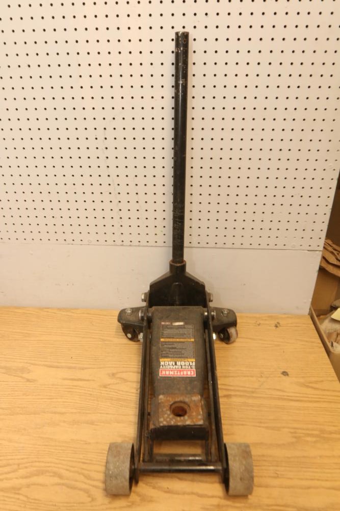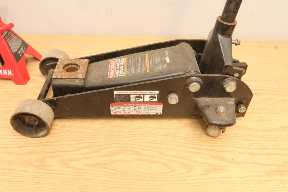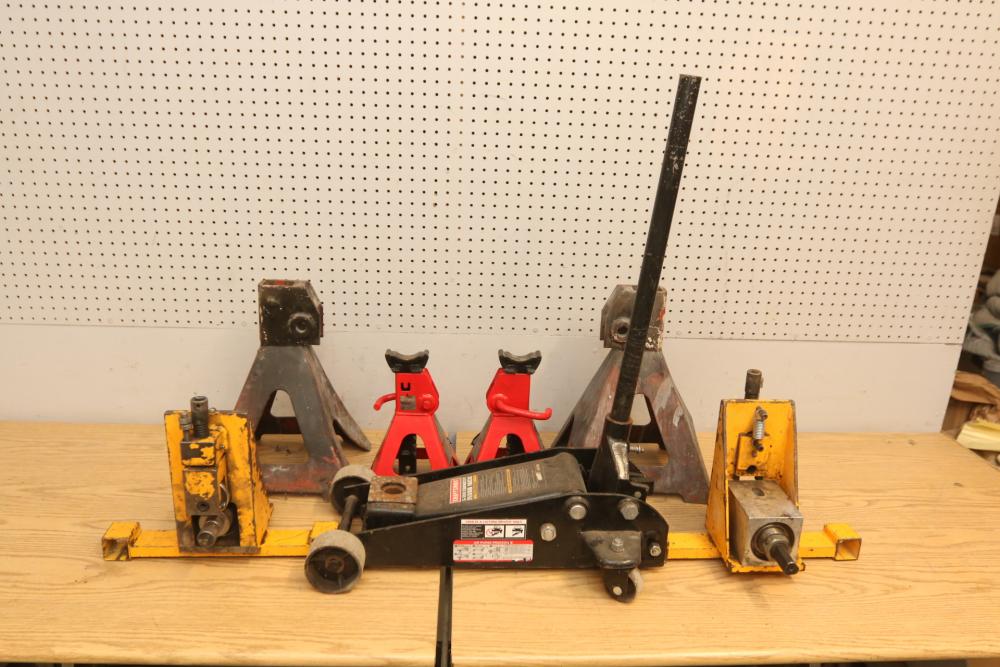 Craftsman 3 ton hydraulic floor jack model 950188, Craftsman 3 ton ratchet jack stand model CMXLETNT43002 with a lift range of 11-1/4" to 16-3/4", unmarked jack stand bases, also incl believed to be hydraulic pipe feeder components. Pickup only.