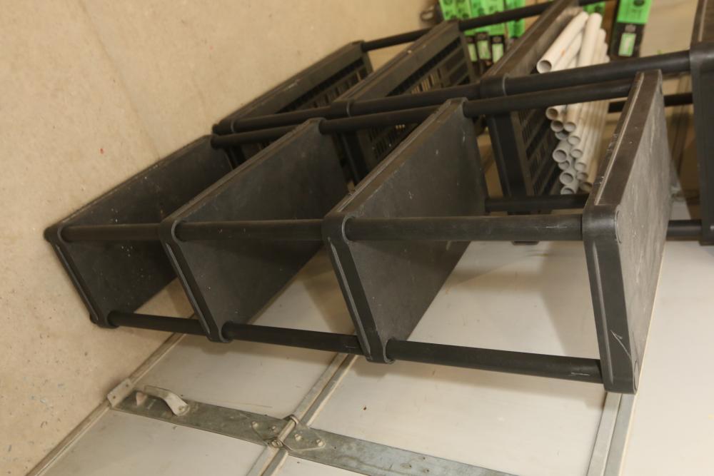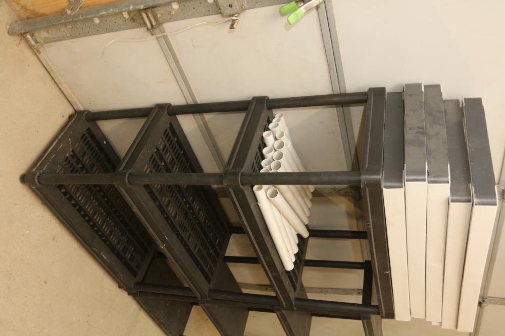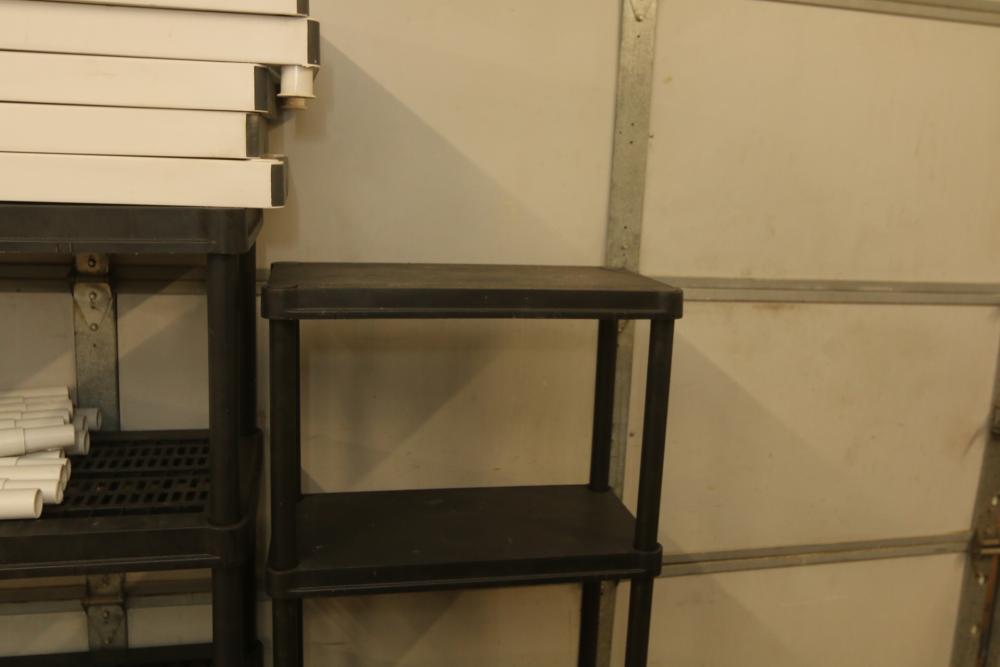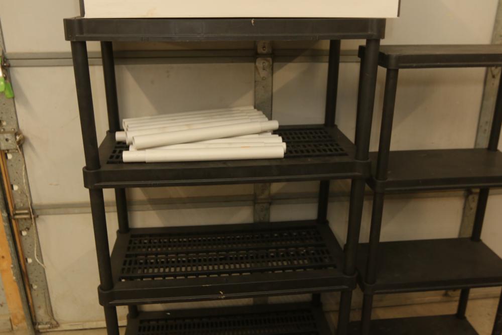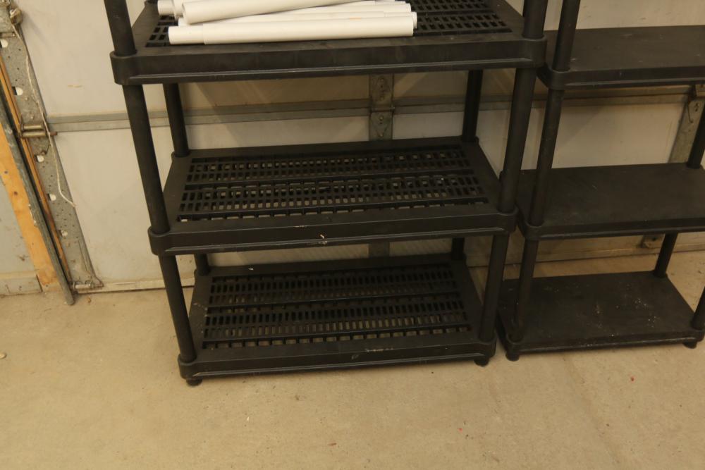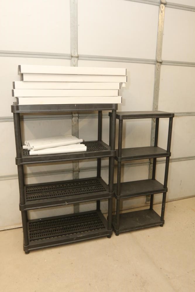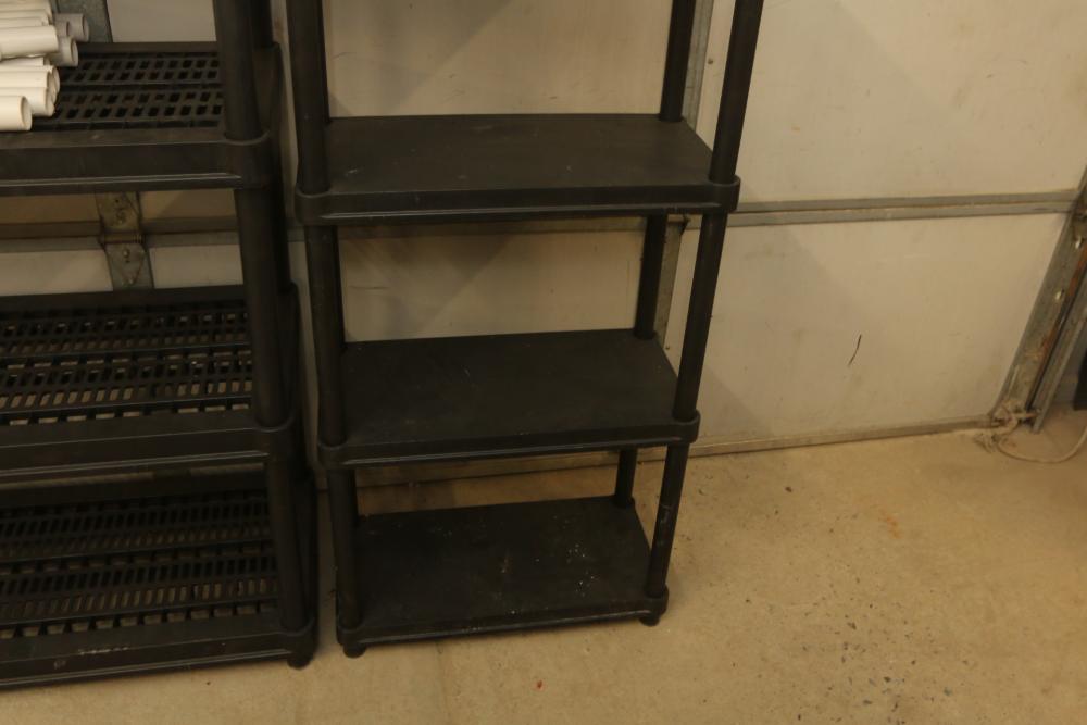 Three plastic shelving units incl two with four shelves, and one with five. Pickup only.