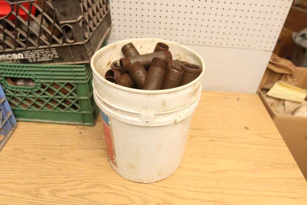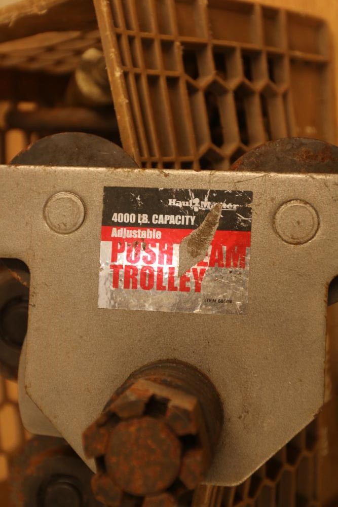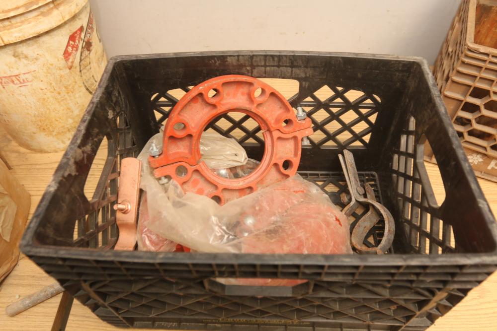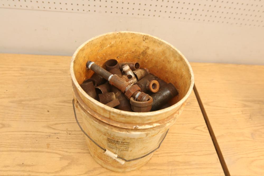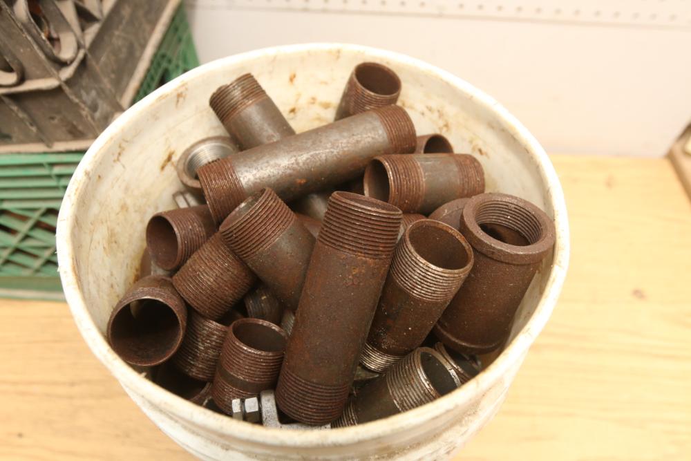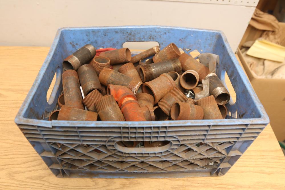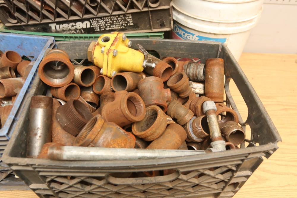 Pipe fittings incl straight fittings, 90 degree, 45 degree, Tee fittings, most appearing to have threaded ends on both sides also incl push beam trolley 4,000lb capacity, etc. Pickup only.