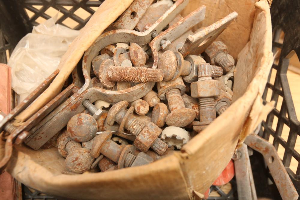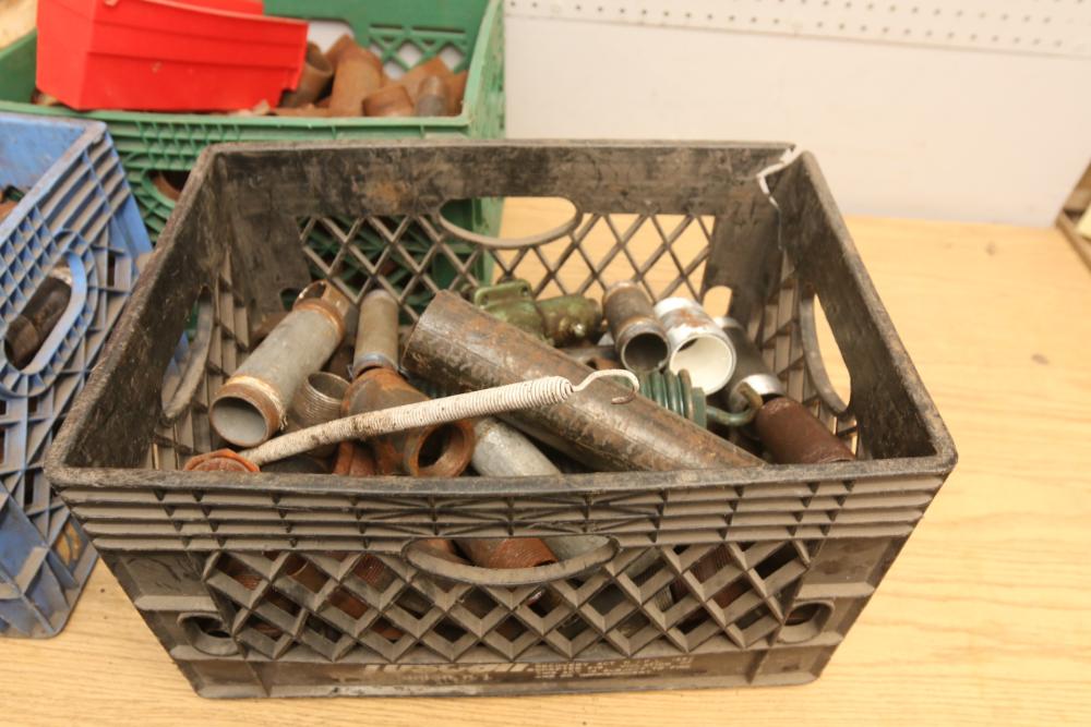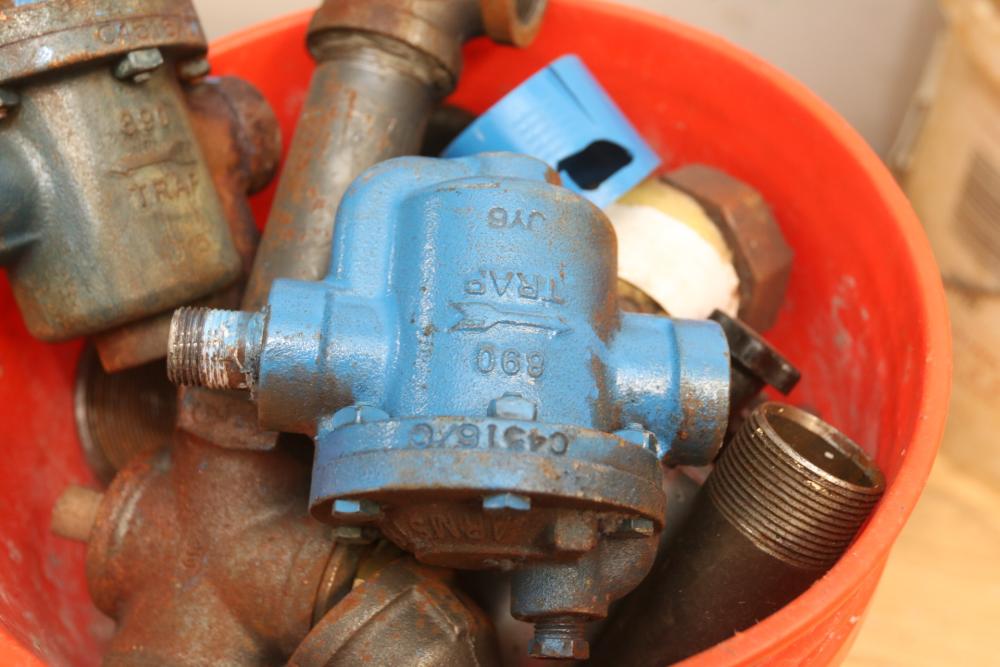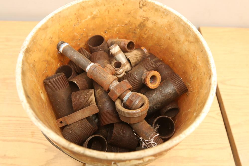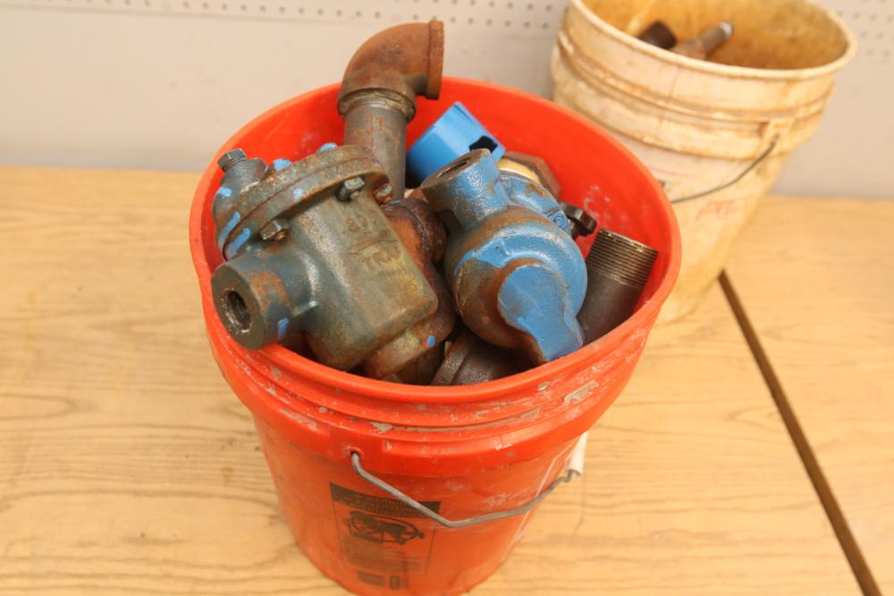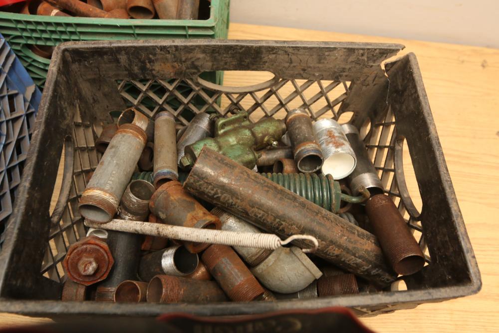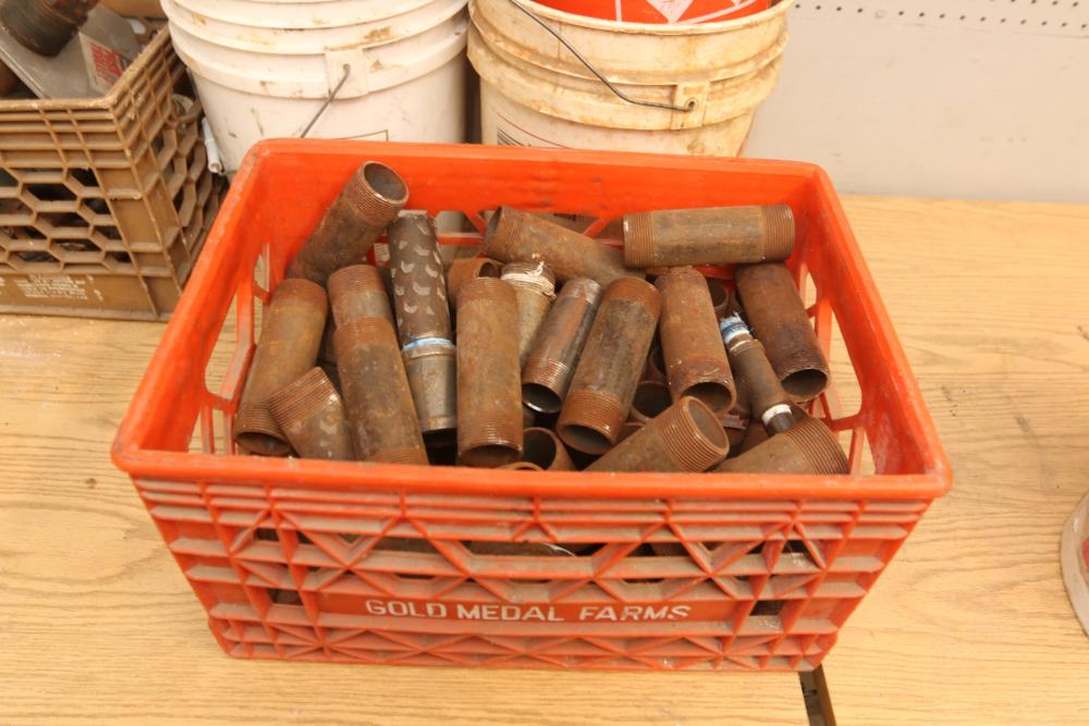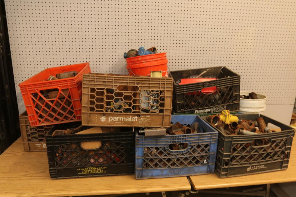 Pipe fittings incl straight fittings, 90 degree, 45 degree, Tee fittings, most appearing to have threaded ends on both sides also incl push beam trolley 4,000lb capacity, etc. Pickup only.