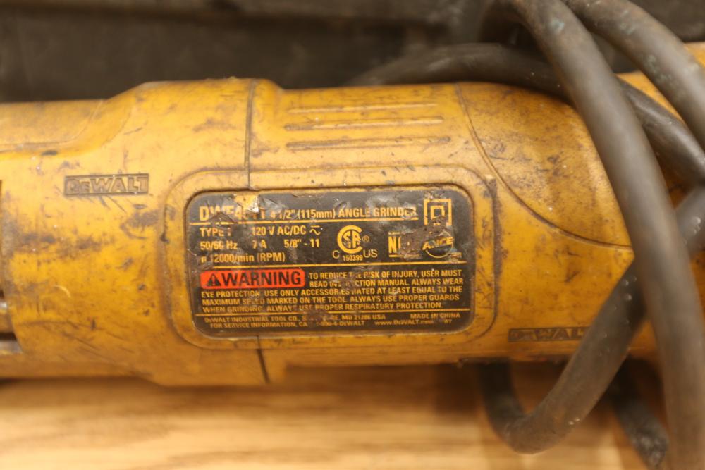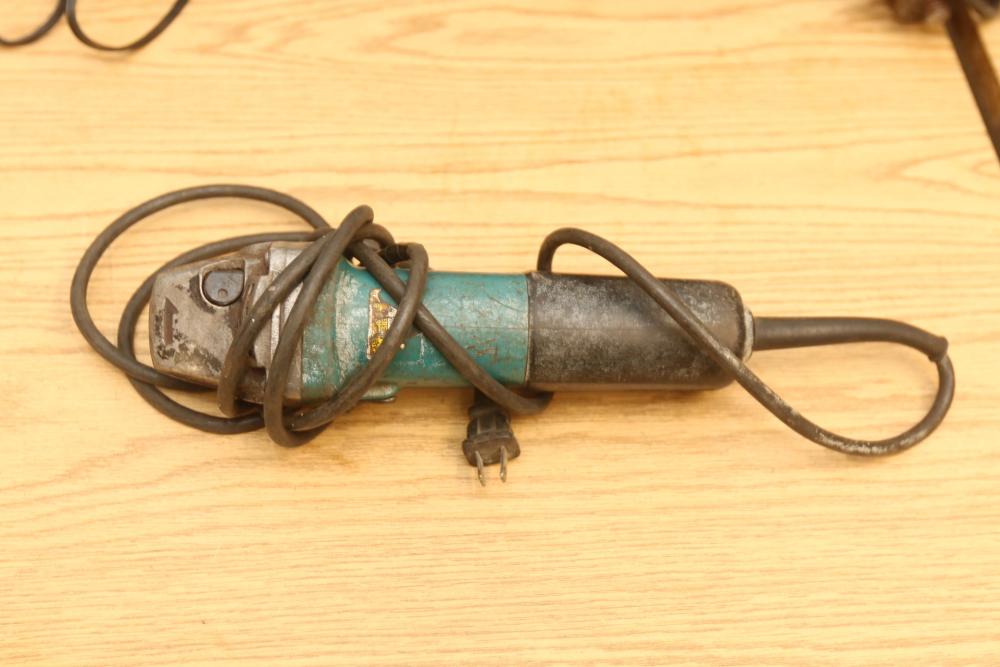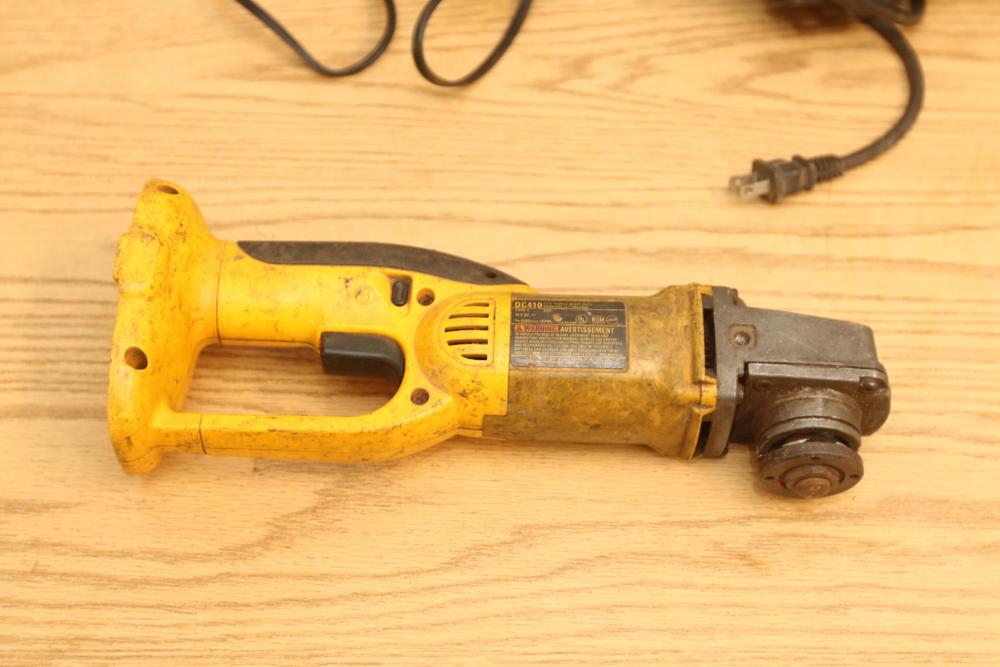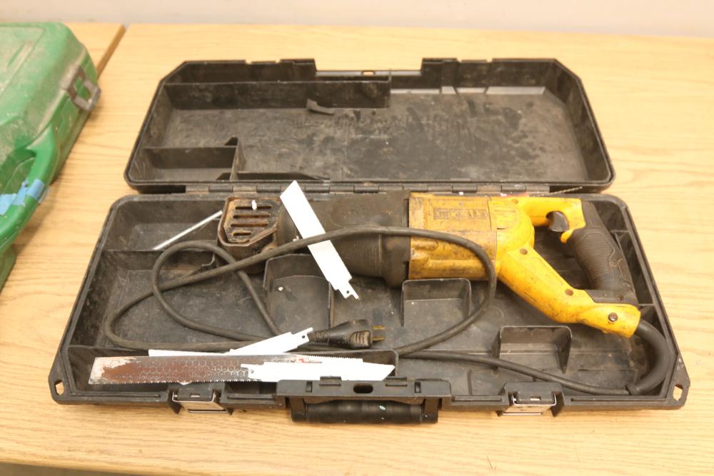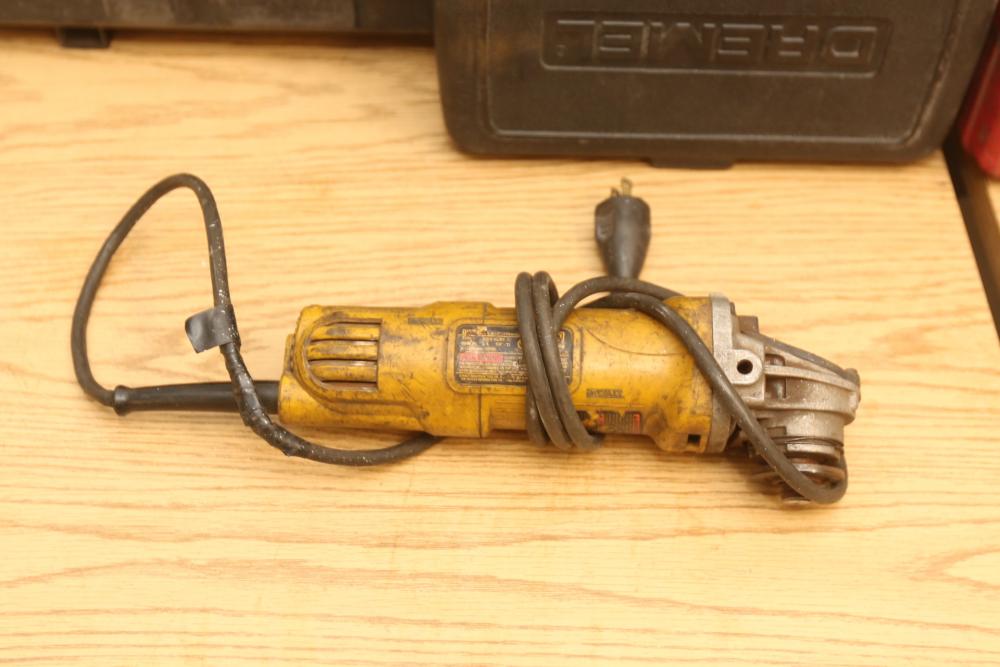 Power tools incl Dewalt 4-1/2" cordless cut off tool model DC410, Makita 4-1/2" wired angle grinder model 9557NB, Dewalt 4-1/2" wired angle grinder, Dremel MultiPro cordless model 770 in hard case, rear disc brake caliper tool, various bits, tile saw, Dewalt wired variable speed reciprocating saw model DWE305 in plastic hard case. Pickup only.