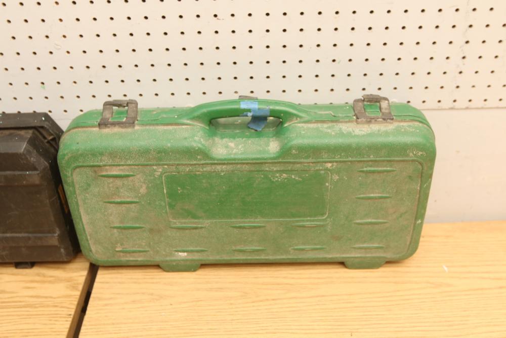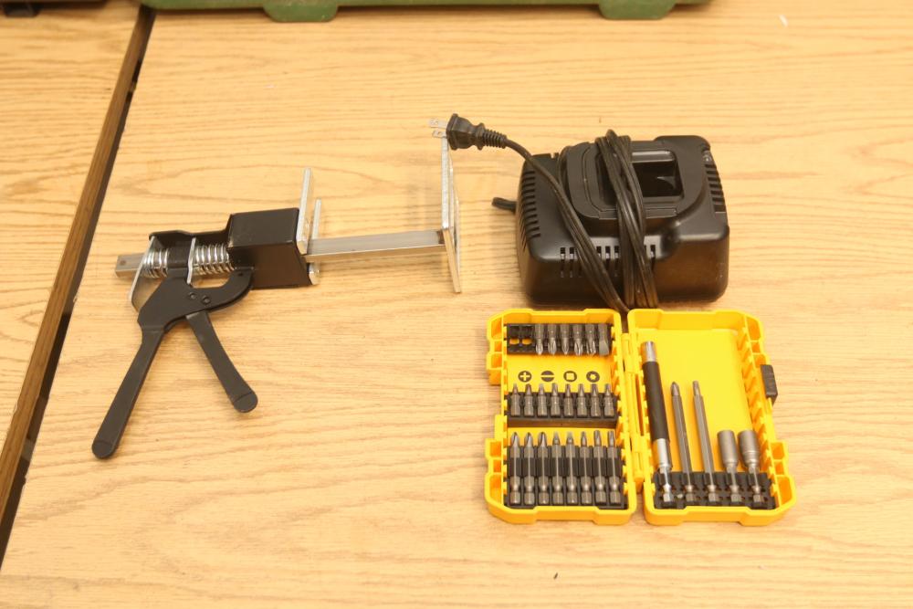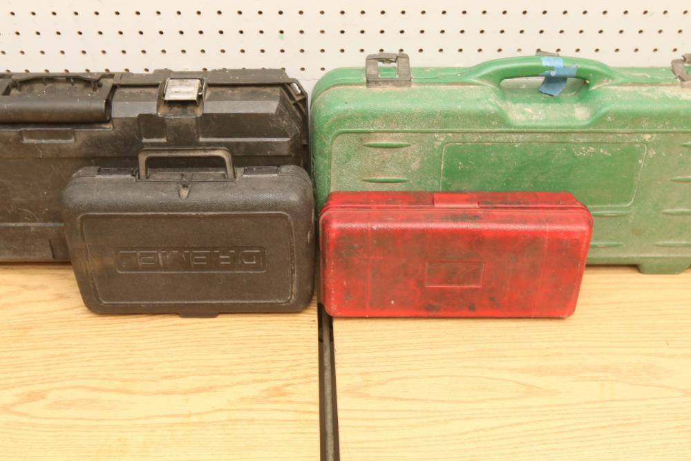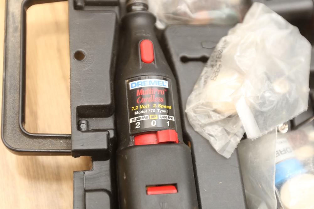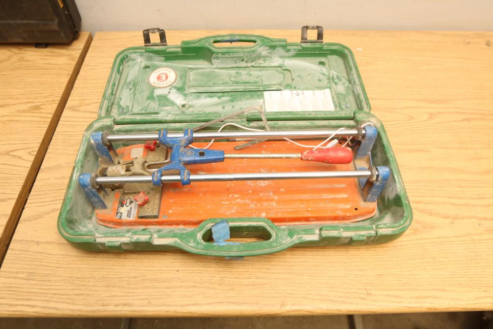 Power tools incl Dewalt 4-1/2" cordless cut off tool model DC410, Makita 4-1/2" wired angle grinder model 9557NB, Dewalt 4-1/2" wired angle grinder, Dremel MultiPro cordless model 770 in hard case, rear disc brake caliper tool, various bits, tile saw, Dewalt wired variable speed reciprocating saw model DWE305 in plastic hard case. Pickup only.