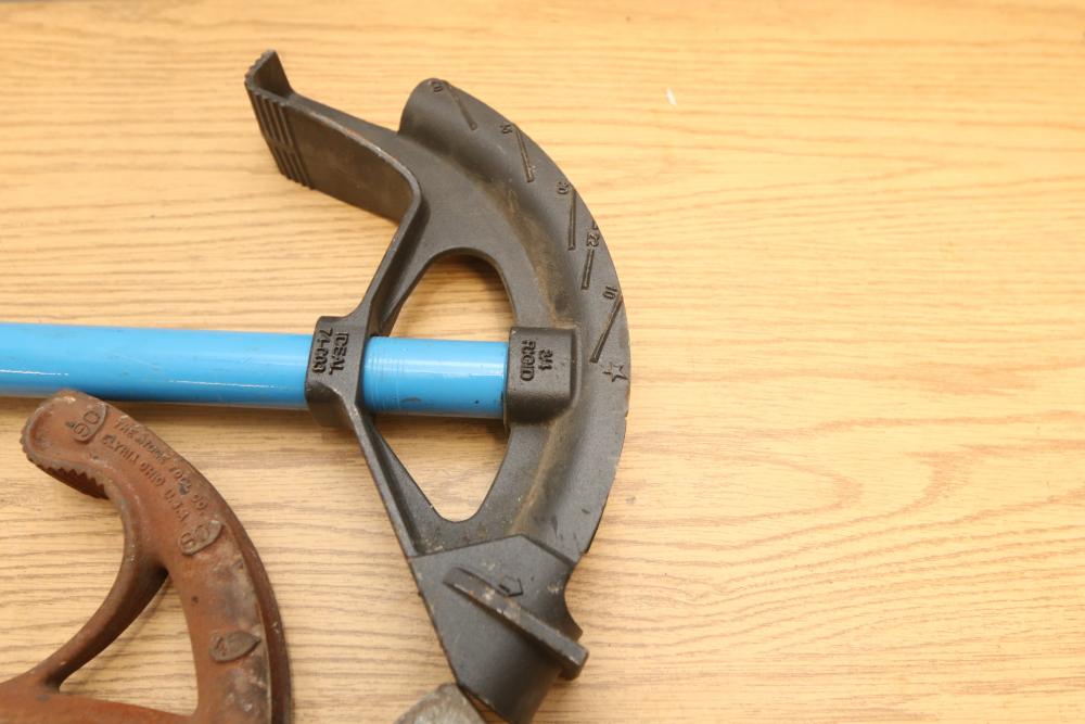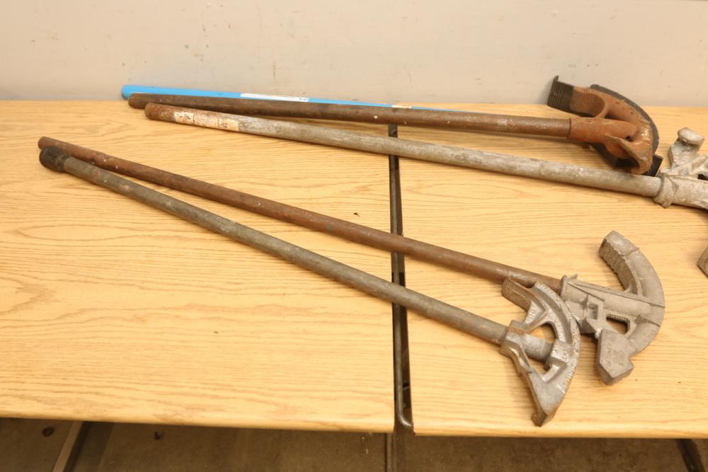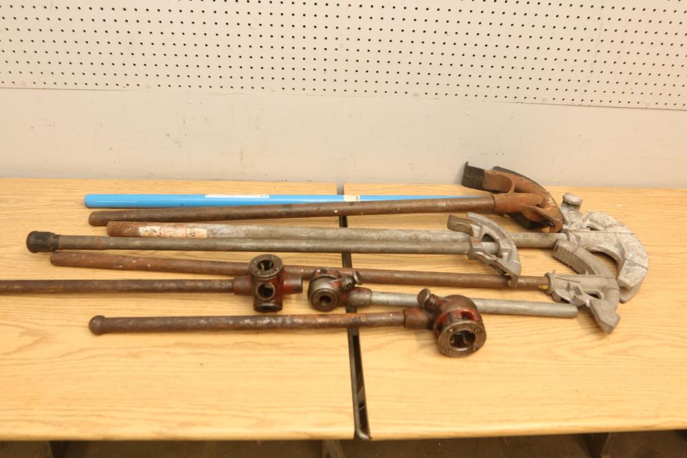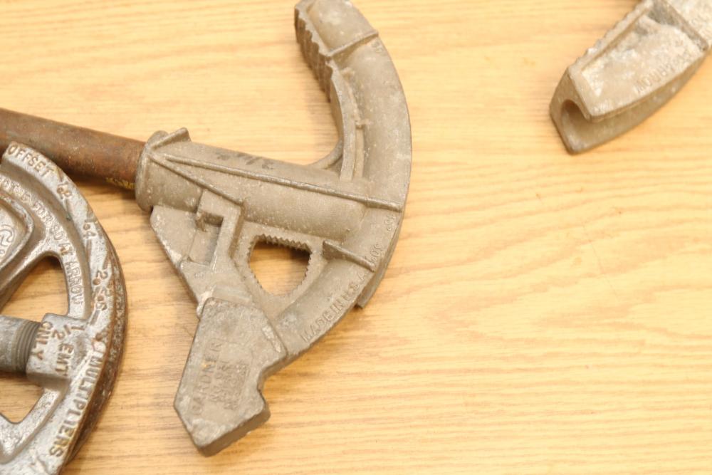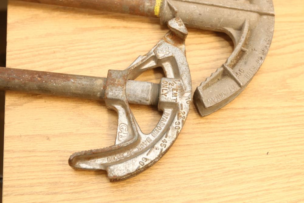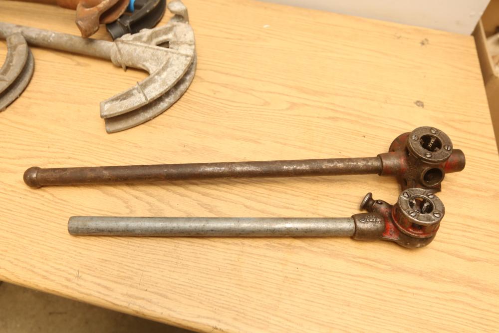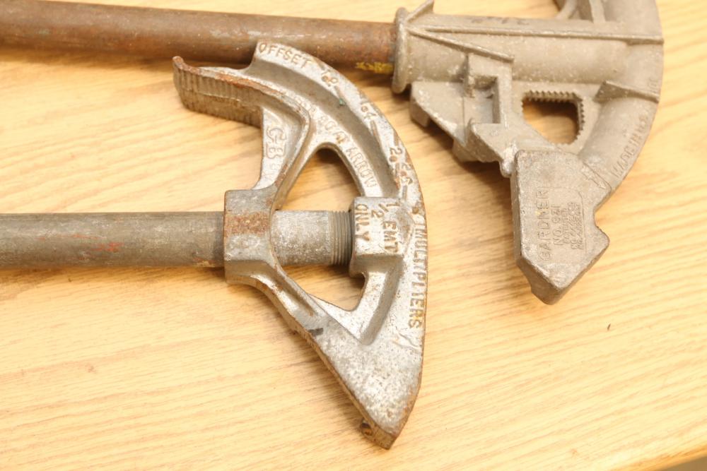 Hand tools incl pipe benders, some marked "1/2 EMT only", "Gardner No. 921", "Ridgid", "Ideal 74-003", also incl two Ridgid ratchet threaders. Pickup only.