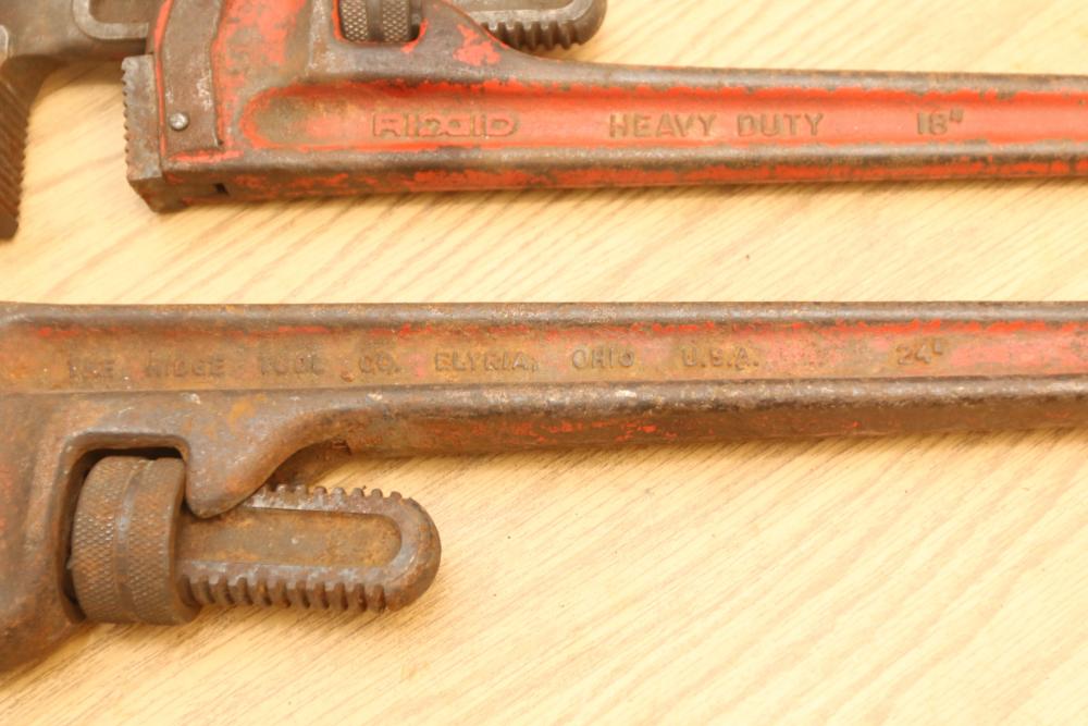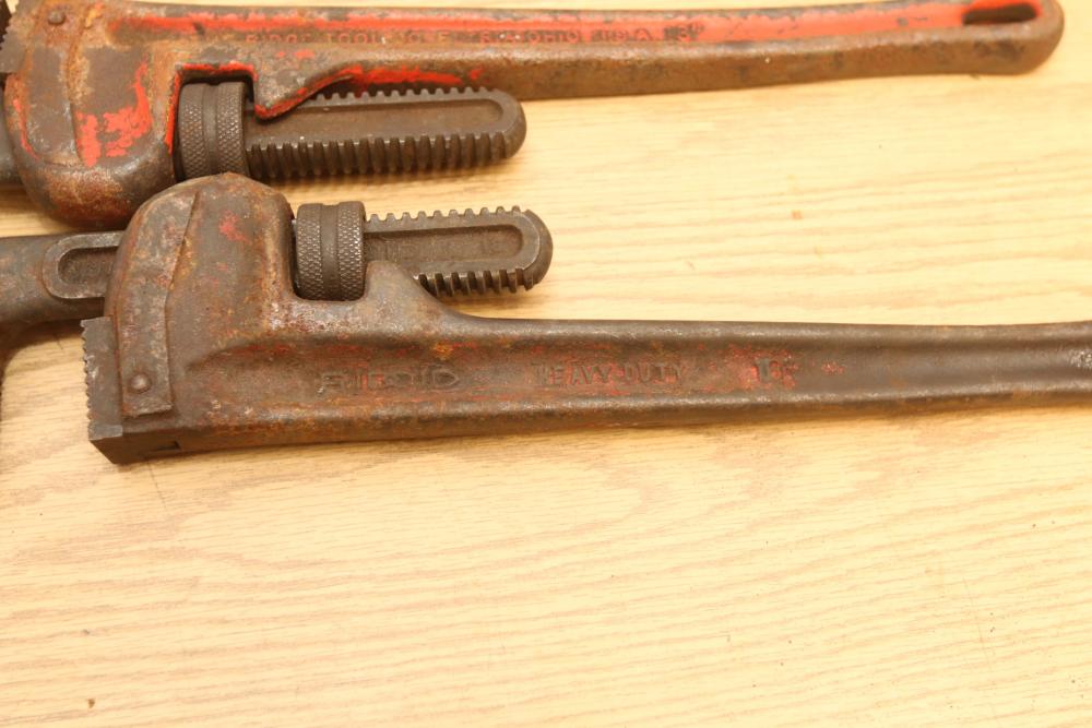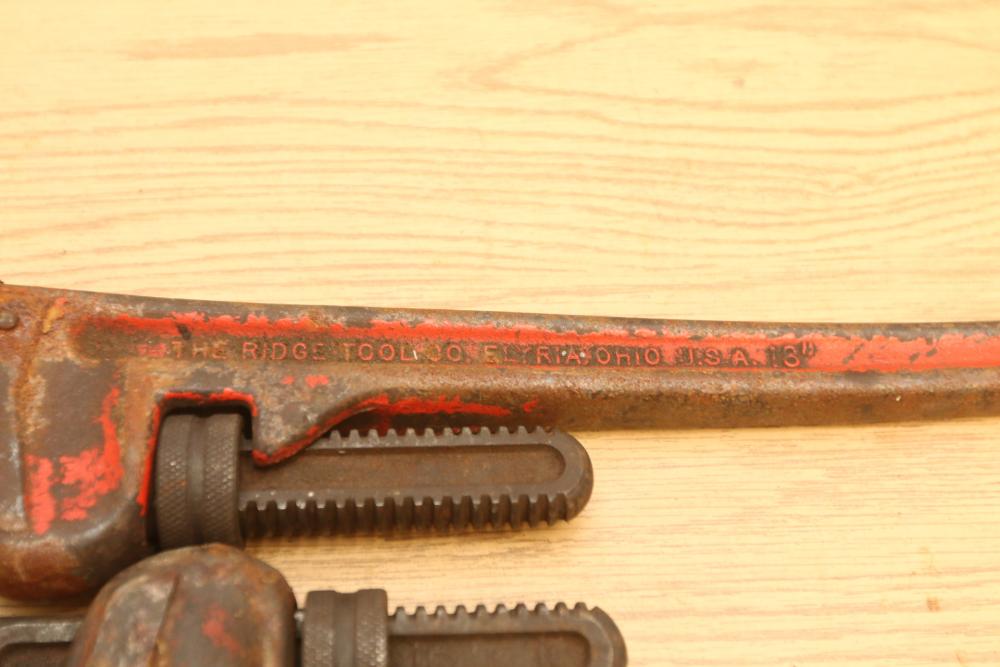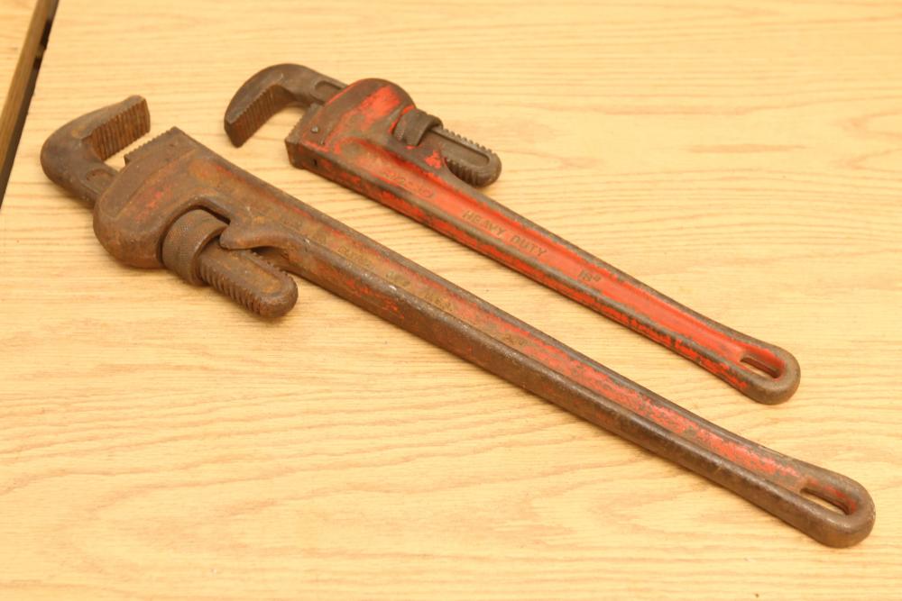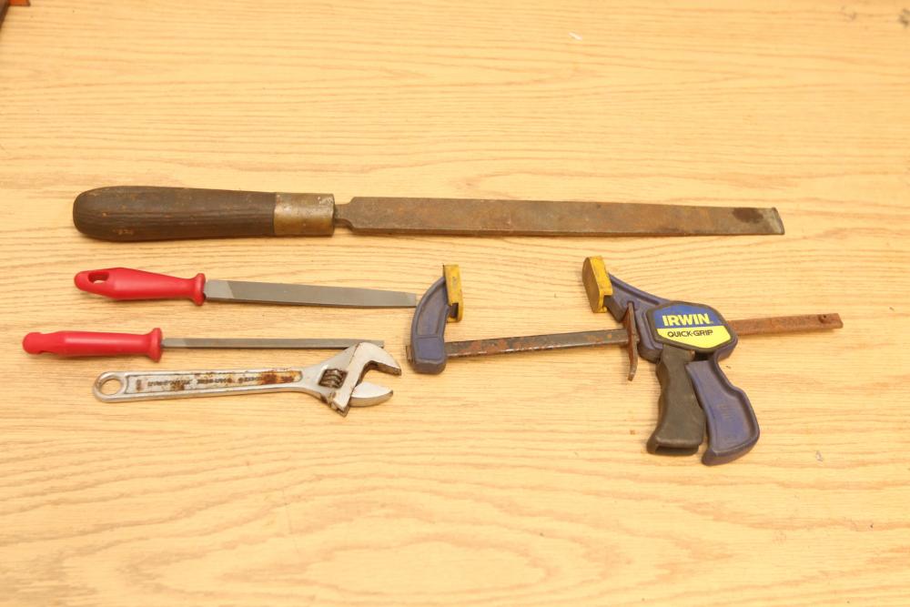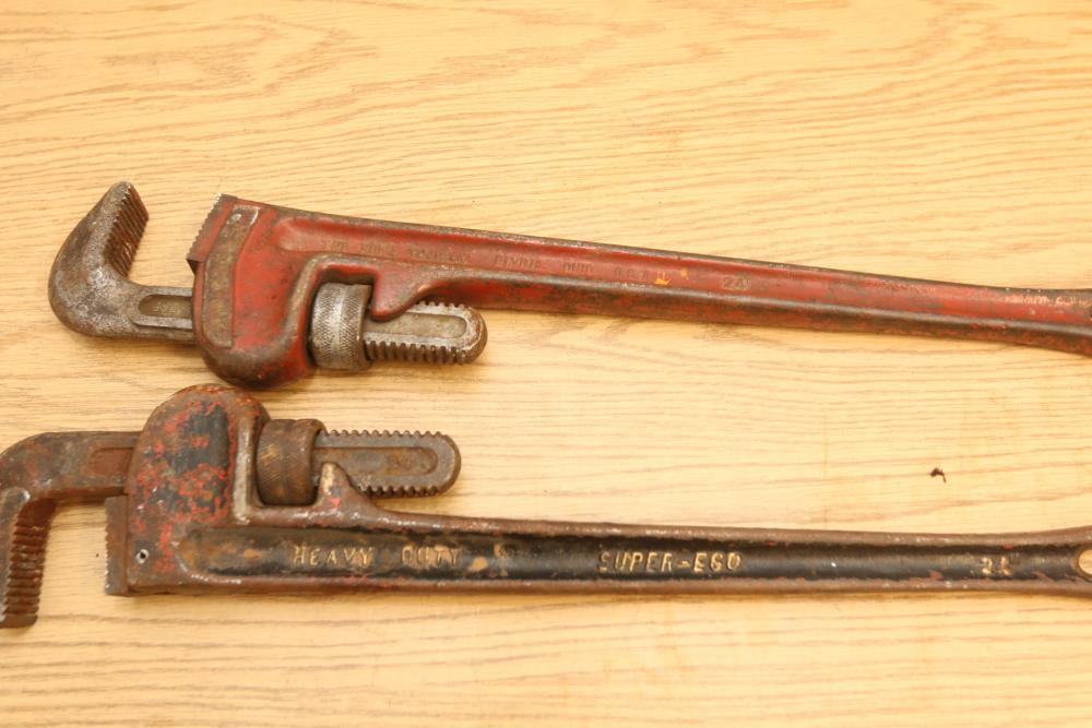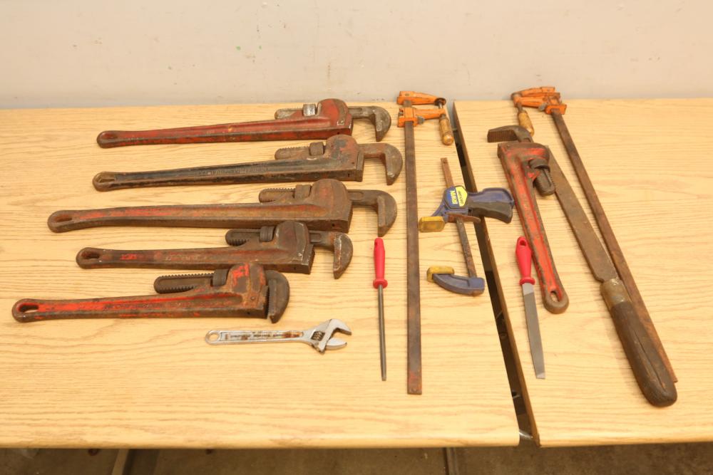 Hand tools incl four Ridgid pipe wrenches, one Super-Ego pipe wrench, files, crescent wrench, clamps, etc. Pickup only.