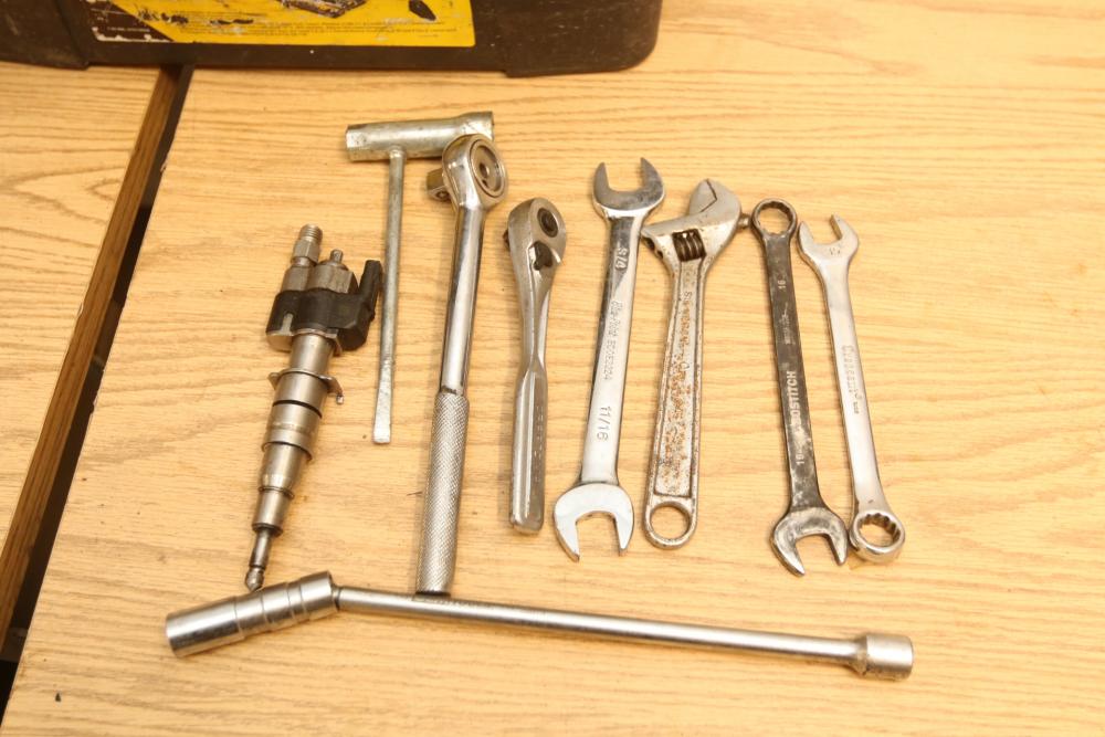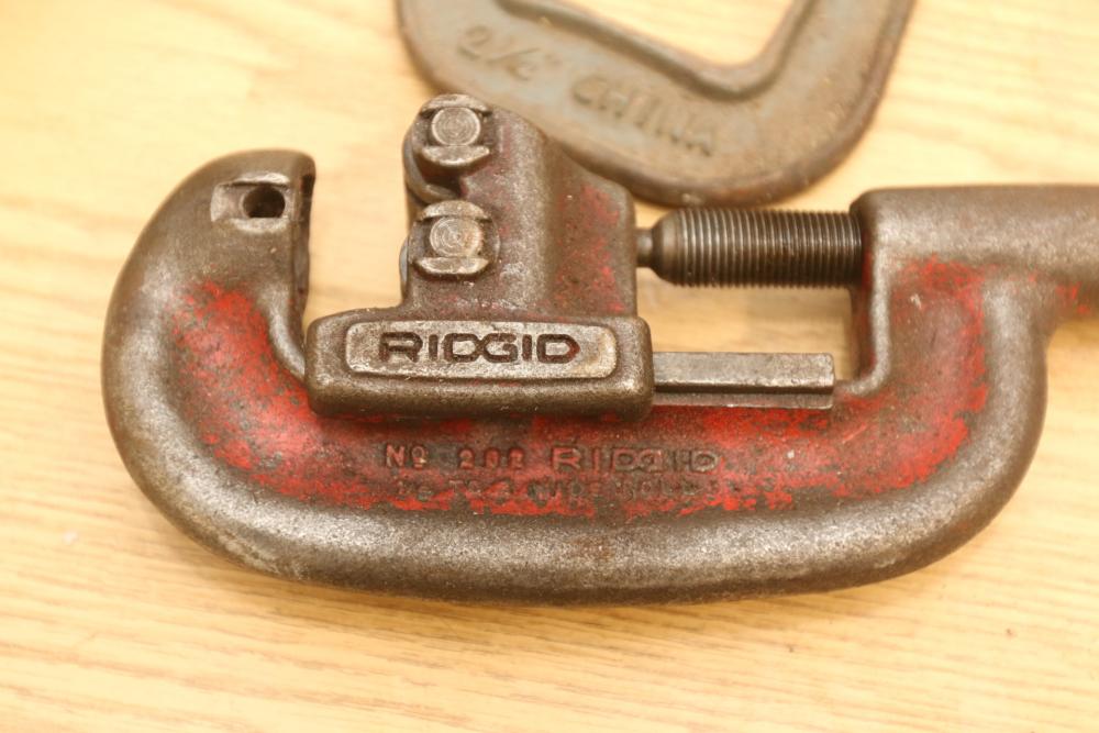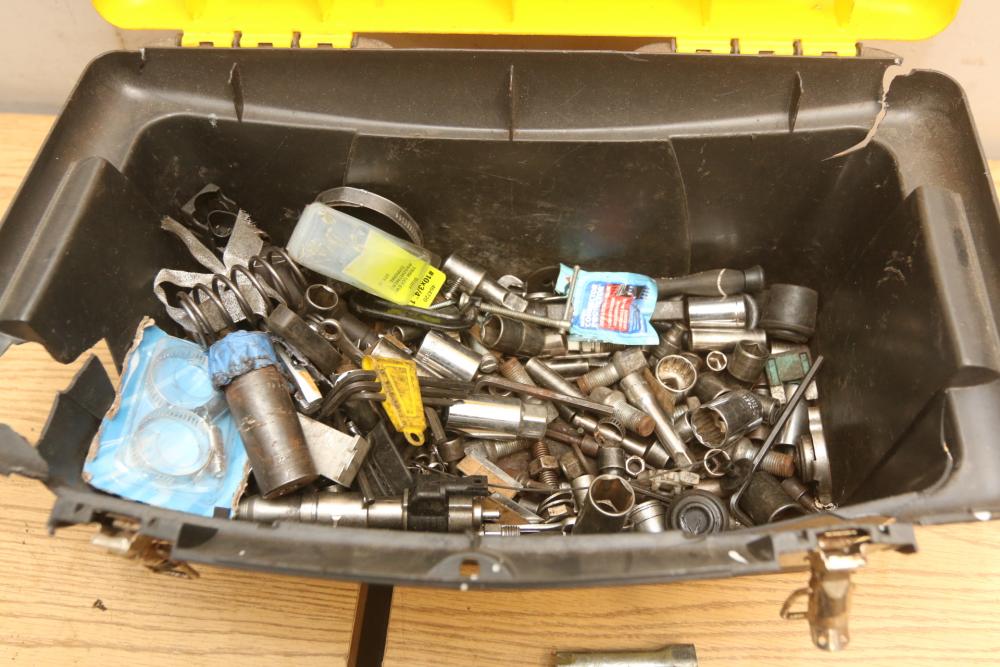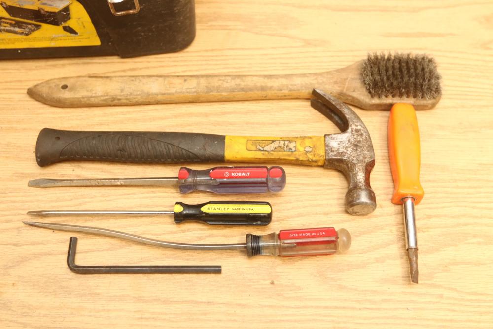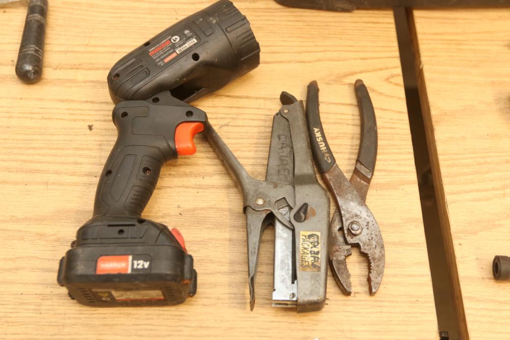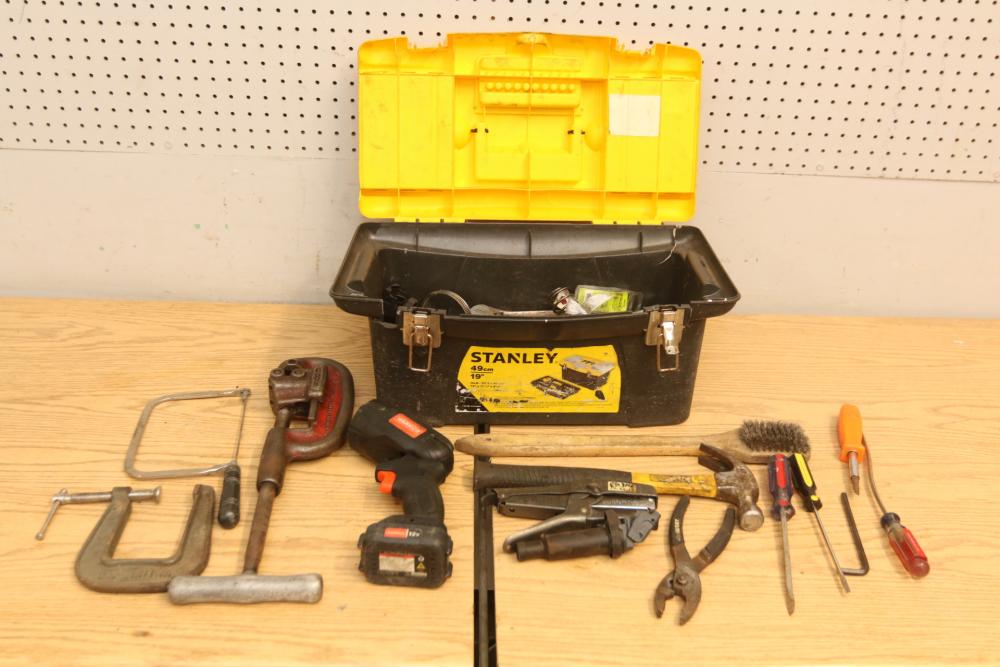 Hand tools incl hammer, clamps, coping saw, pliers, screw drivers, Stanley job site tool box, Ridgid pipe cutter No. 202, stapler, sockets, wrenches, etc. Pickup only.