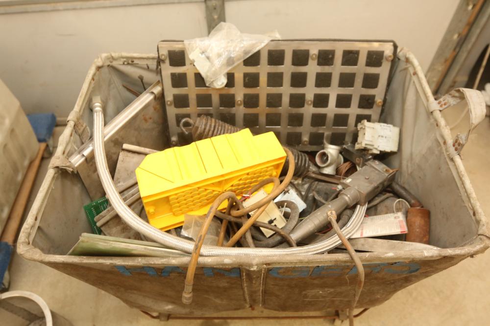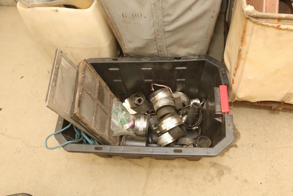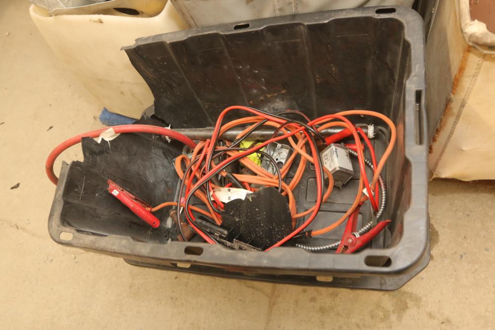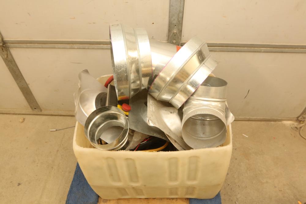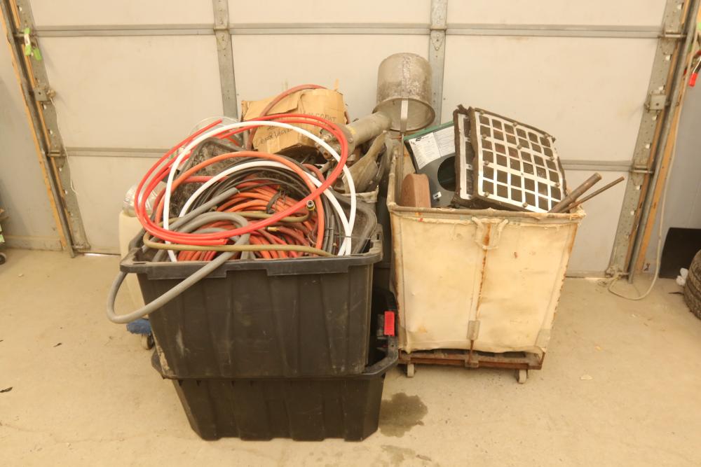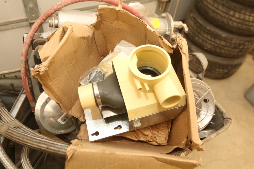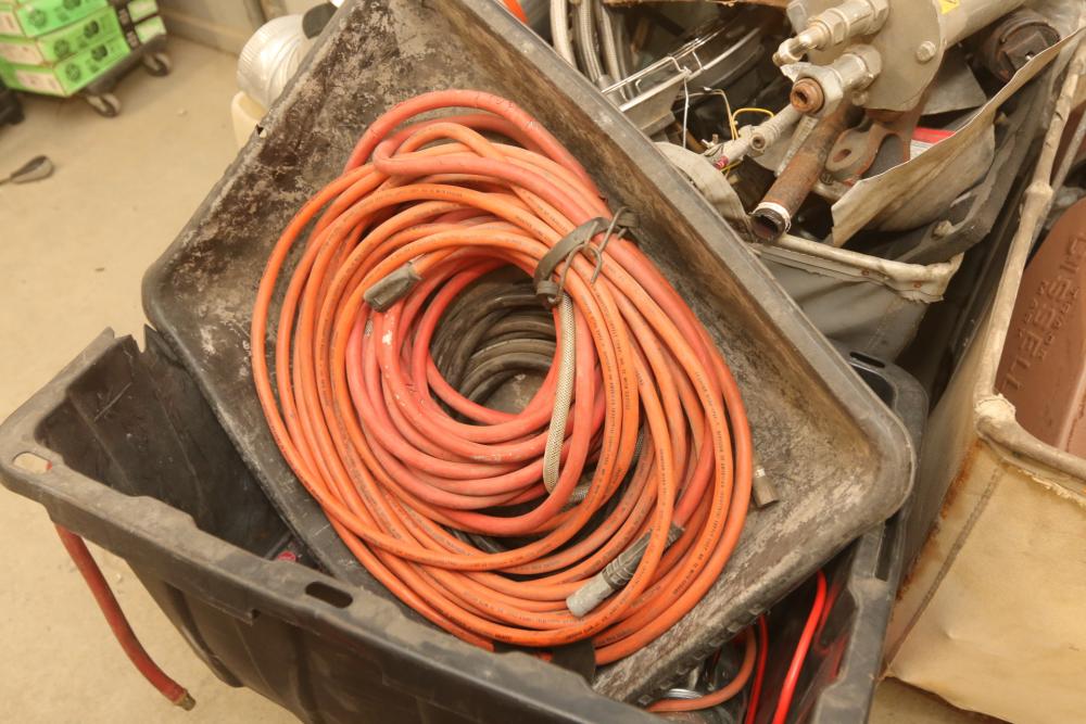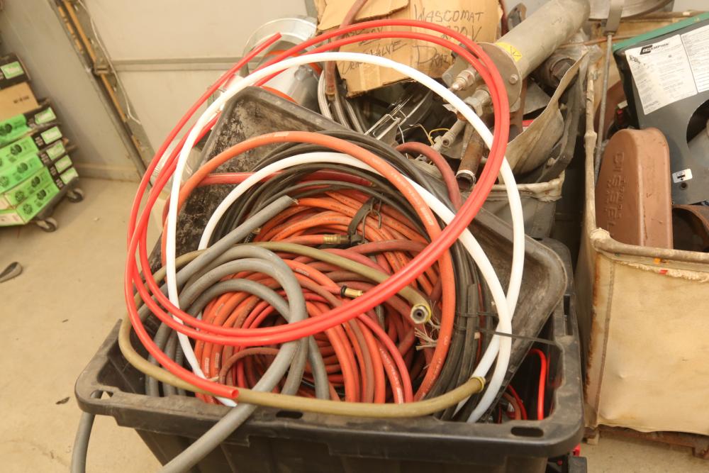 Large grouping of automotive parts and tools incl air hoses, couplers, jumper cables, filters, duct work, pipe fittings, springs, etc. Pickup only.