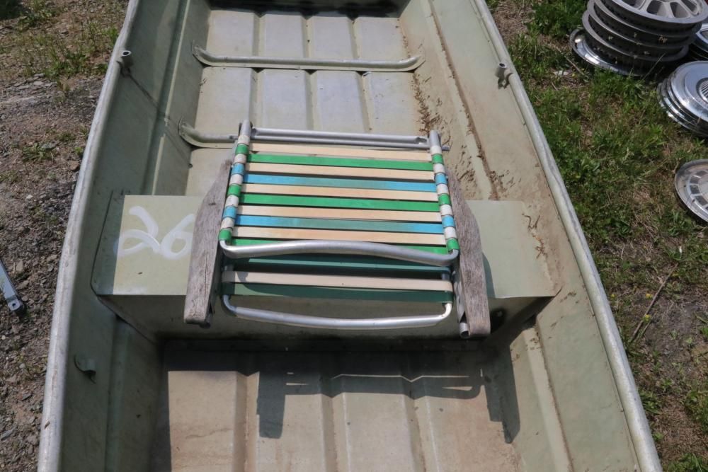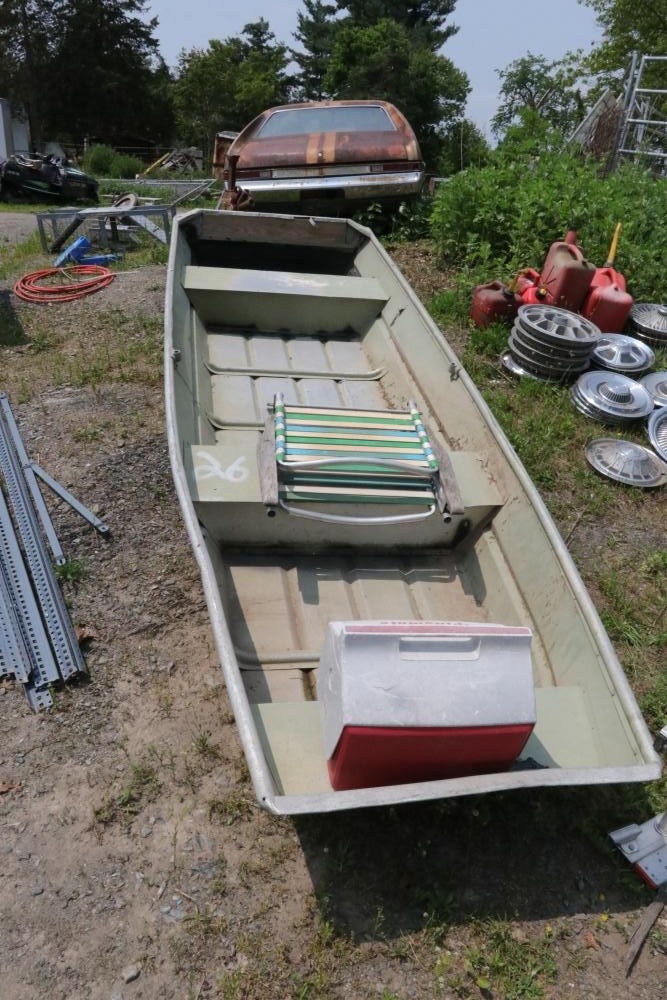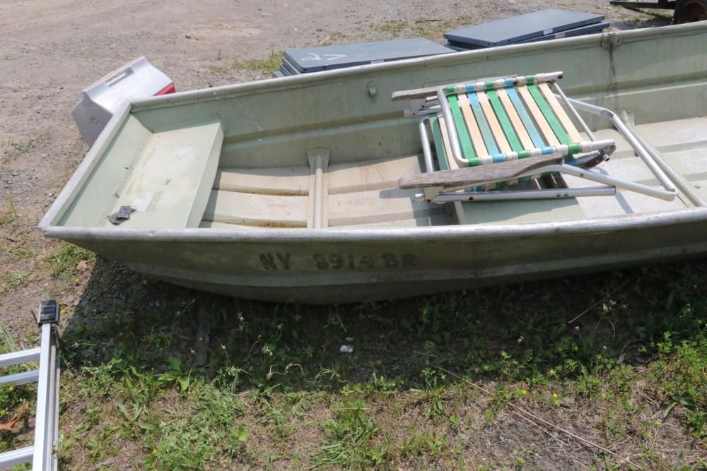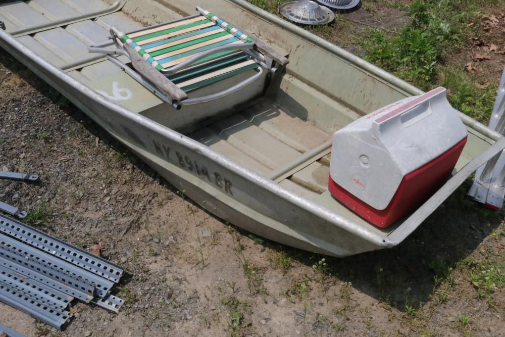 NY8914 row boat with playmate igloo case and beach chair included, appears to seat 2-3 occupants.