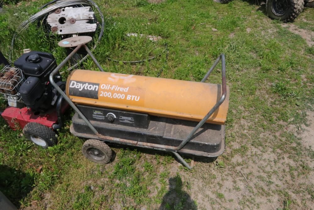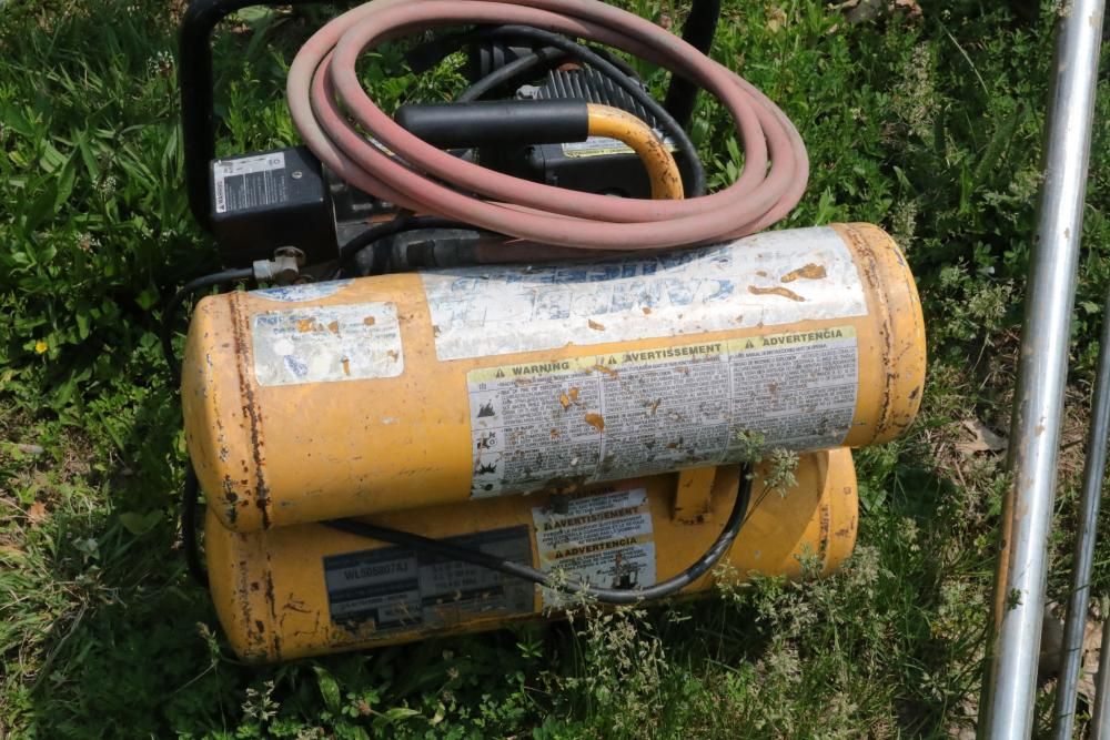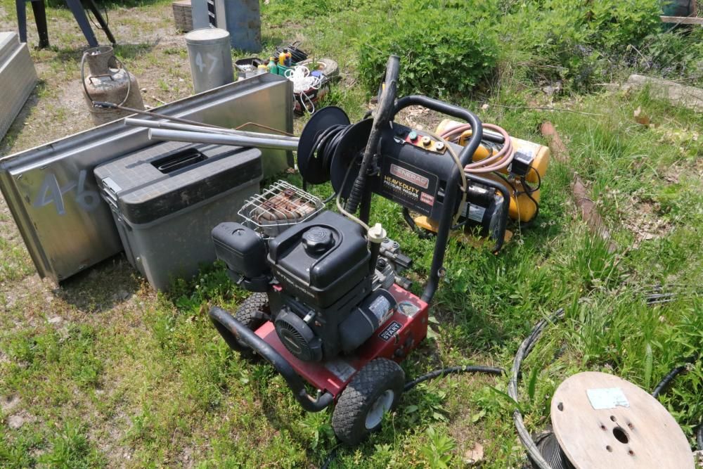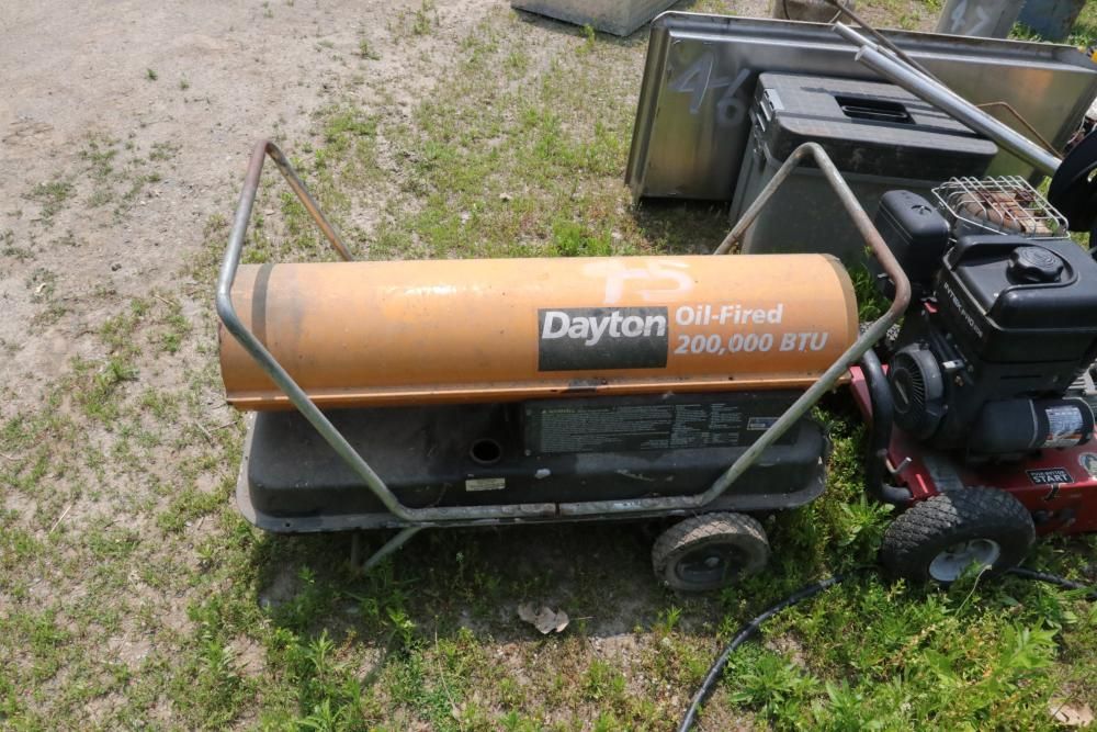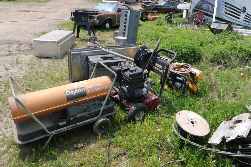 One Dayton oil-fired 200,000 BTU heater, one heavy duty pressure washer with 3.0 GPM and 2500 PSI, and air compressor with model #: WL505807AJ.