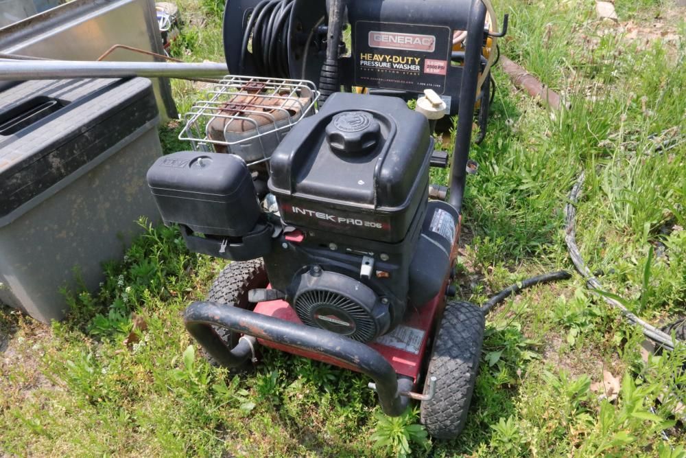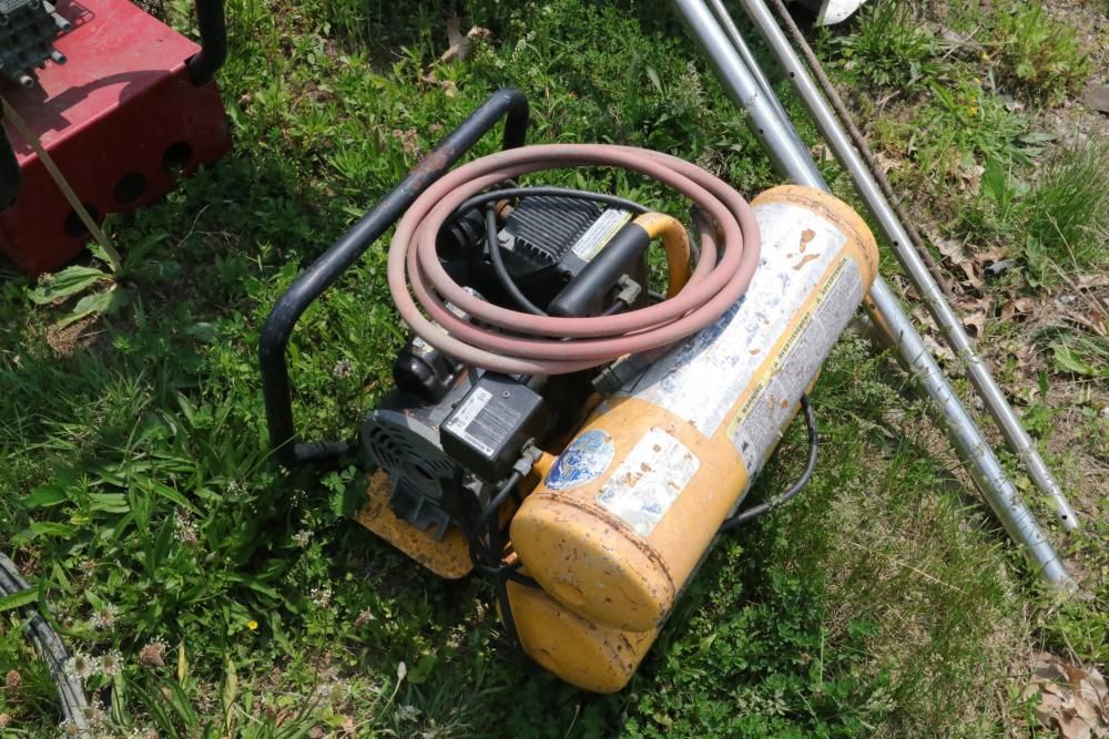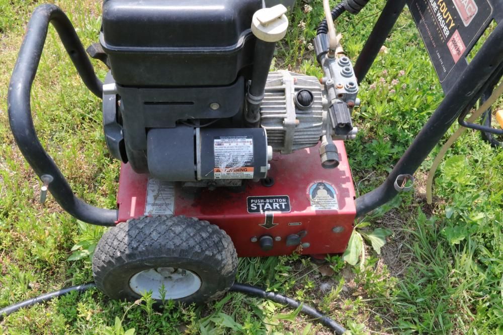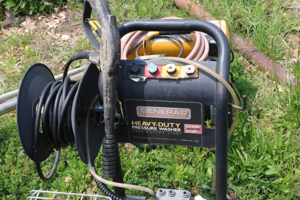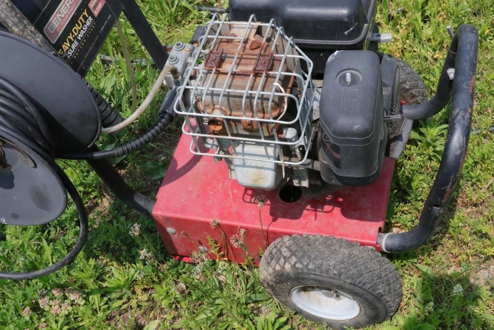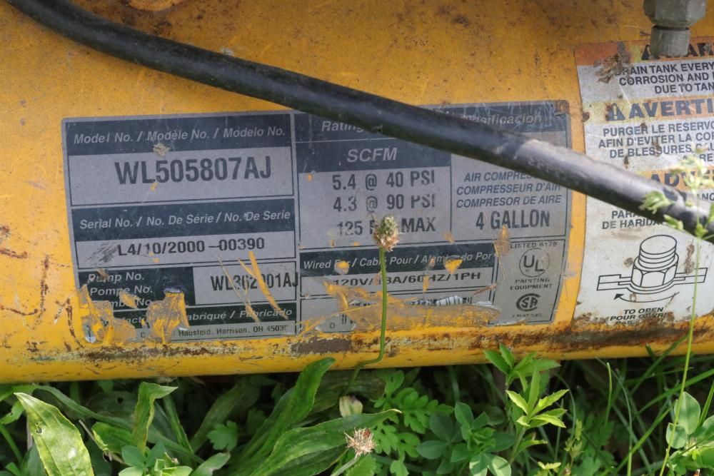 One Dayton oil-fired 200,000 BTU heater, one heavy duty pressure washer with 3.0 GPM and 2500 PSI, and air compressor with model #: WL505807AJ.