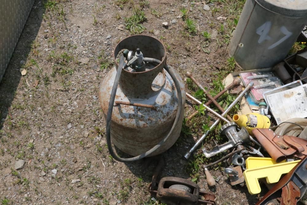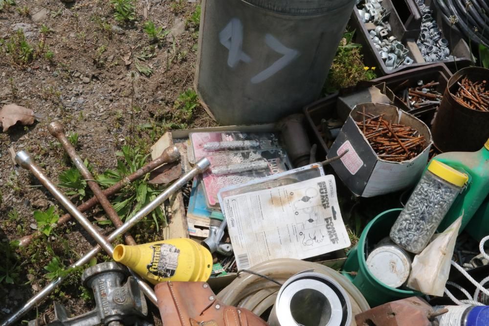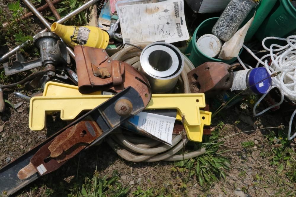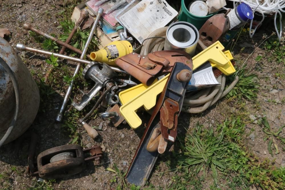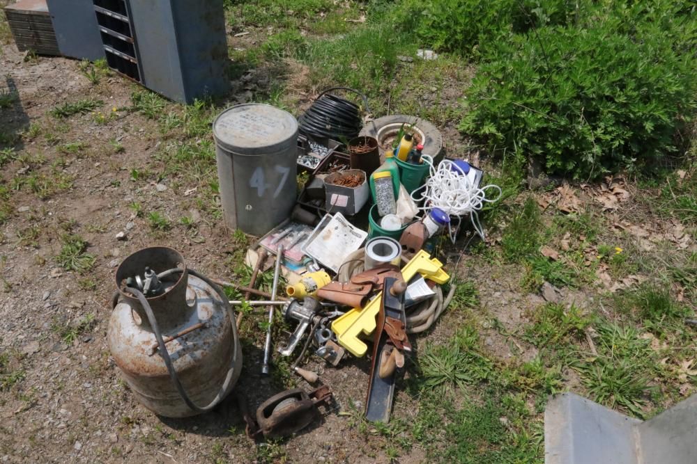Large assortment of tools and hardware including nails, propane tank, tire irons, tire, wire, rope, etc.