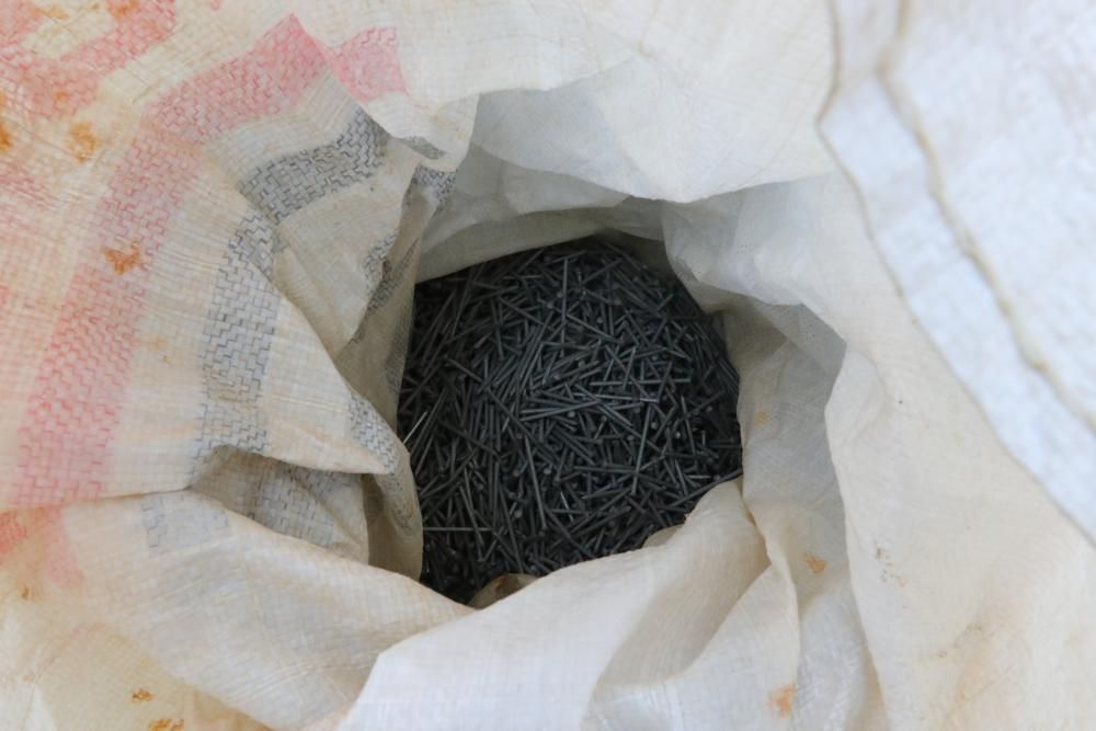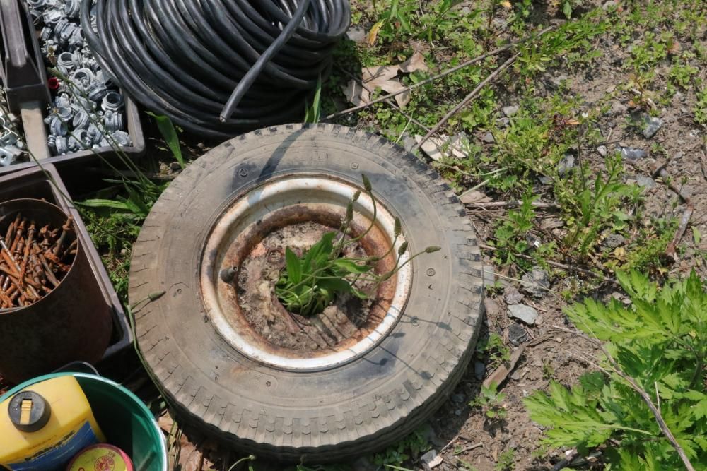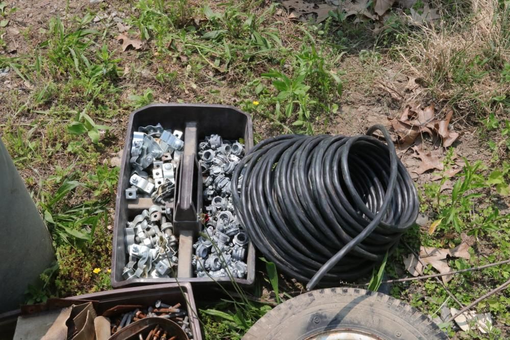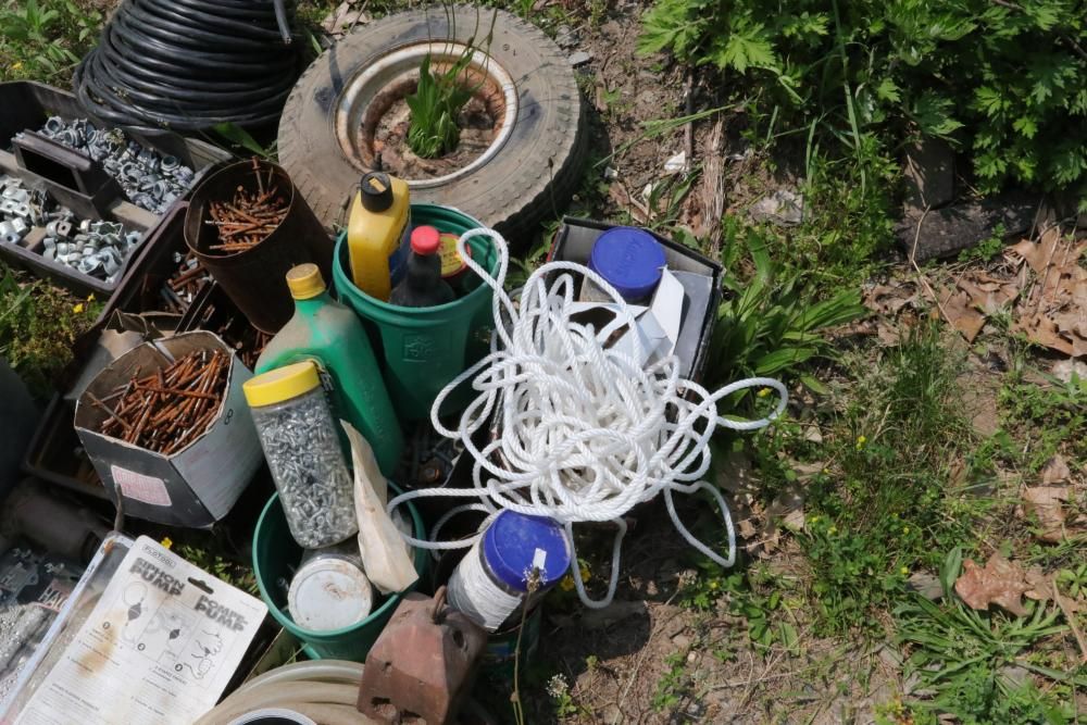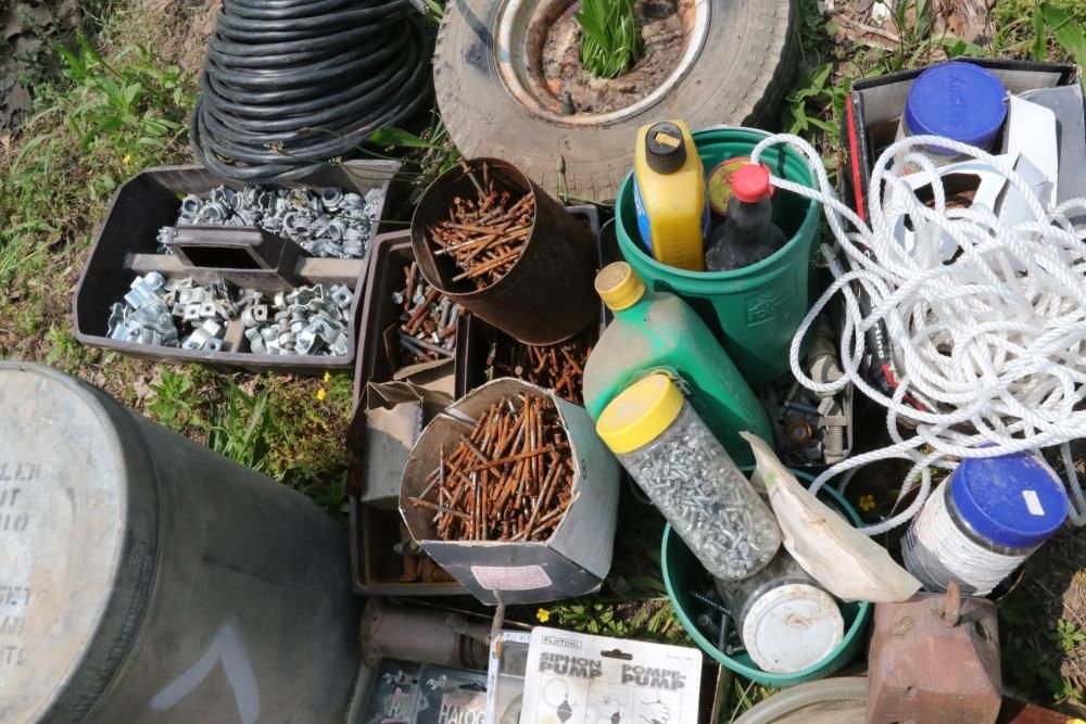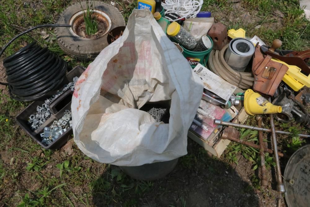 Large assortment of tools and hardware including nails, propane tank, tire irons, tire, wire, rope, etc.