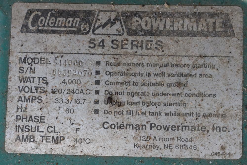 Coleman powermate 54 series model number 544000, watts: 4,000, with Briggs & Stratton 8 HP engine.