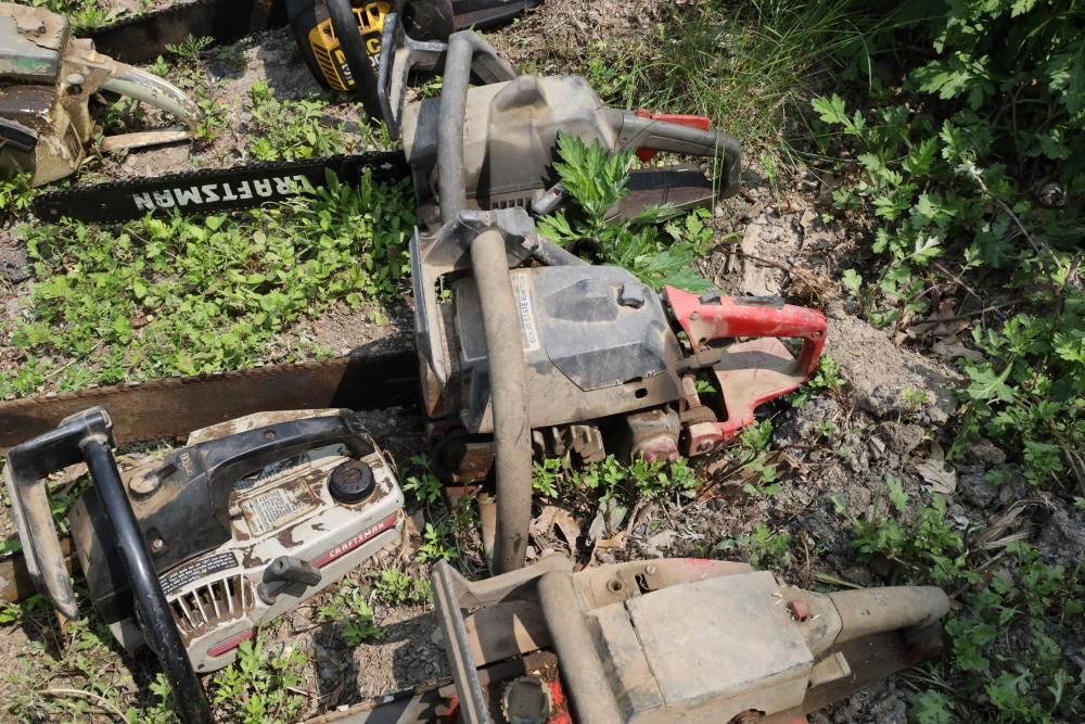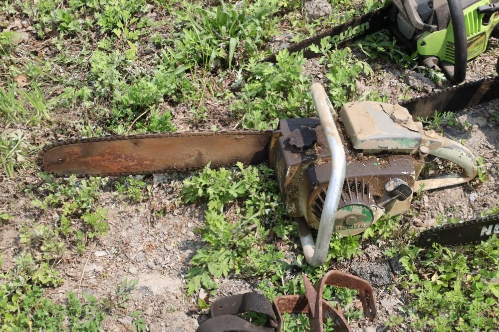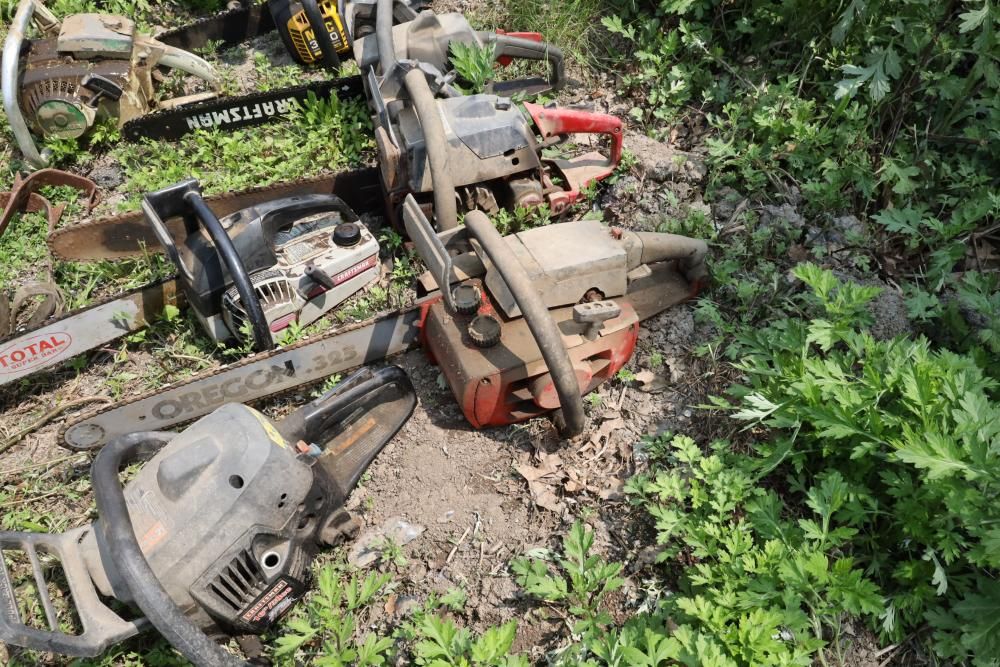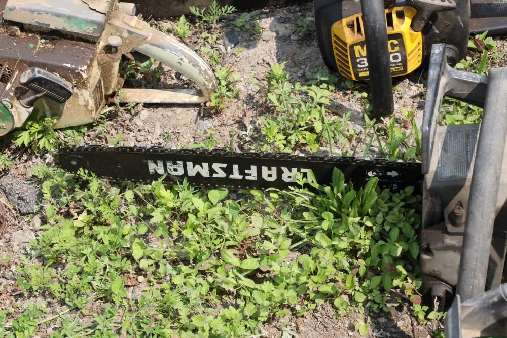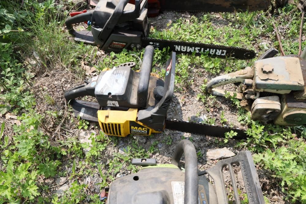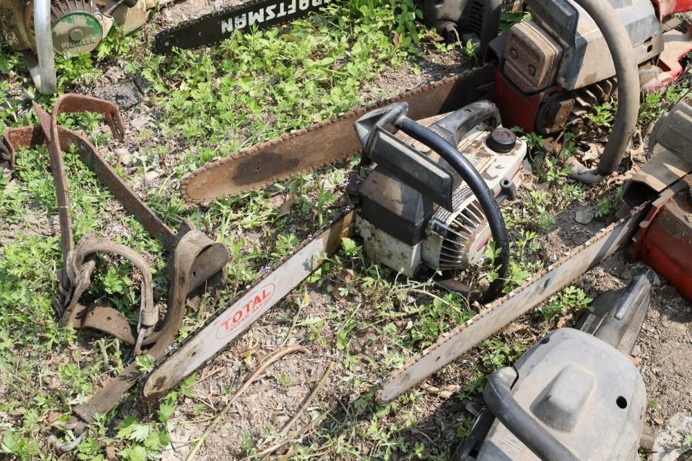Eight chainsaws including Craftsman, Pioneer, McCulloch MAC 3200, Poulan model P3314, etc., also including two tree climbers.