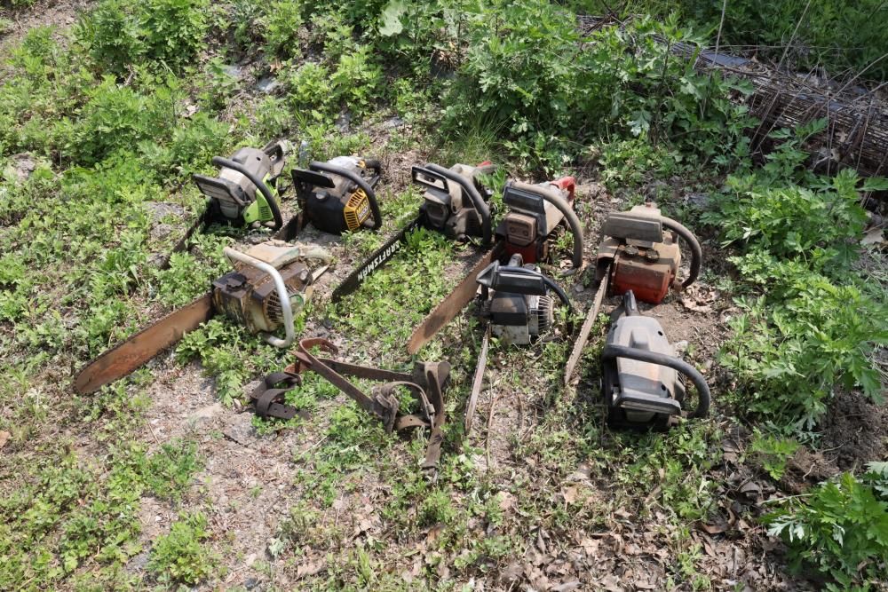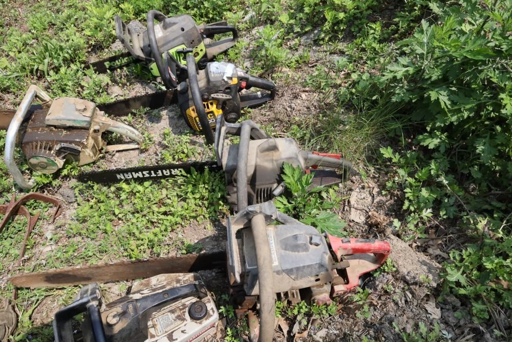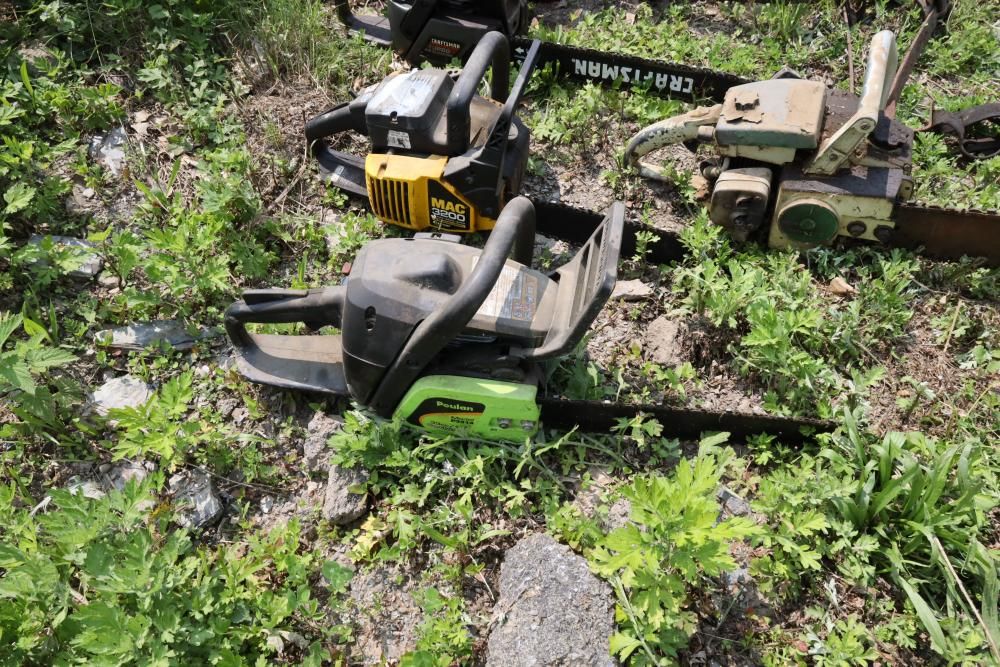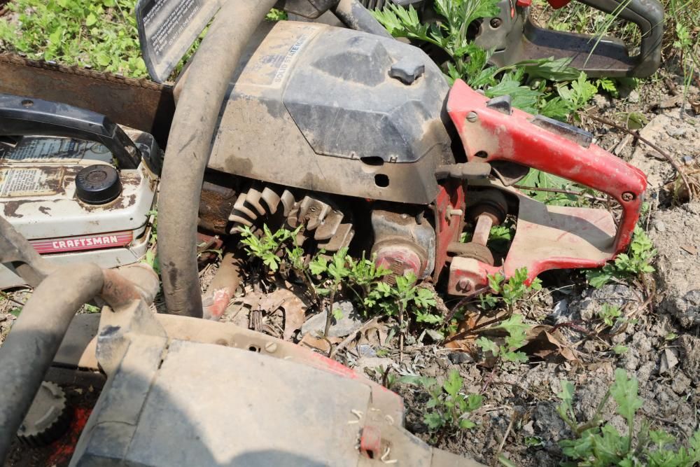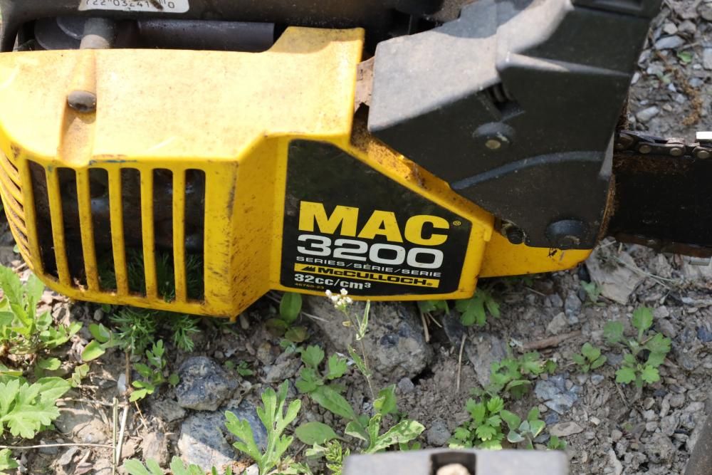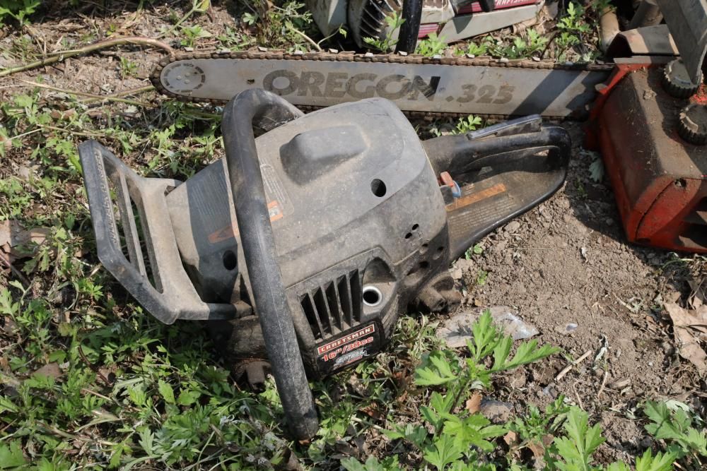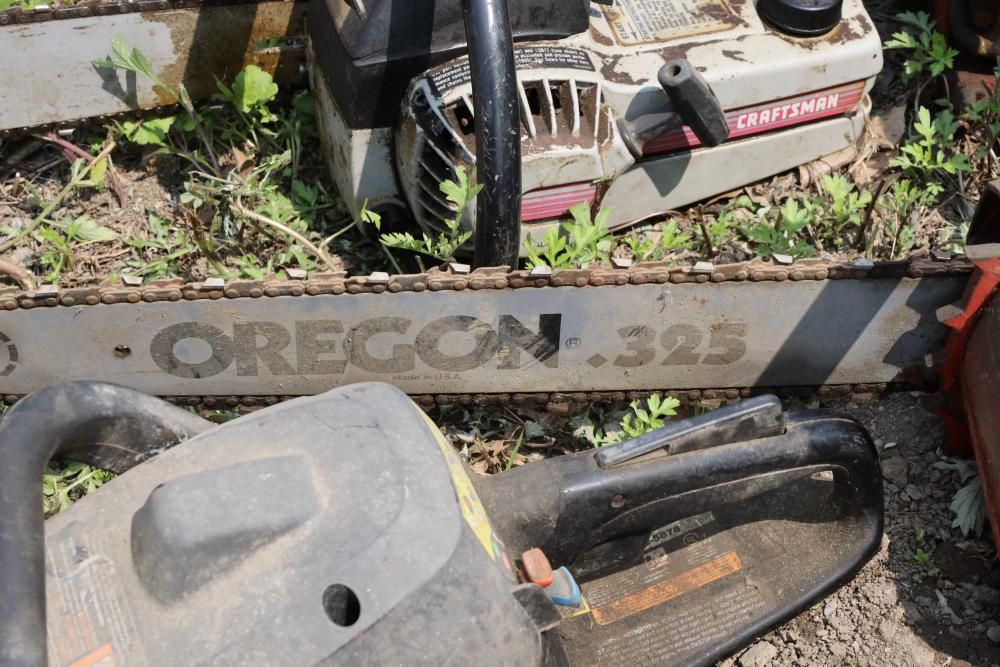 Eight chainsaws including Craftsman, Pioneer, McCulloch MAC 3200, Poulan model P3314, etc., also including two tree climbers.