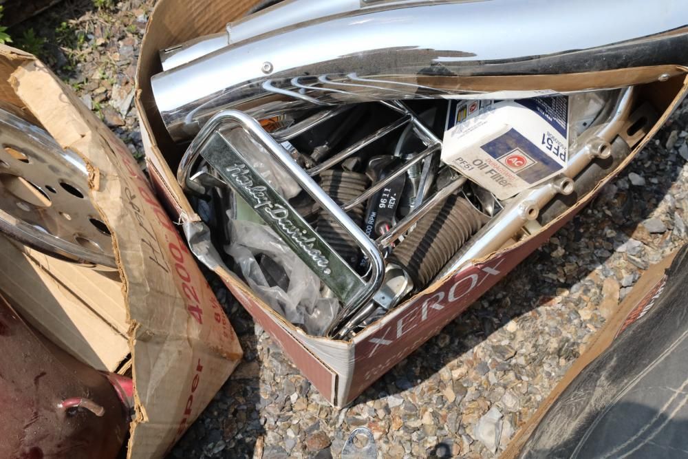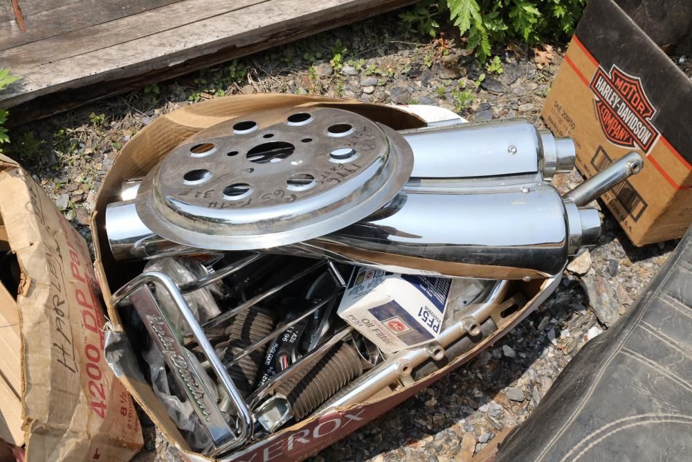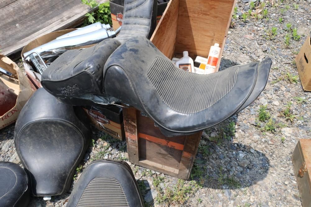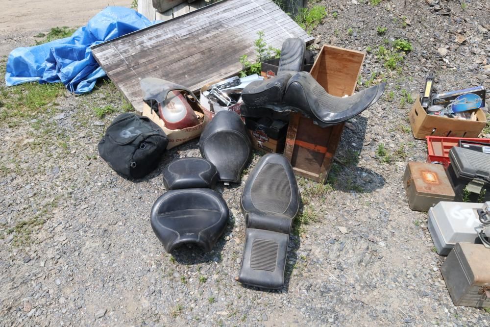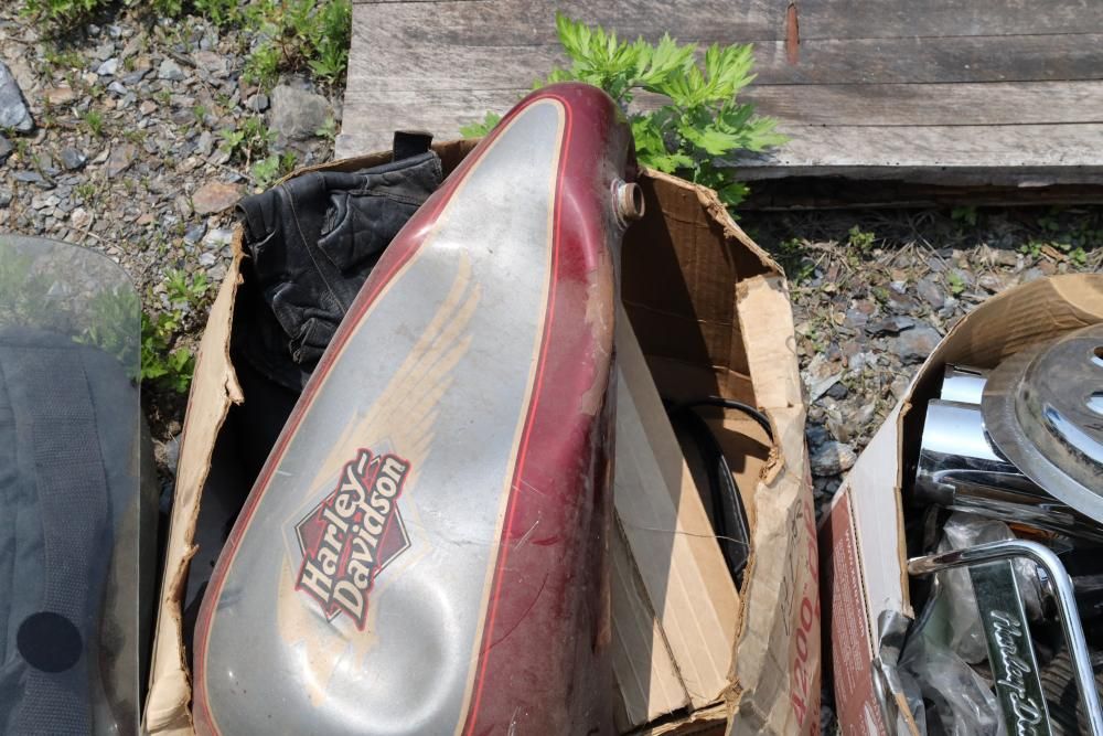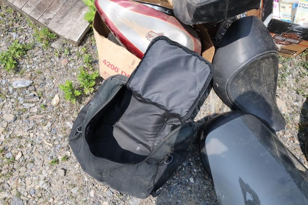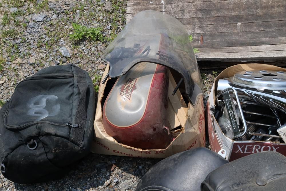 Harley Davidson part including sissy bar saddle bag, seats, gas tanks, exhaust, mirrors, oil, windshield and various other items.
