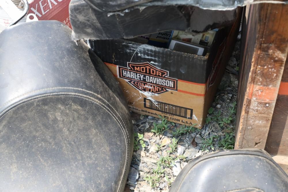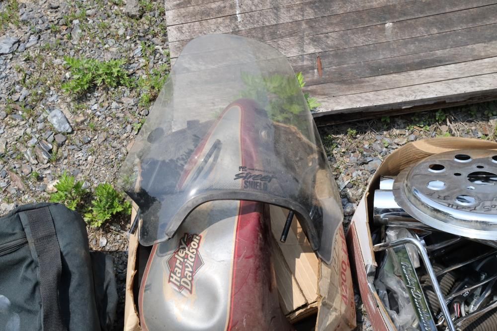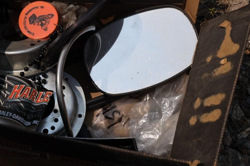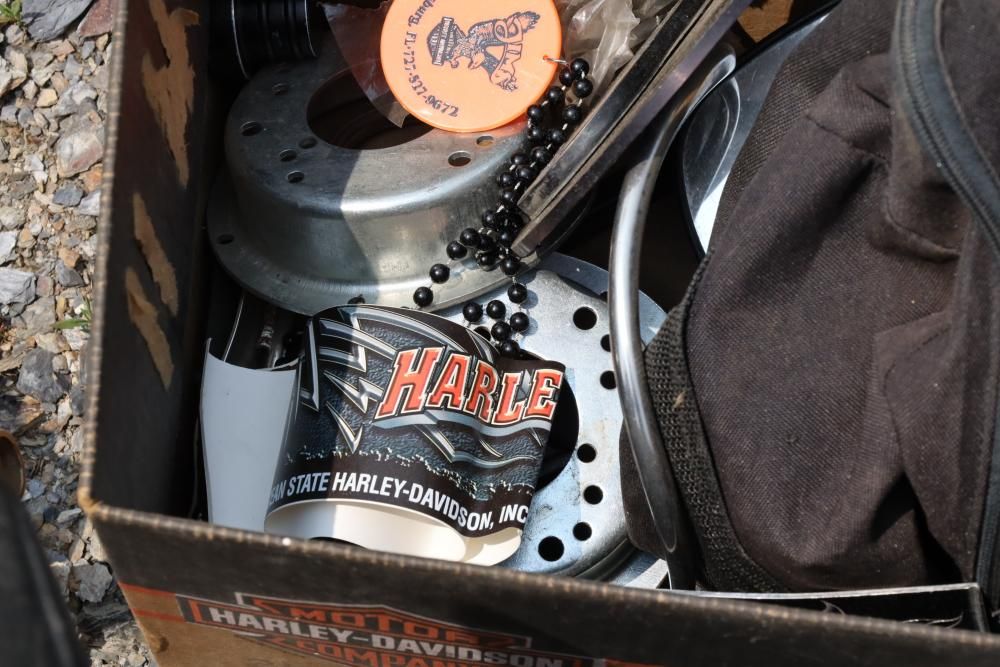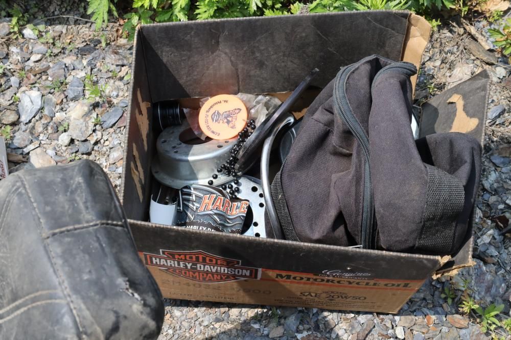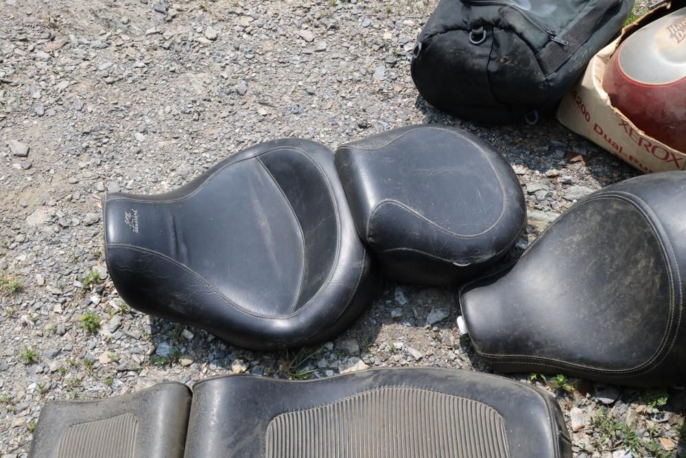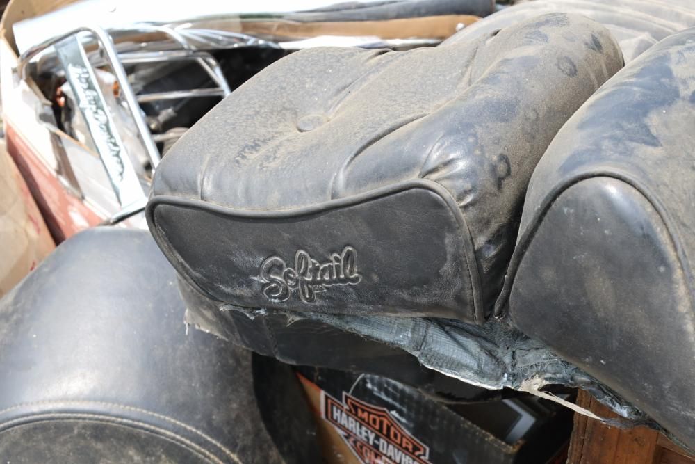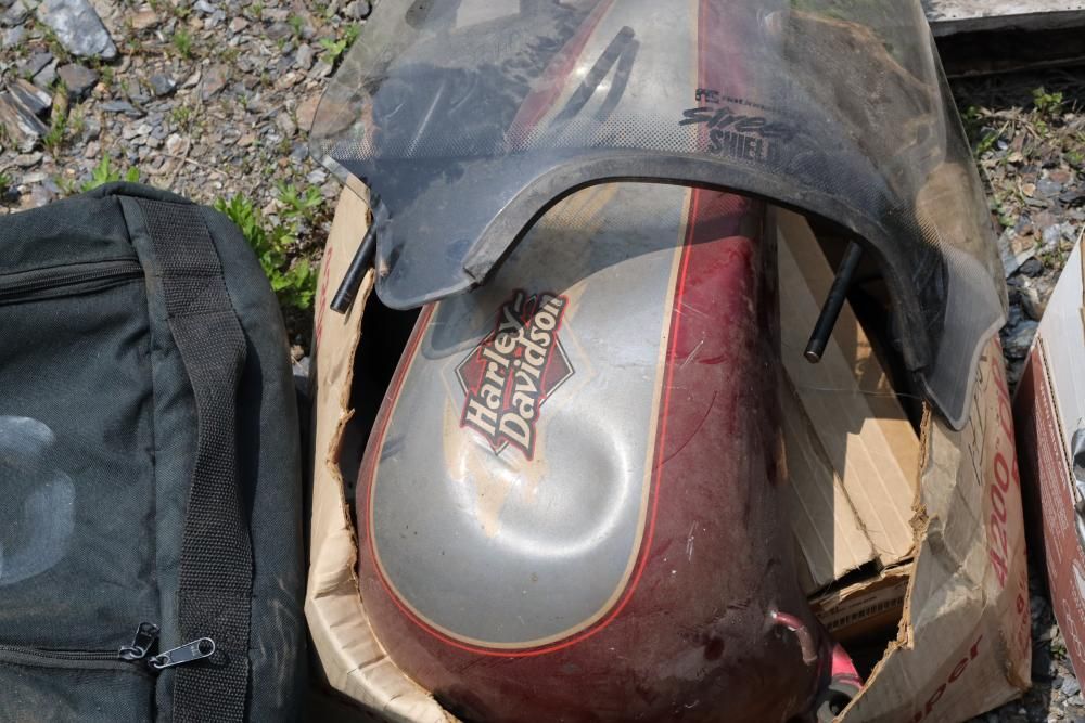 Harley Davidson part including sissy bar saddle bag, seats, gas tanks, exhaust, mirrors, oil, windshield and various other items.