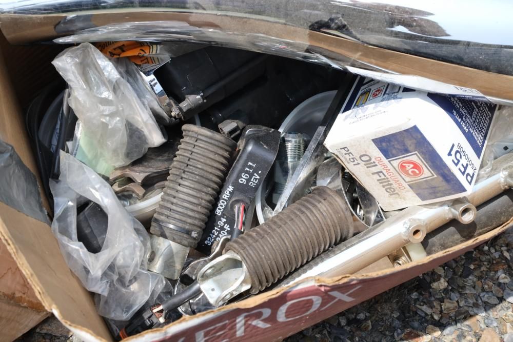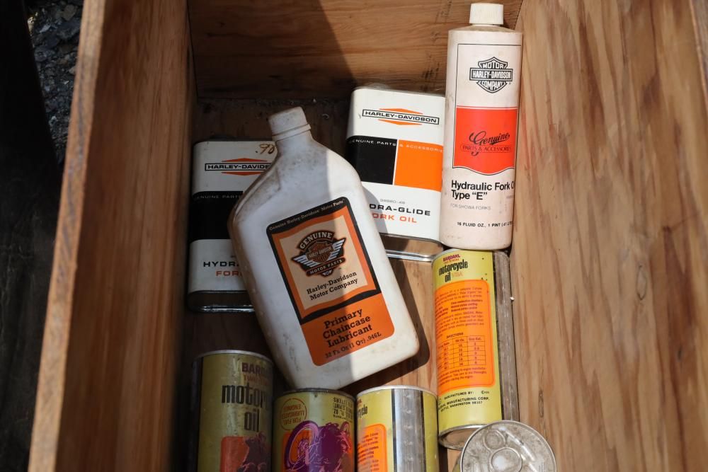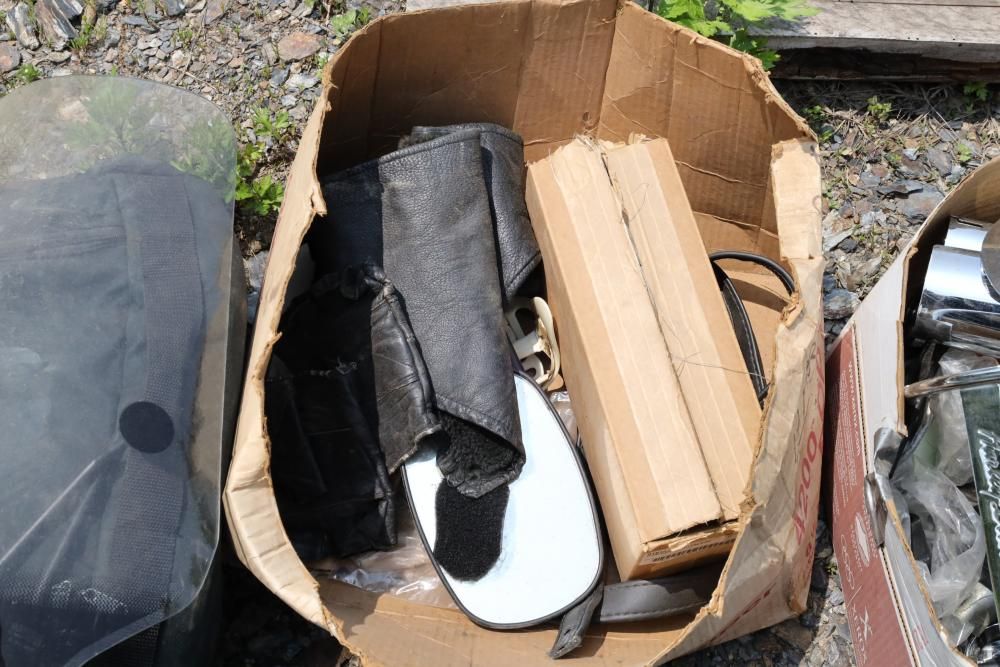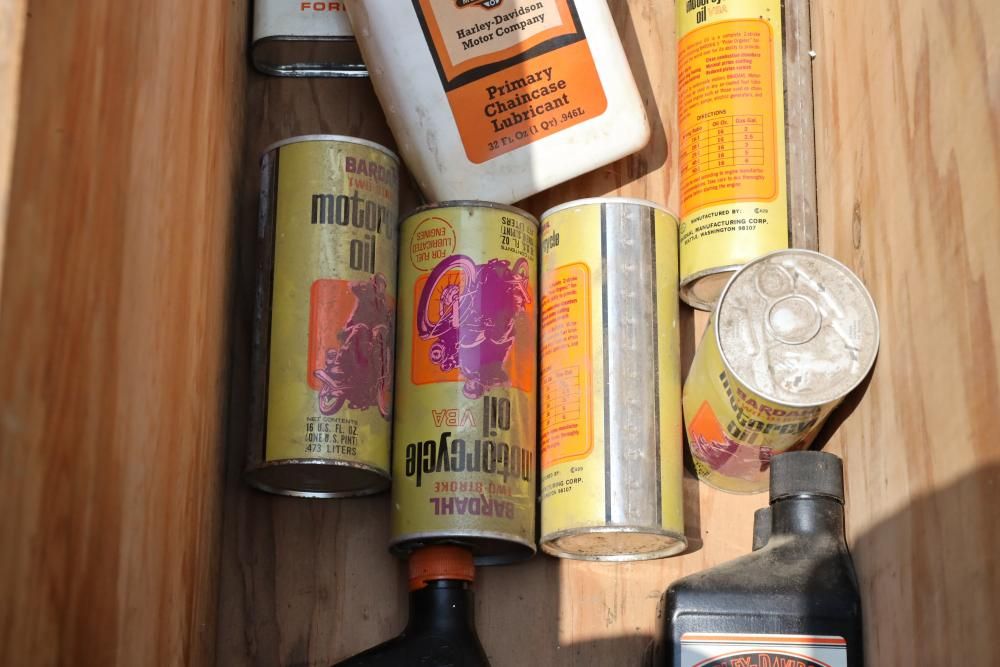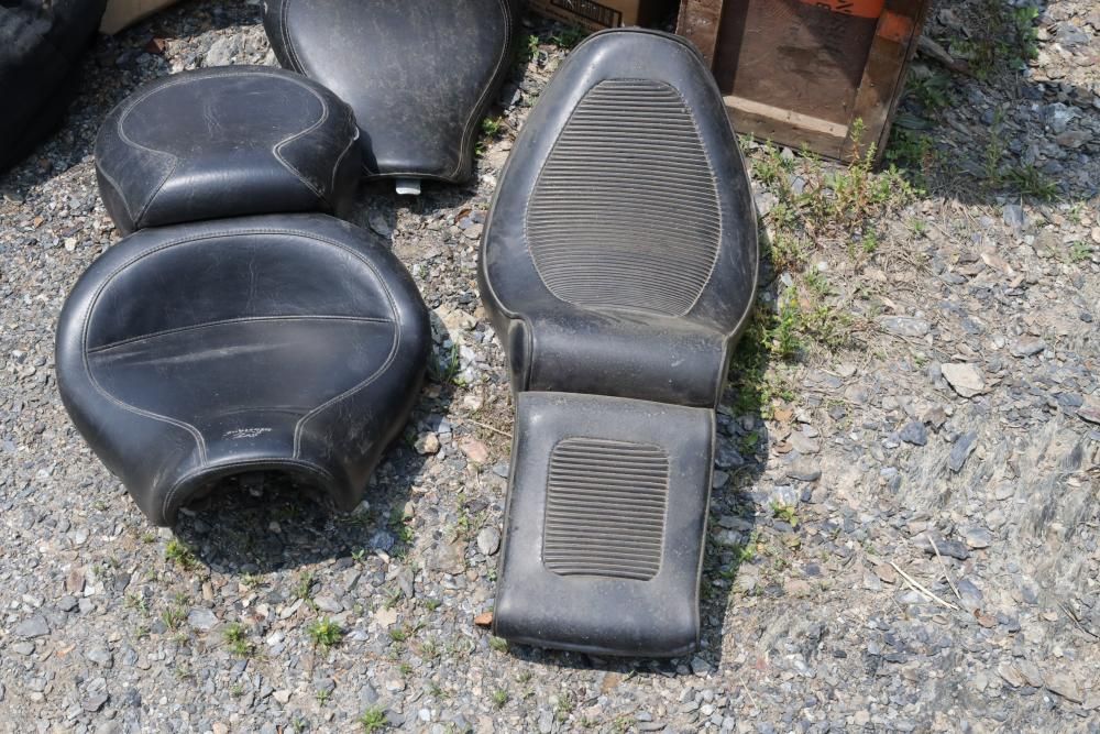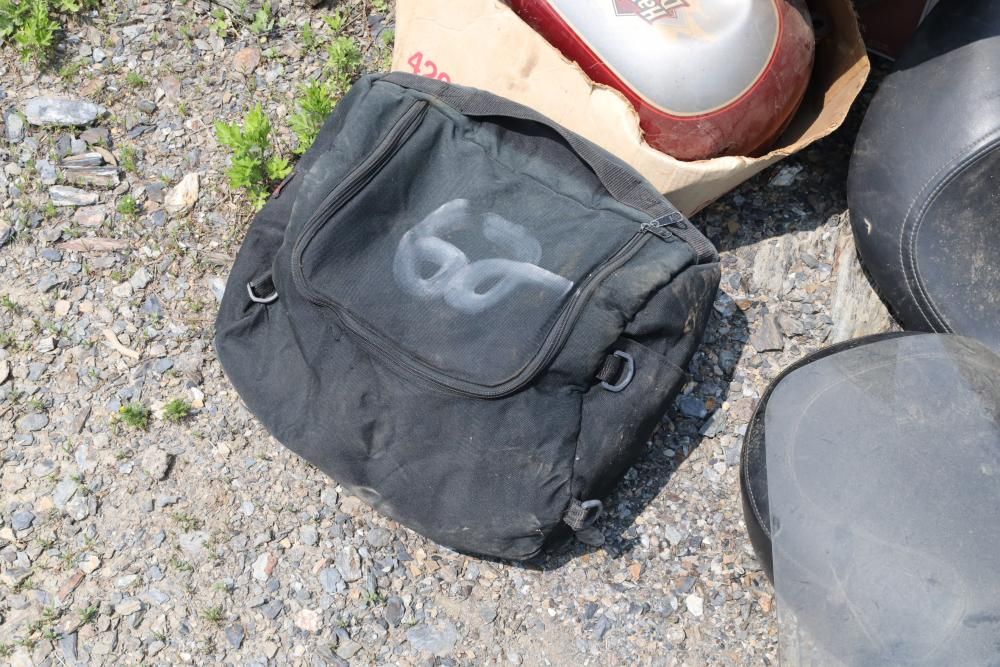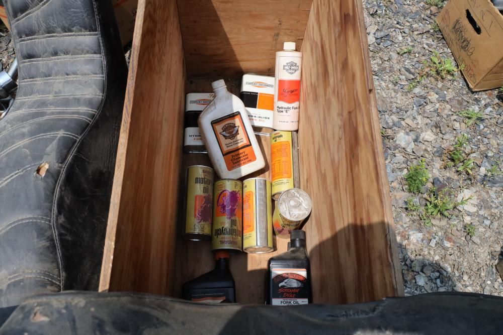 Harley Davidson part including sissy bar saddle bag, seats, gas tanks, exhaust, mirrors, oil, windshield and various other items.