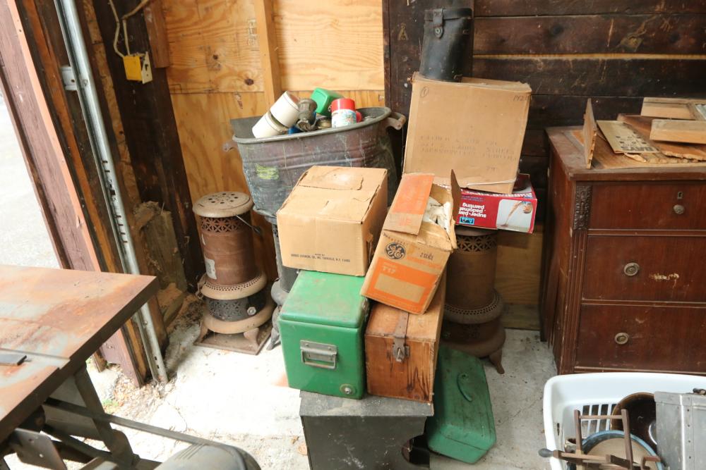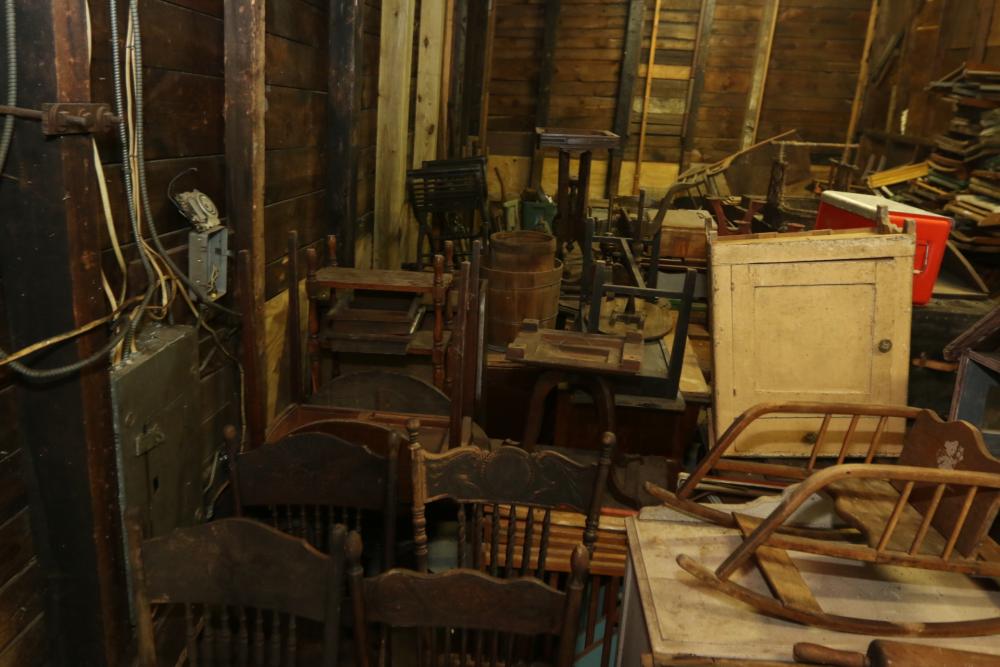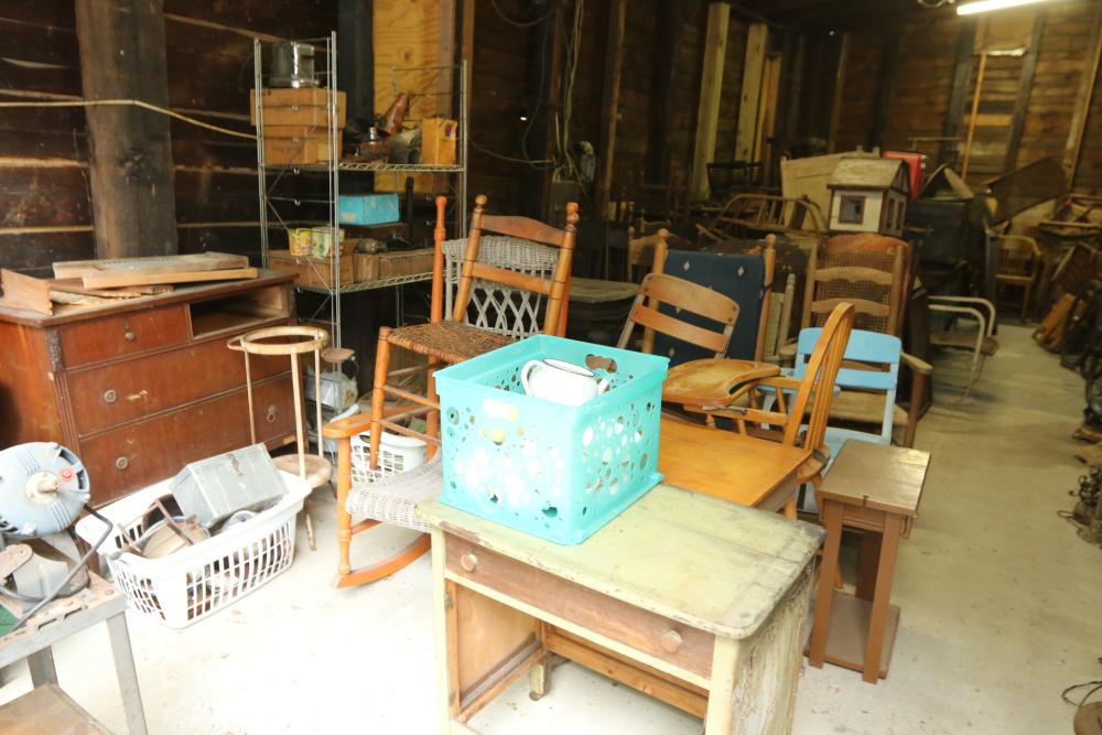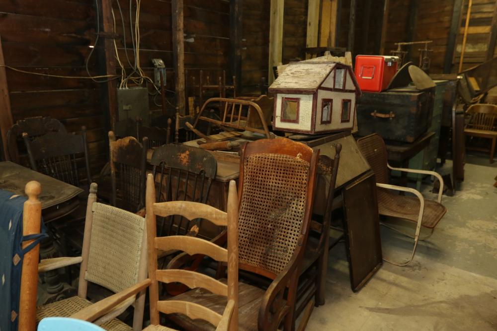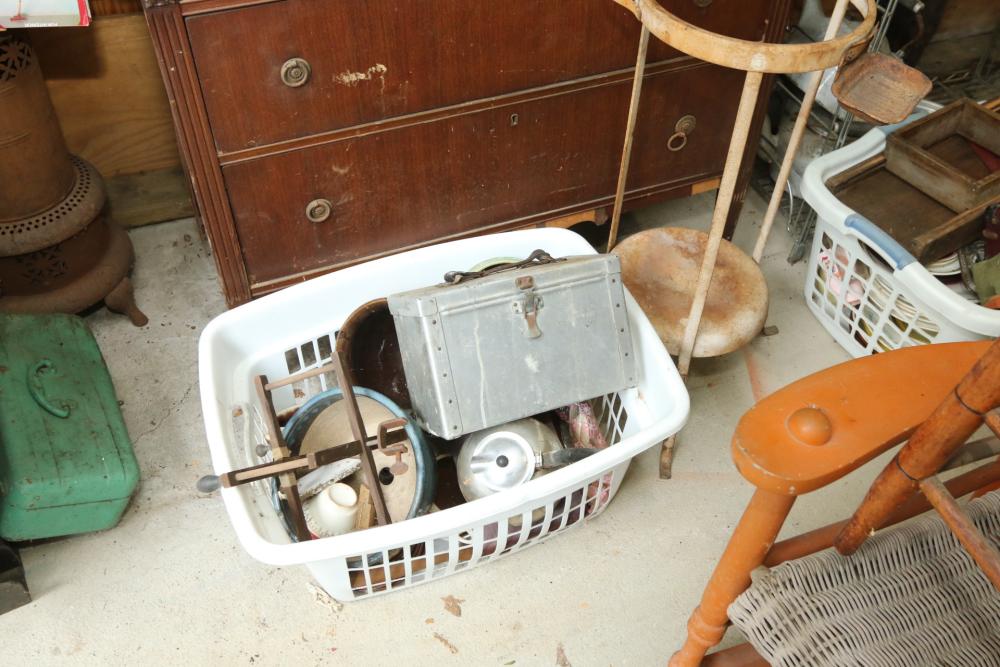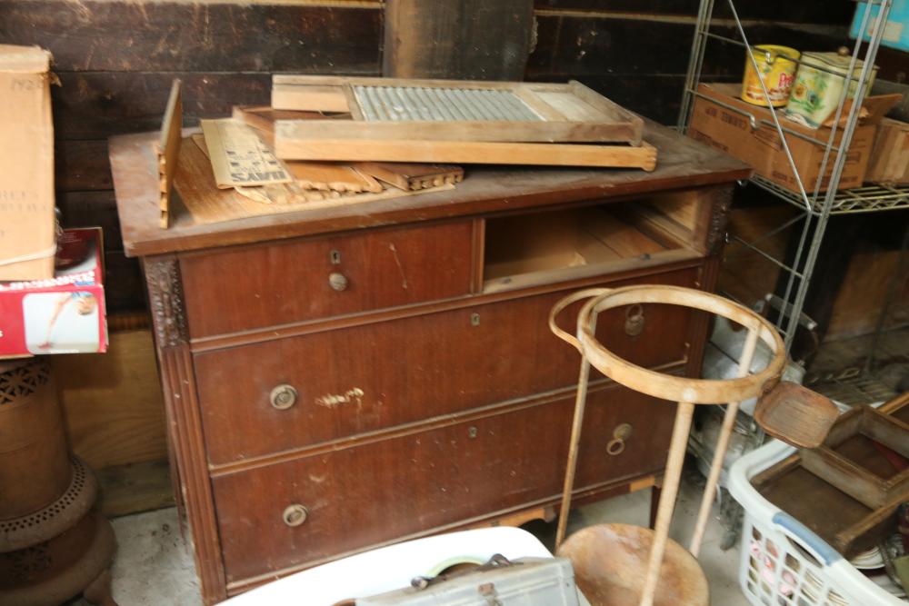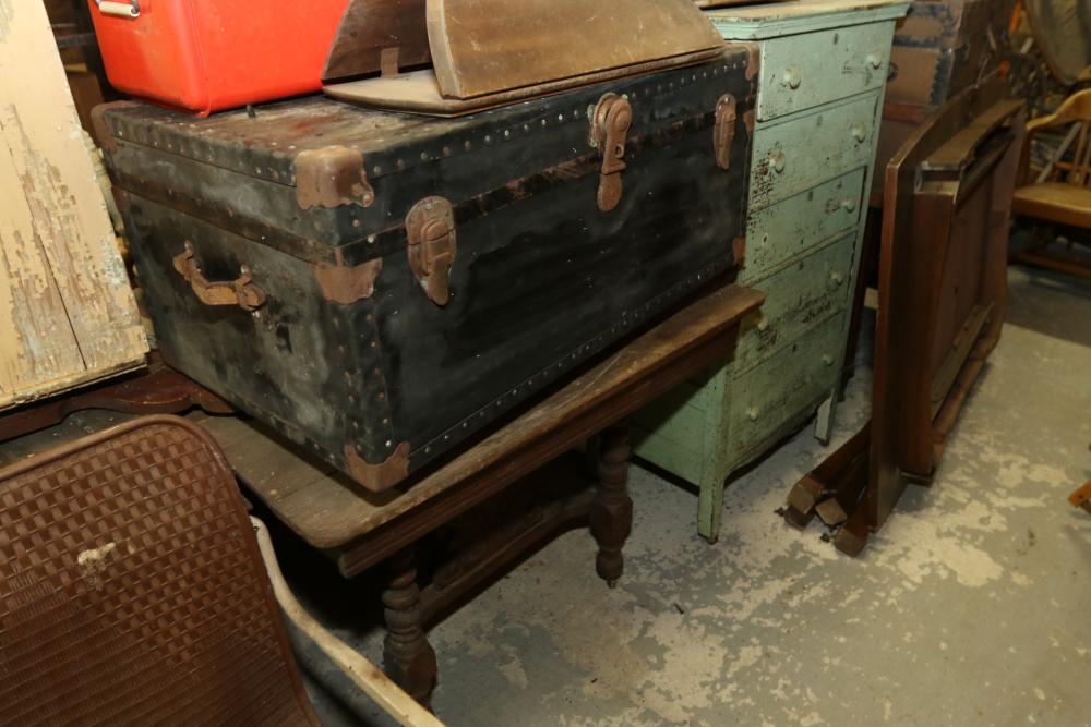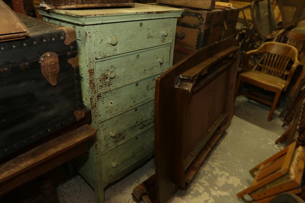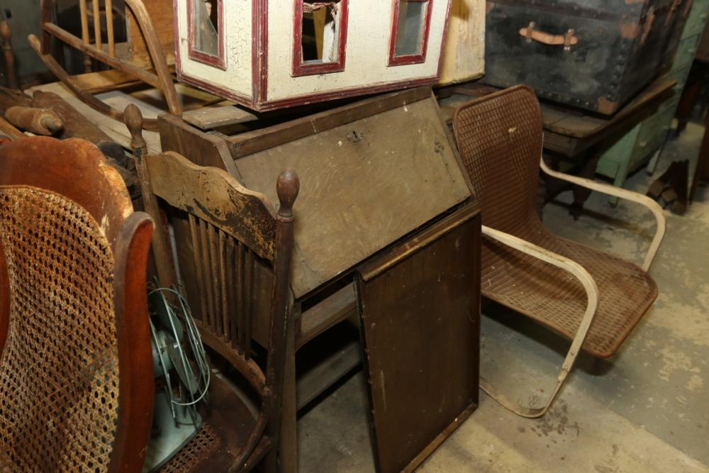 Various antique items in center row such as trunks, chairs, desk, tables, fan, dressers, teapot, plates, cups, heater, etc. Buyer may take as much or as little as they choose.