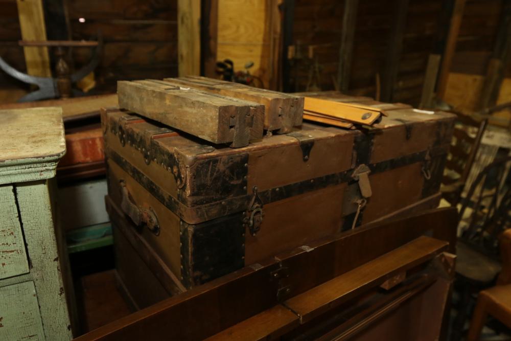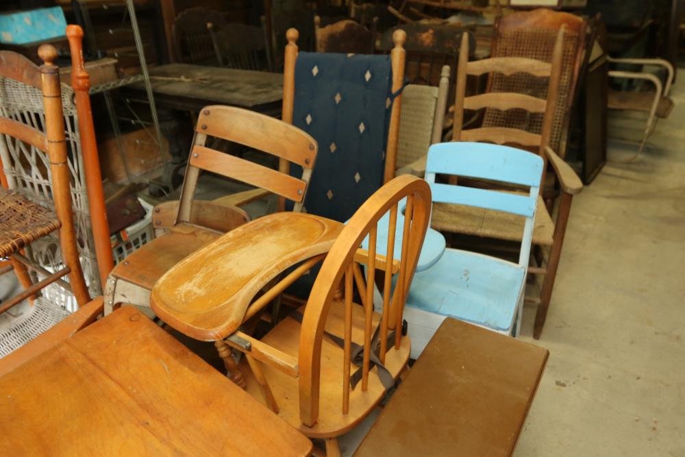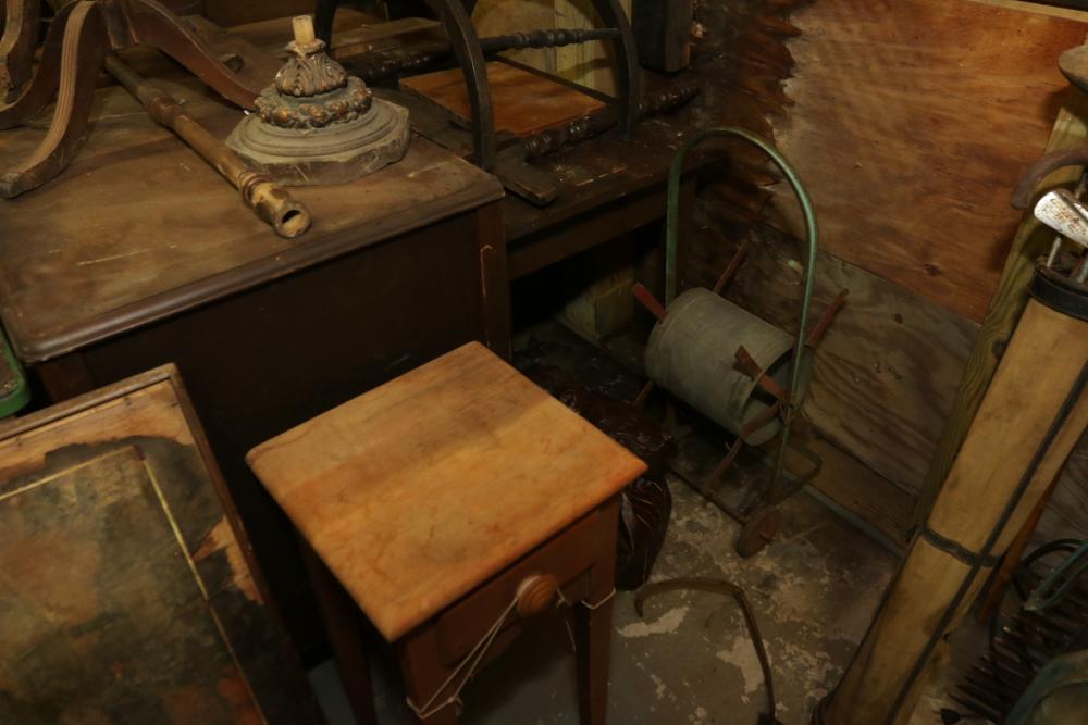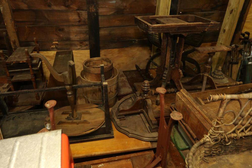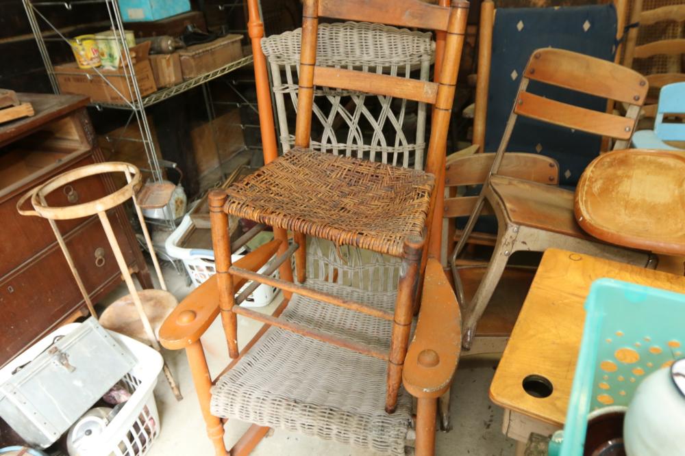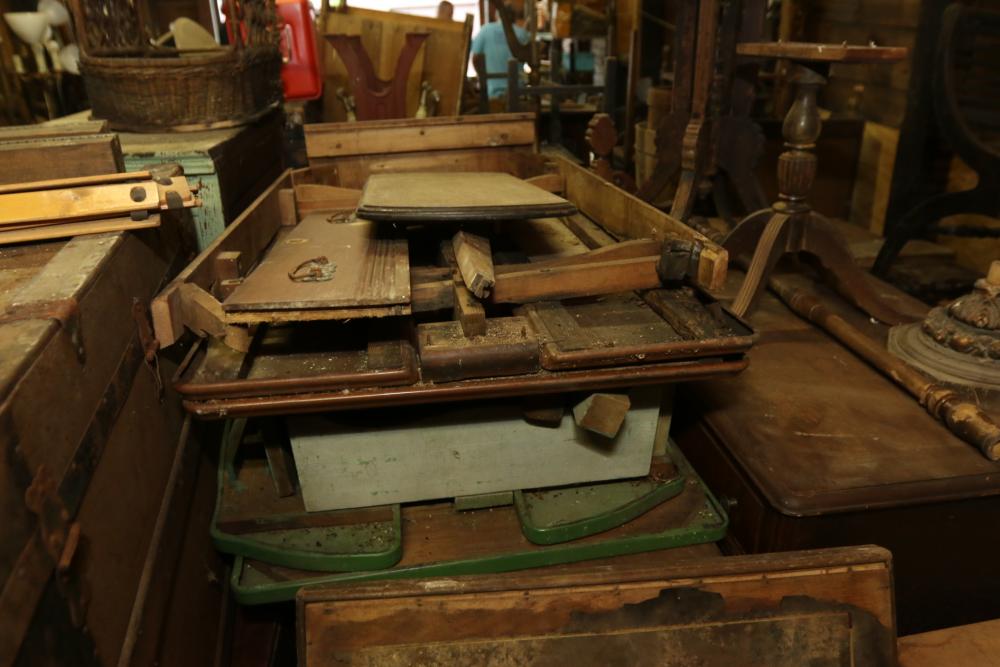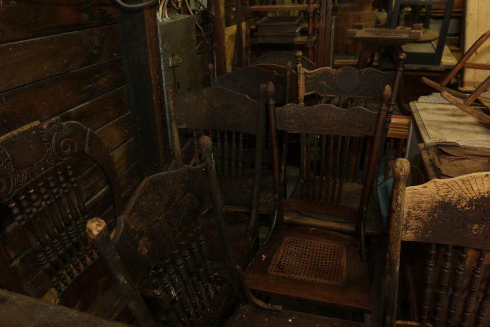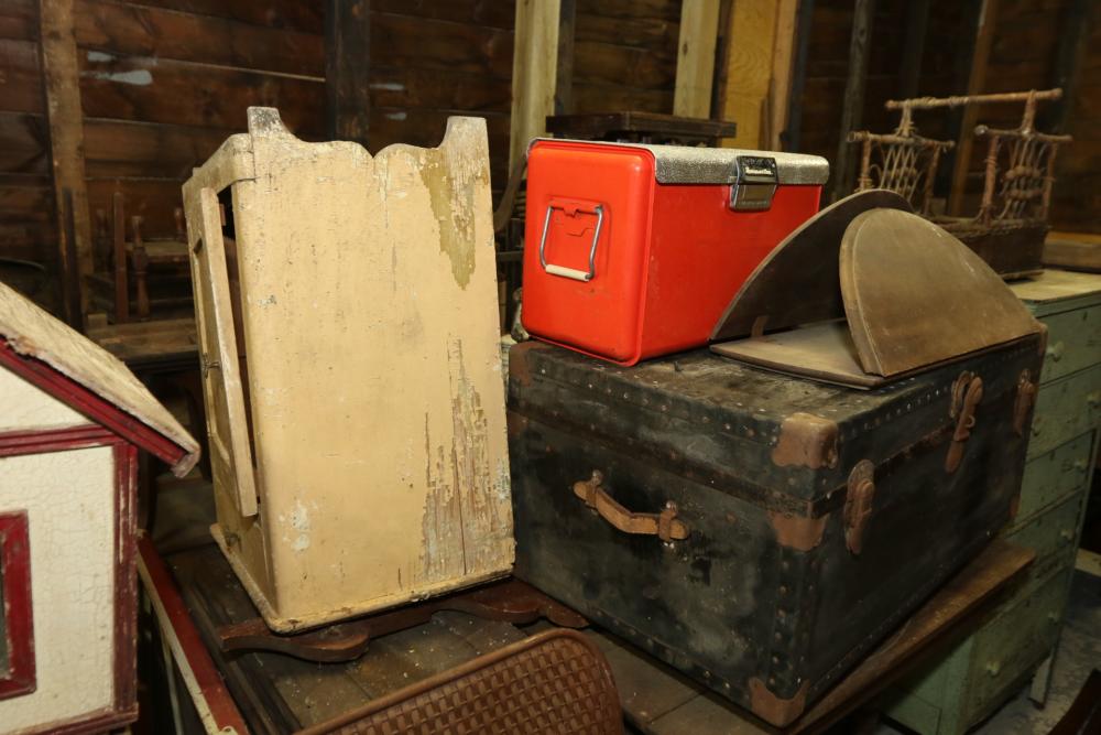 Various antique items in center row such as trunks, chairs, desk, tables, fan, dressers, teapot, plates, cups, heater, etc. Buyer may take as much or as little as they choose.