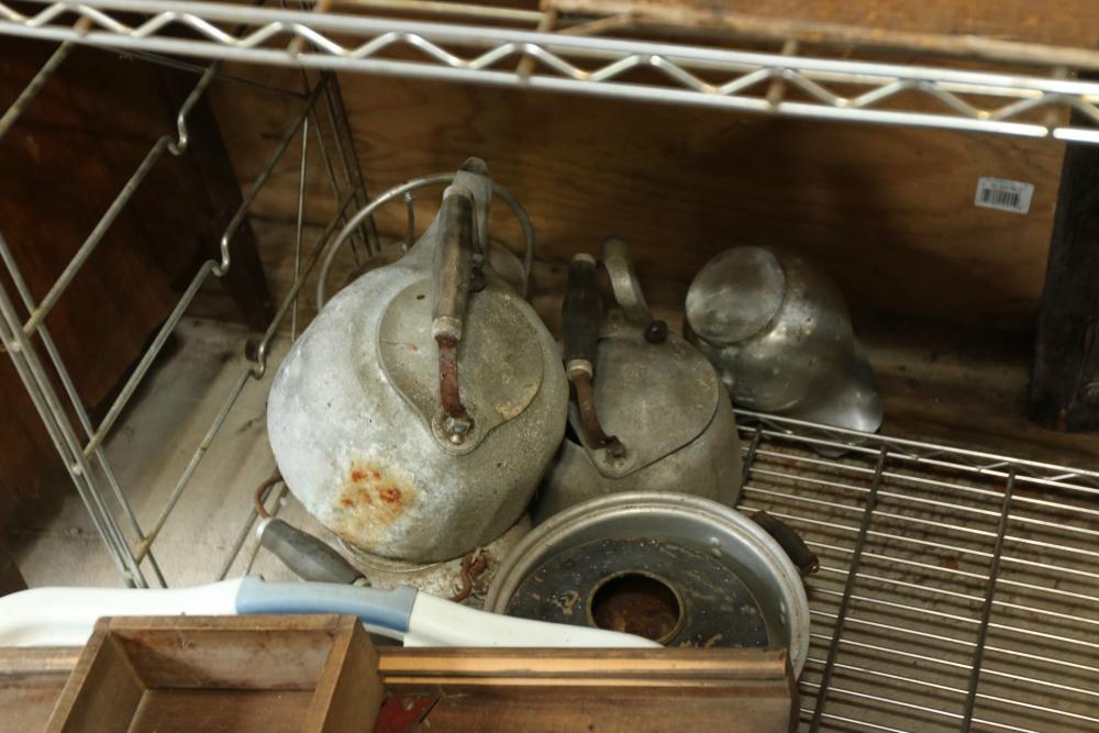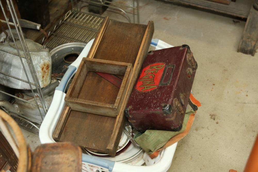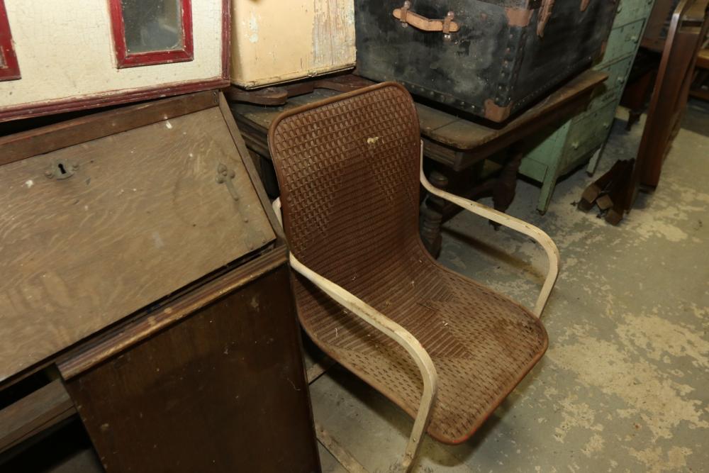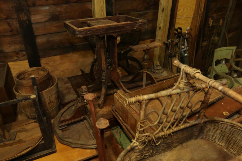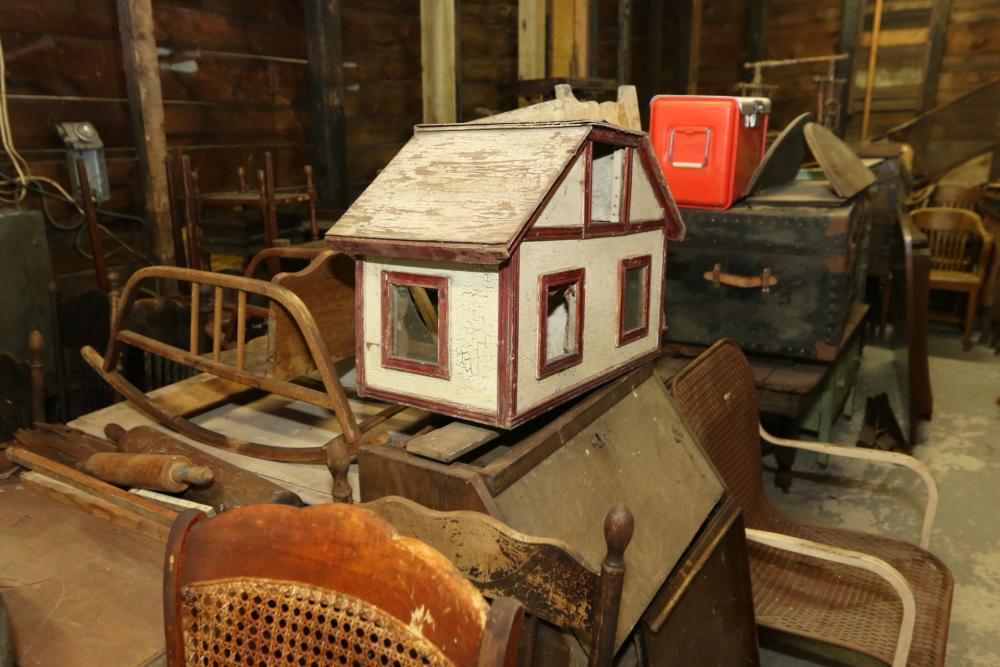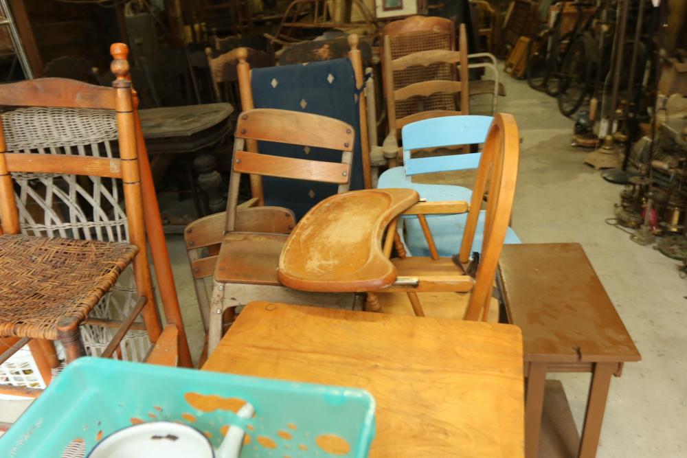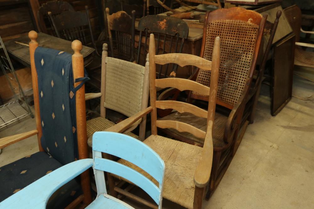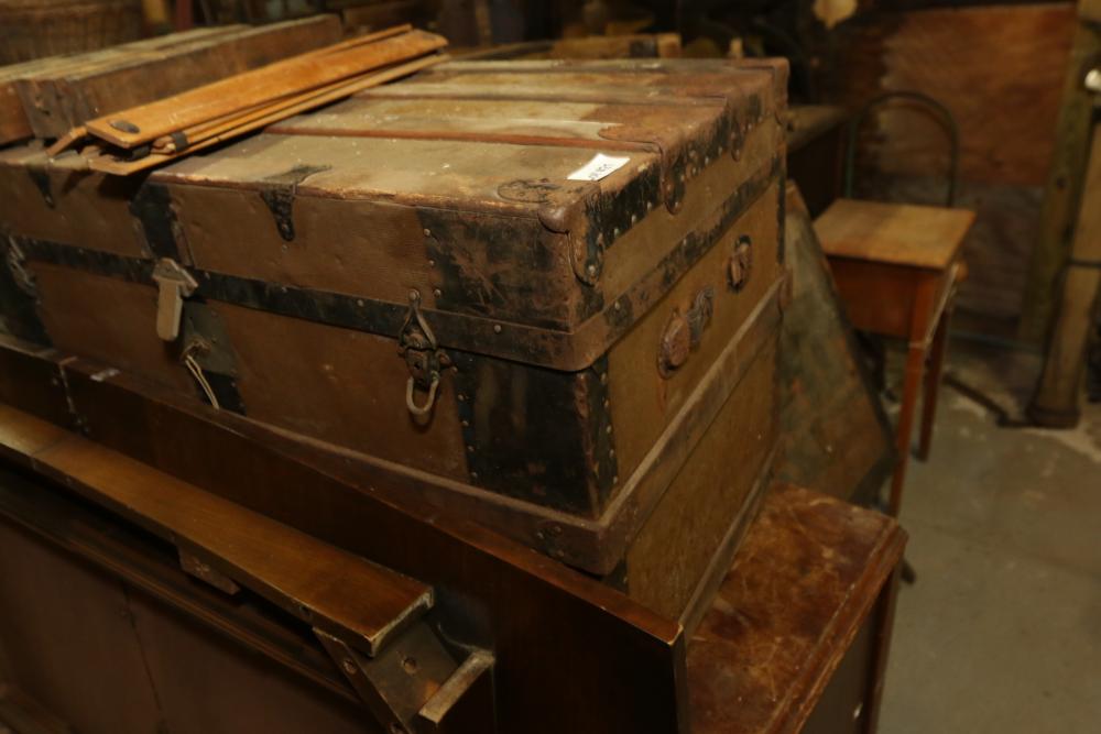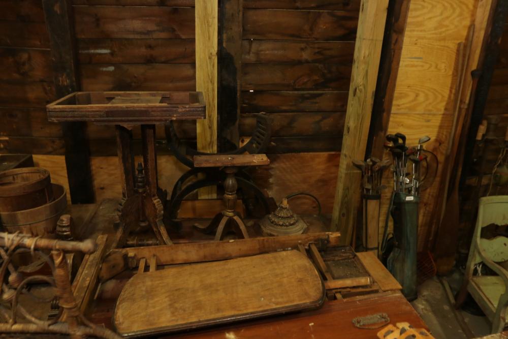 Various antique items in center row such as trunks, chairs, desk, tables, fan, dressers, teapot, plates, cups, heater, etc. Buyer may take as much or as little as they choose.