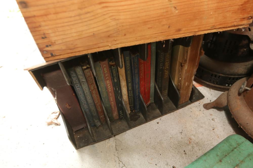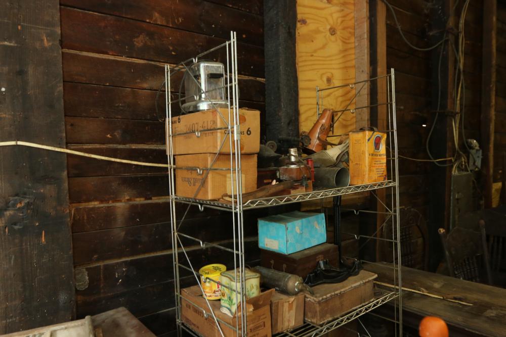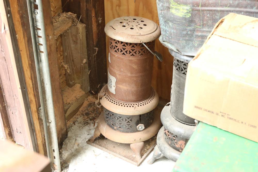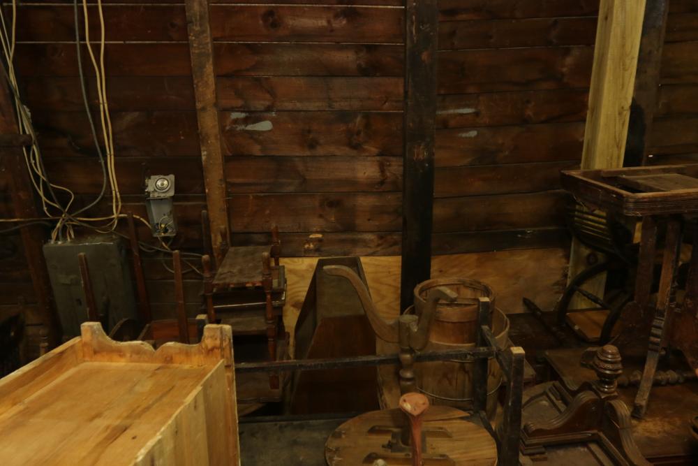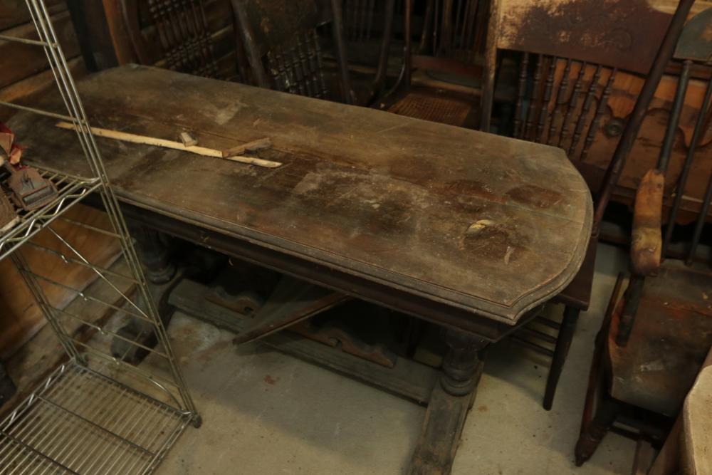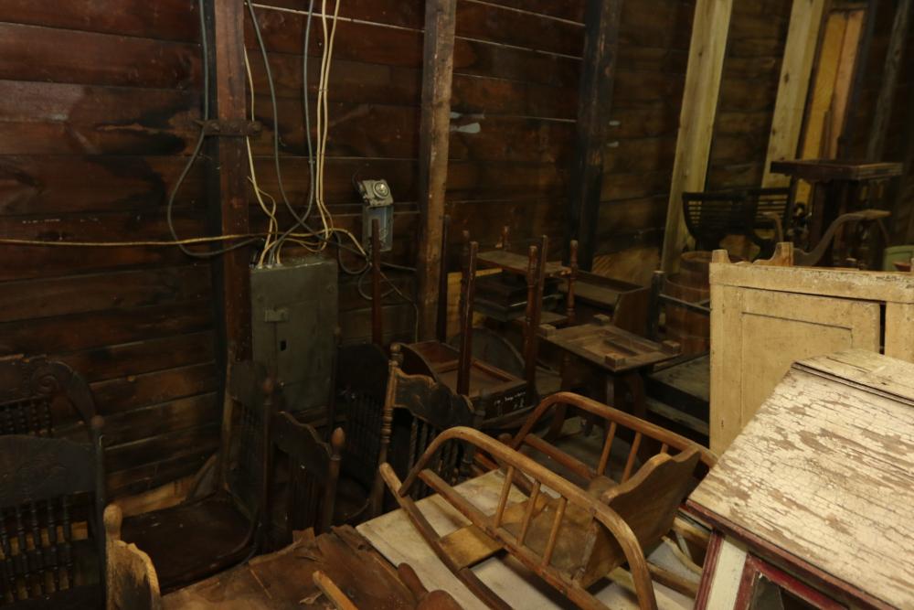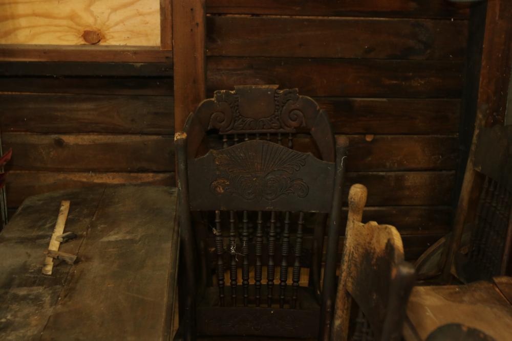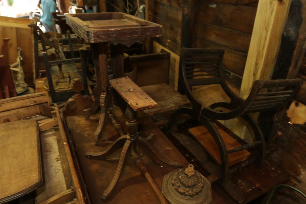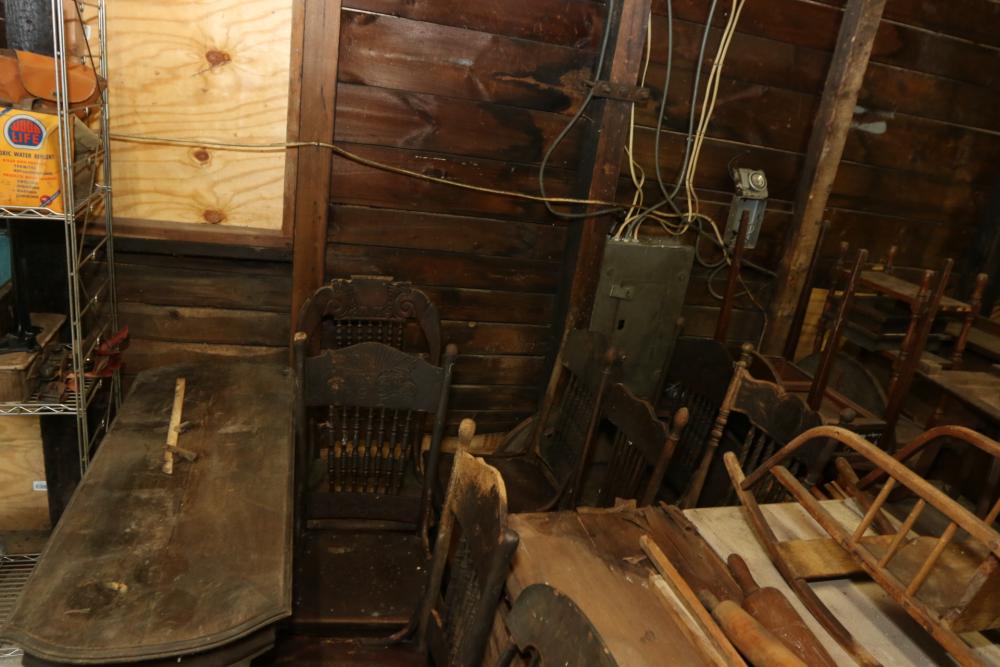 Various antique items in center row such as trunks, chairs, desk, tables, fan, dressers, teapot, plates, cups, heater, etc. Buyer may take as much or as little as they choose.