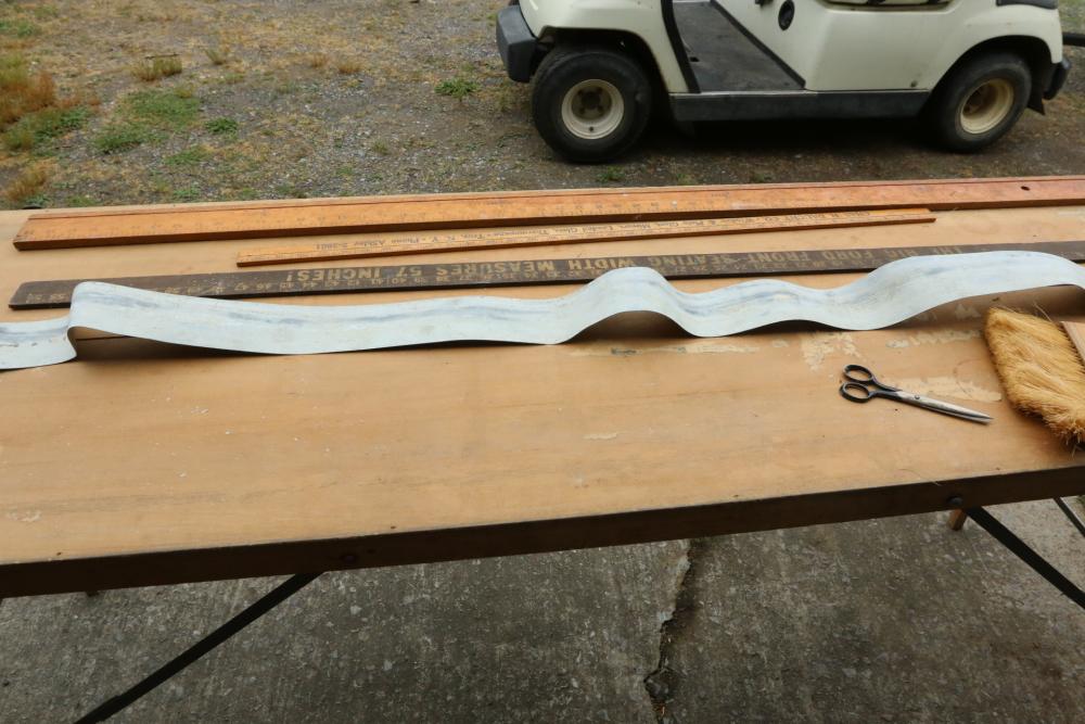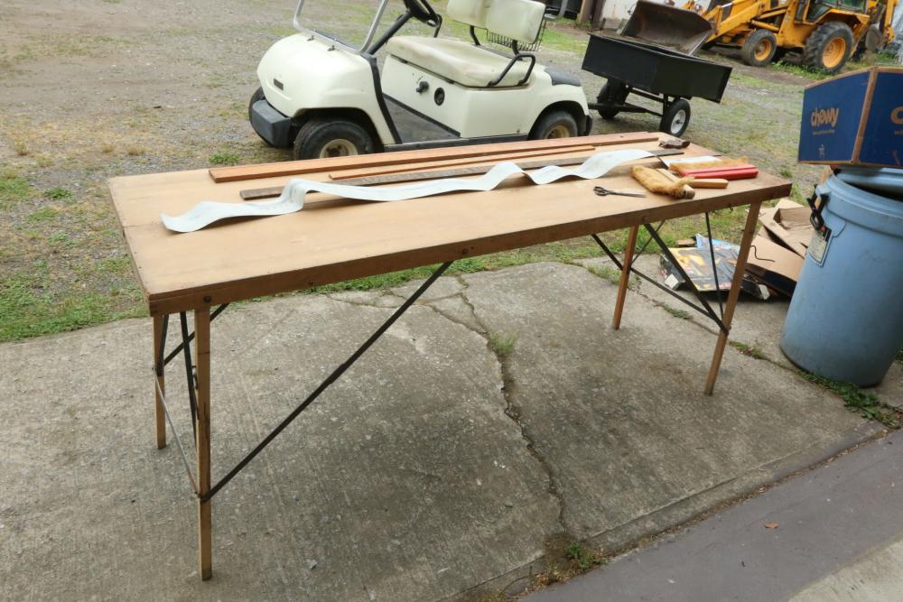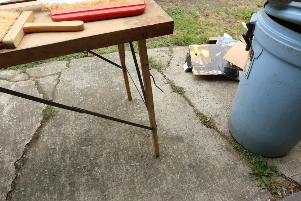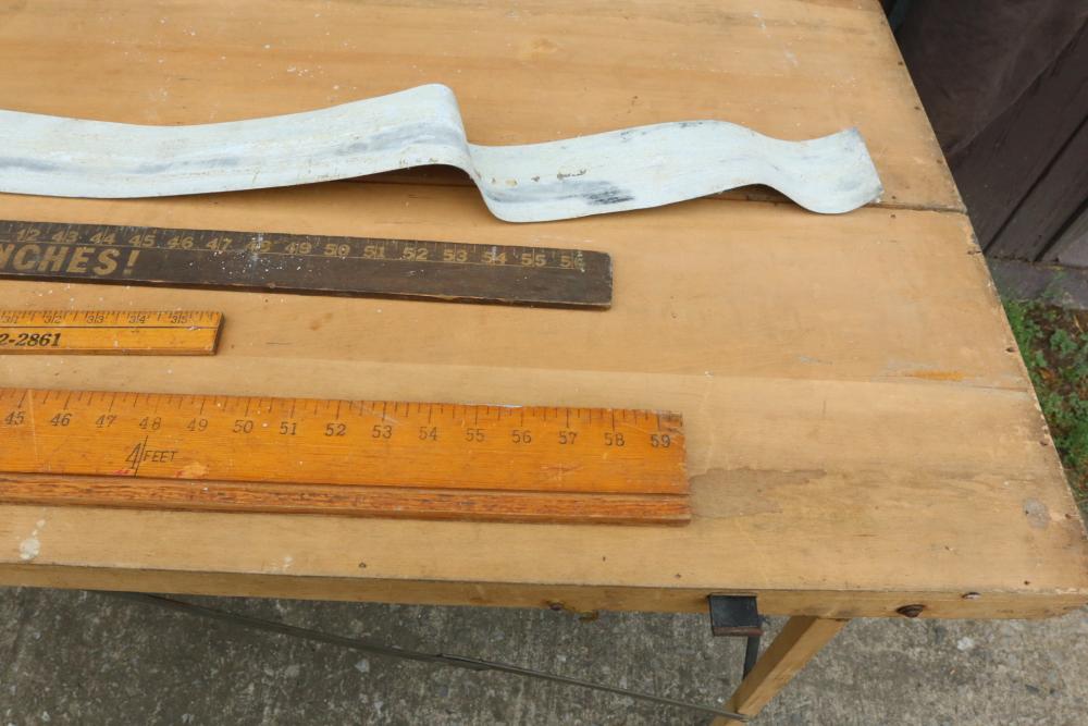 Foldable work bench measuring approx. 22 x 72 x 23 with measuring sticks and brushes.