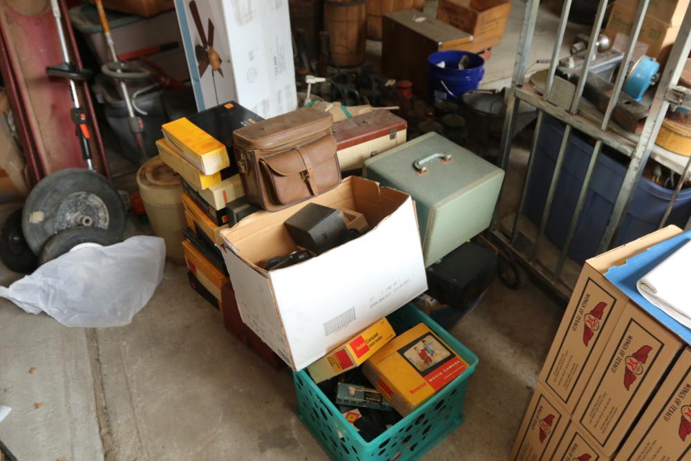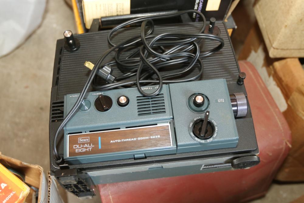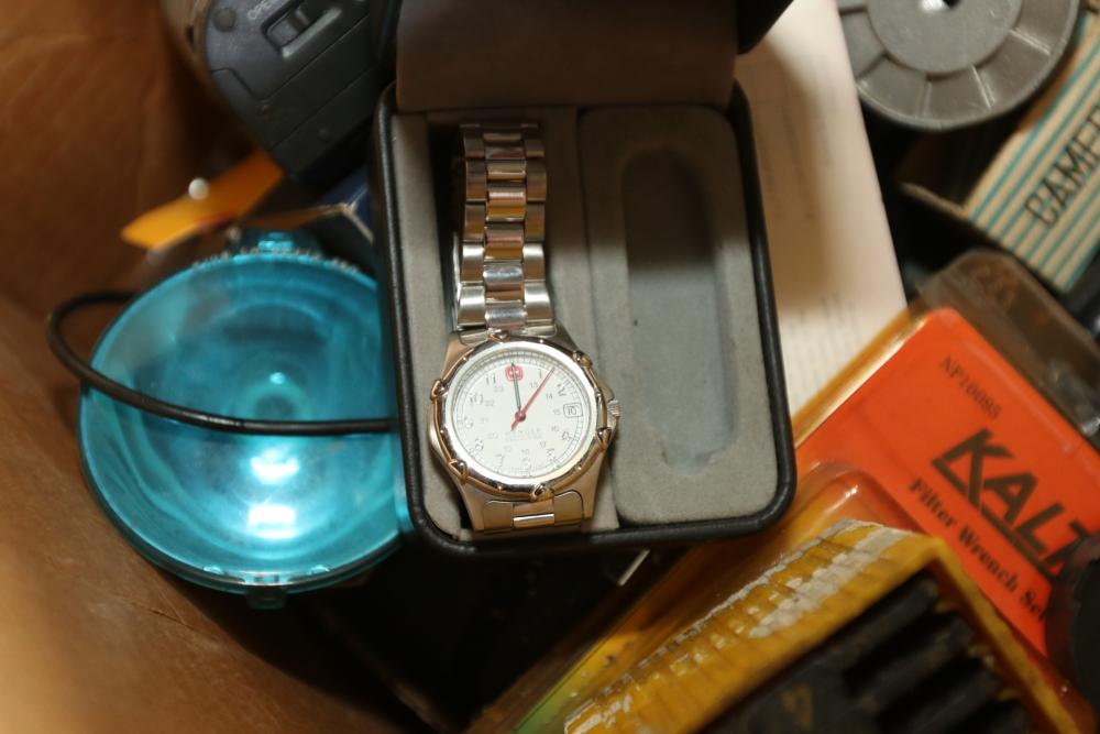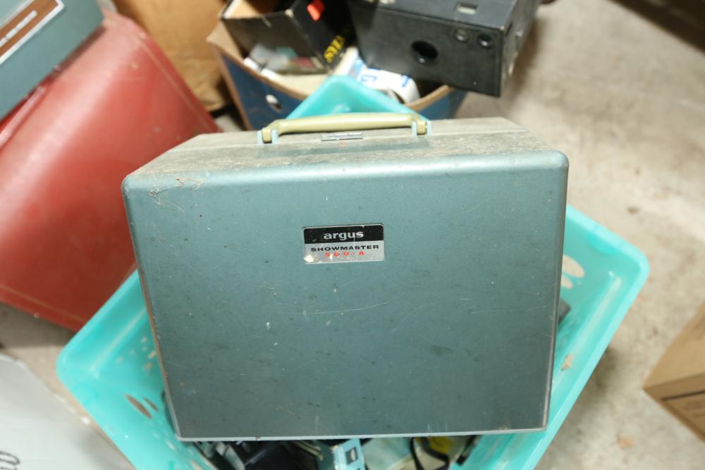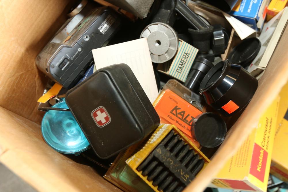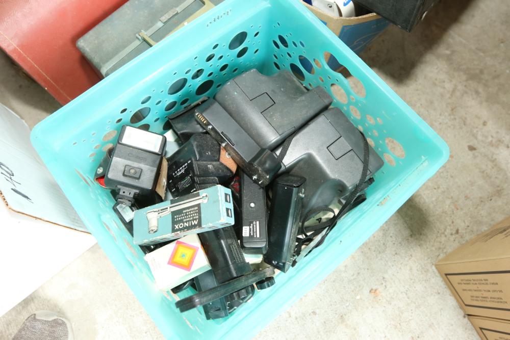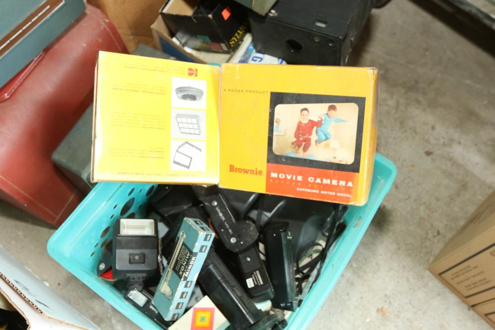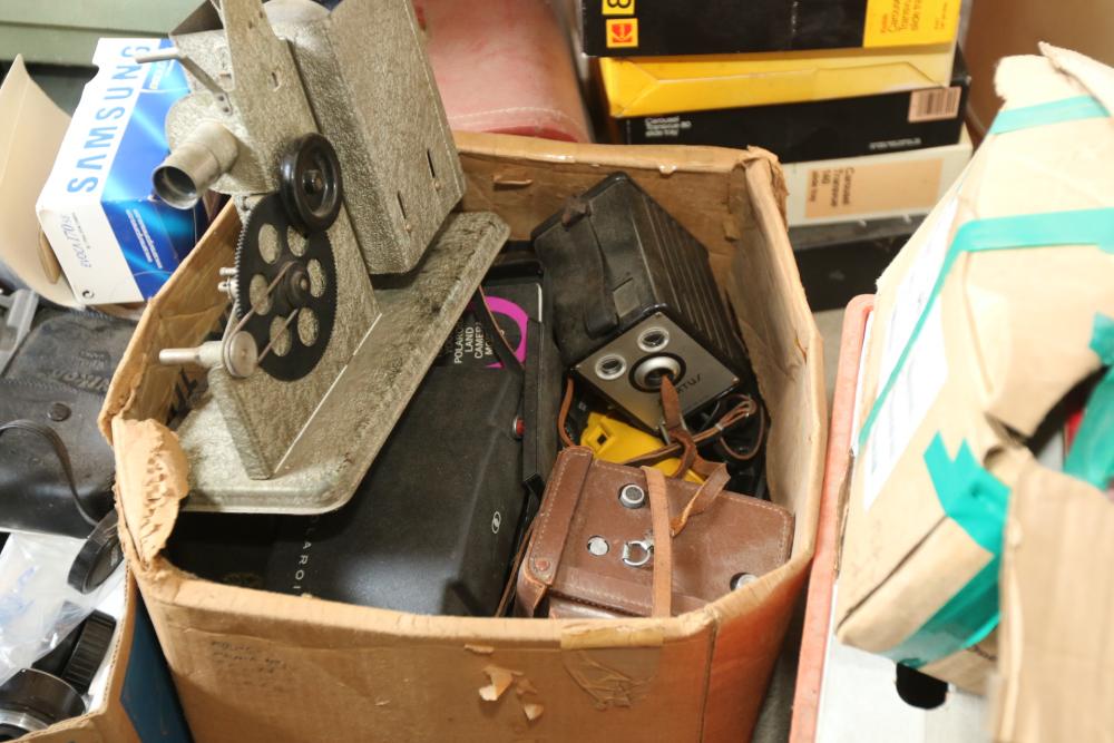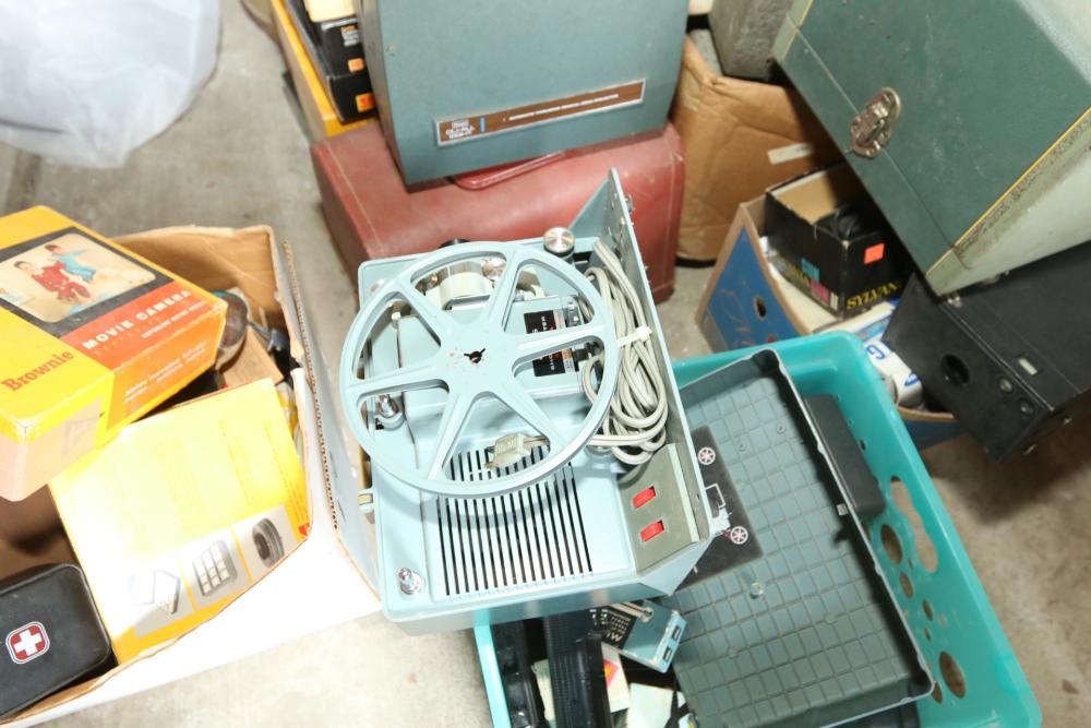 Various camera equipment including disposable cameras, flashes, polaroid cameras, Swiss army watch, Argus Showmaster 500-A Projector, Argus 300 Projector, Sears Auto-Thread zoom projector, etc.