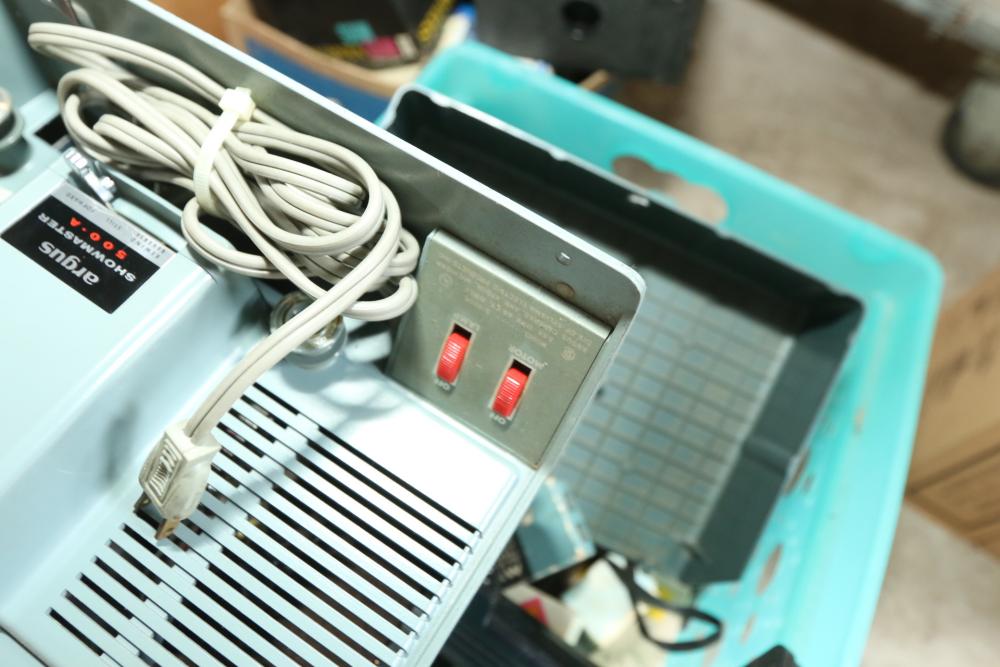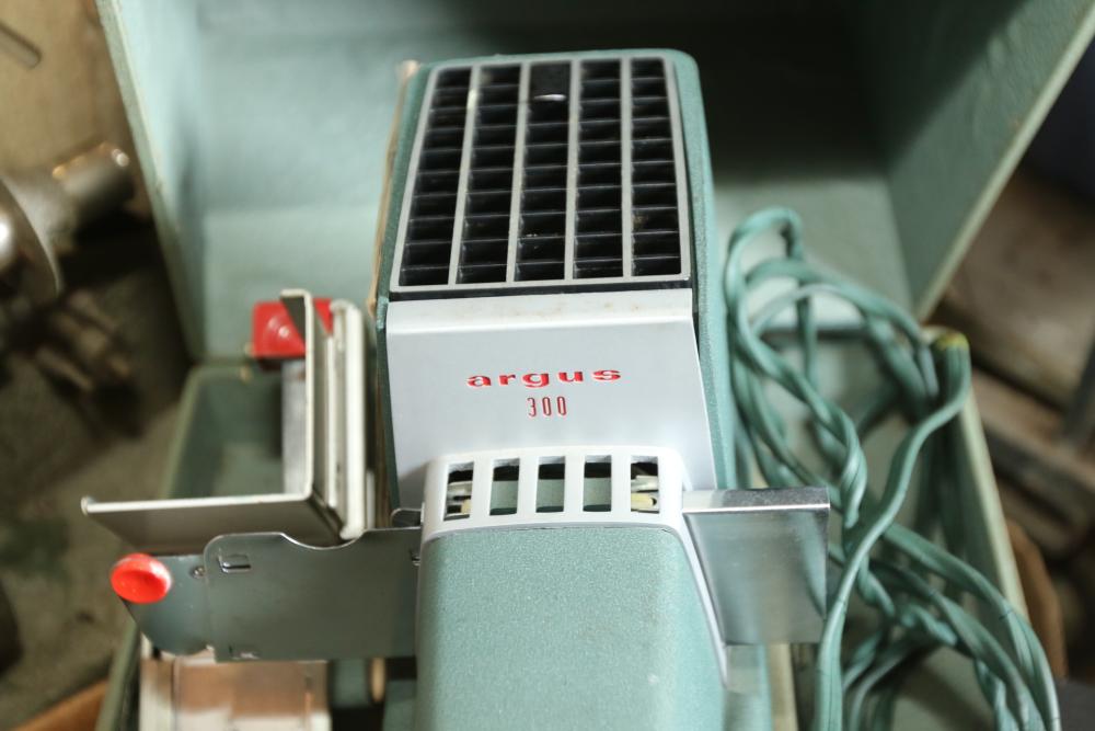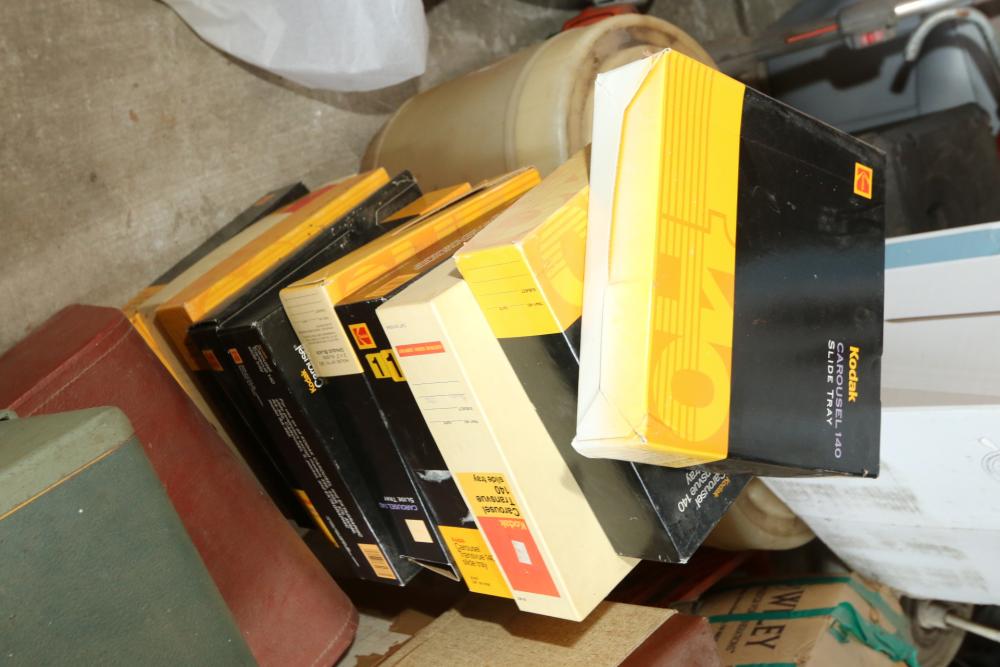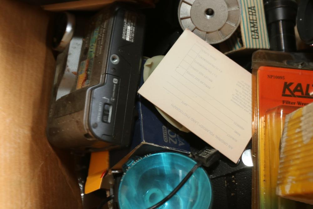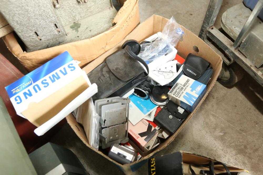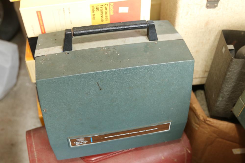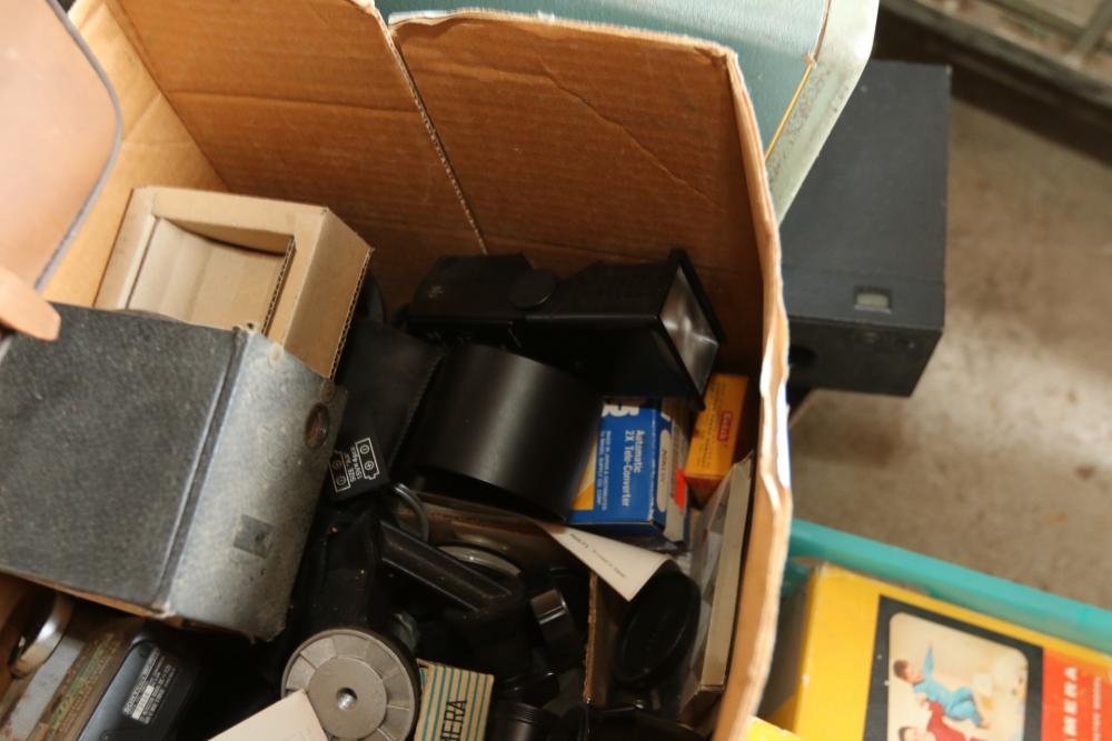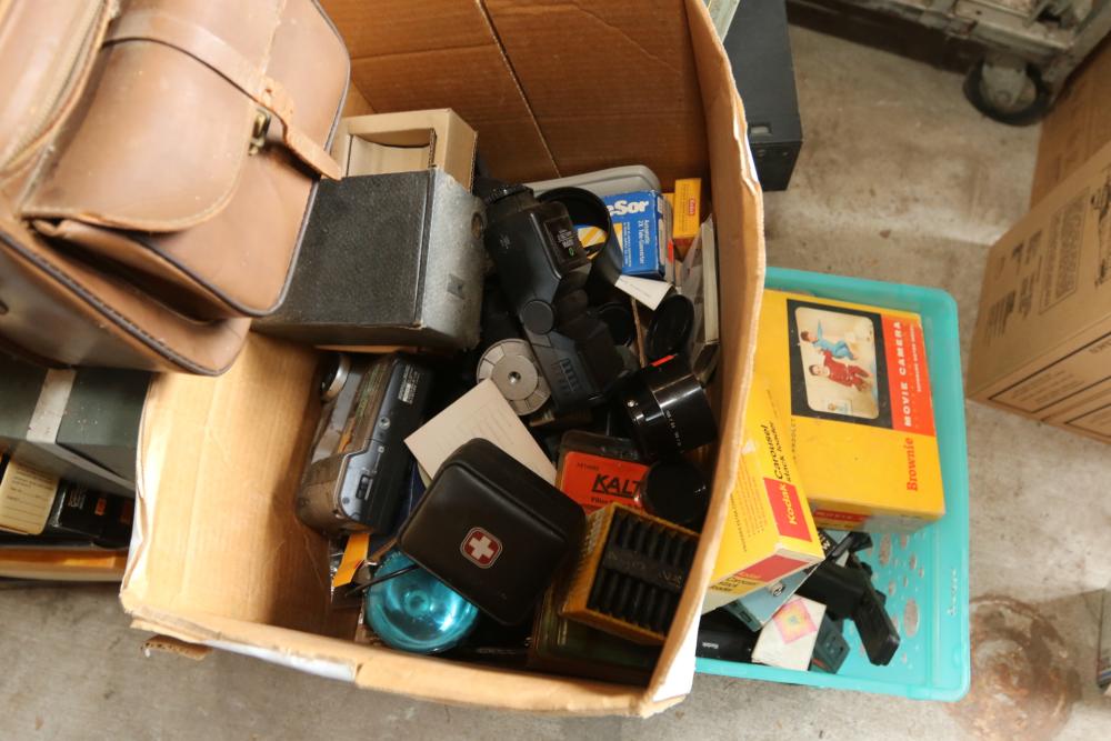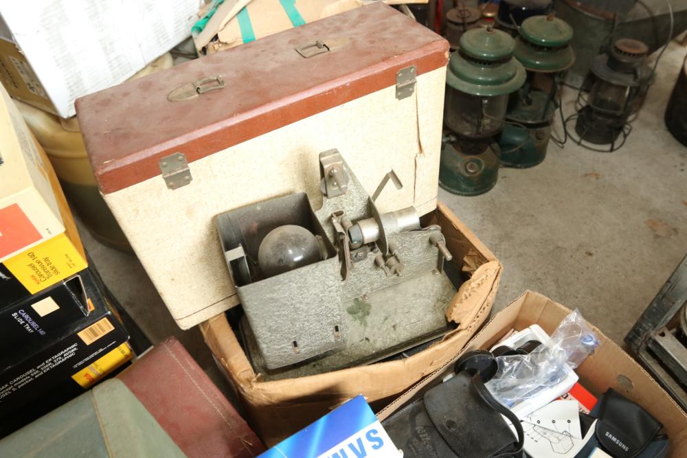 Various camera equipment including disposable cameras, flashes, polaroid cameras, Swiss army watch, Argus Showmaster 500-A Projector, Argus 300 Projector, Sears Auto-Thread zoom projector, etc.