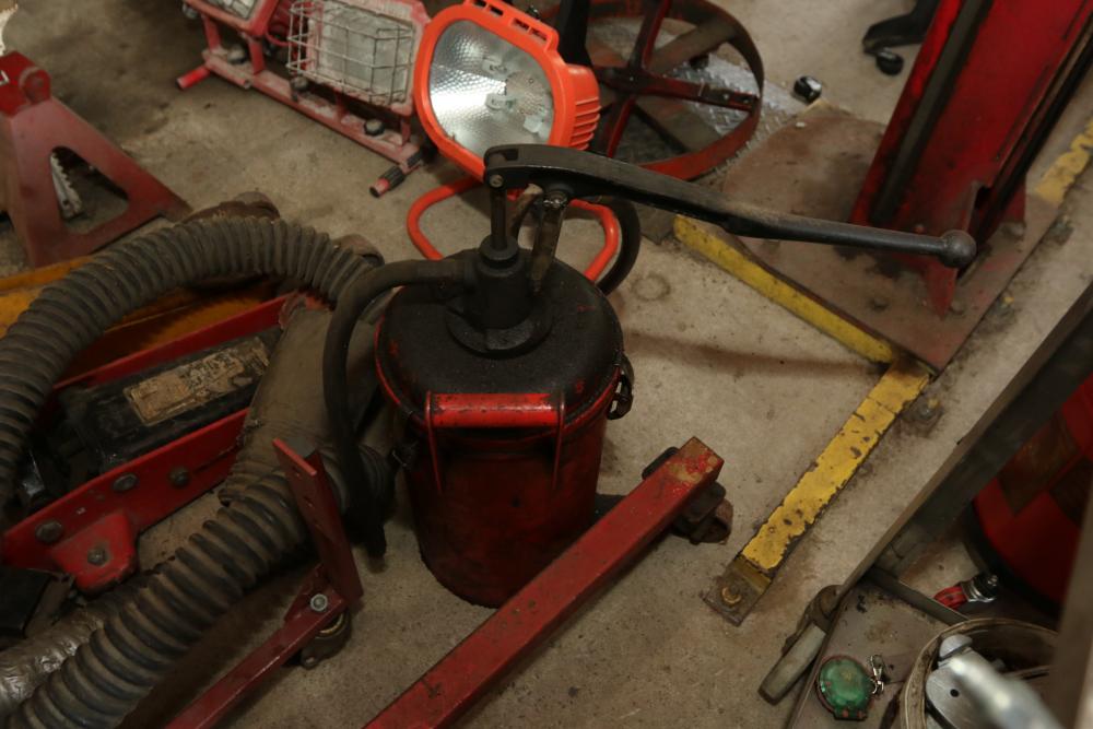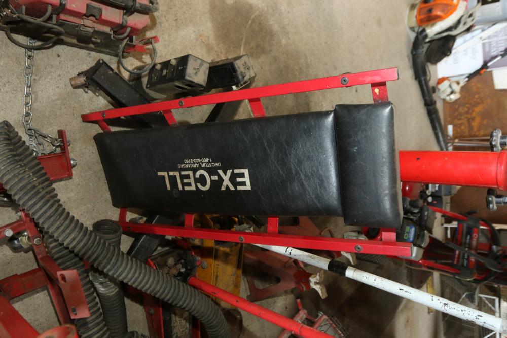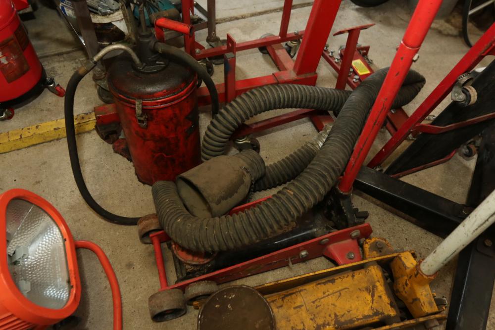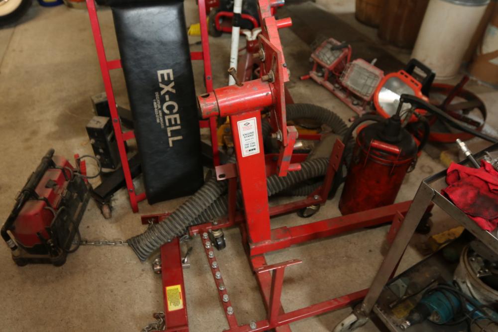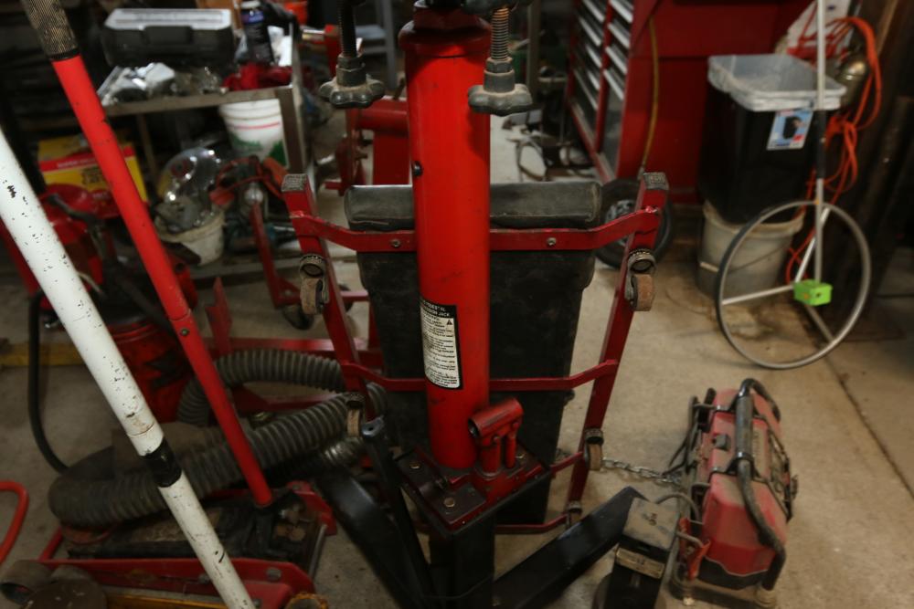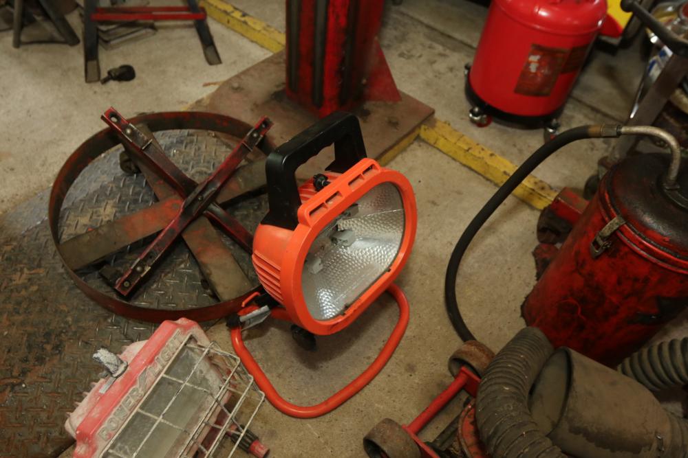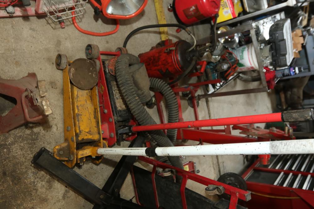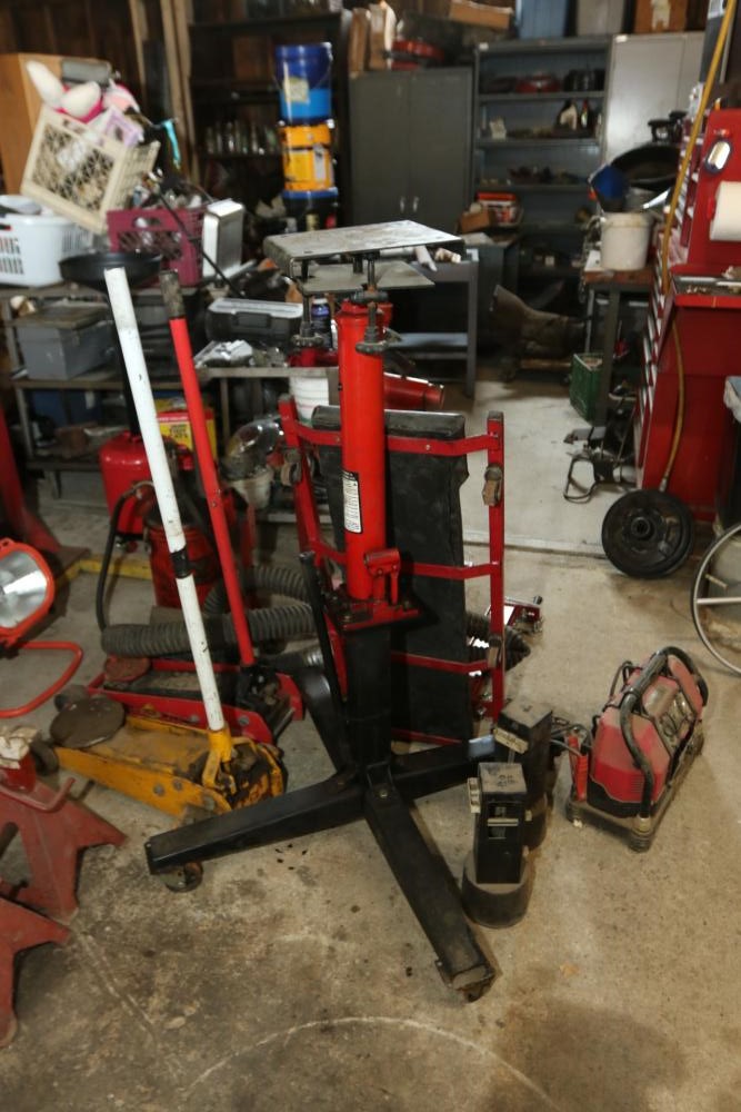 Various automotive tools including jacks, lights, battery charger, headlight aimer, Ex-Cell creeper, oil pump, transmission jack, oil stand, barrel roller, etc.