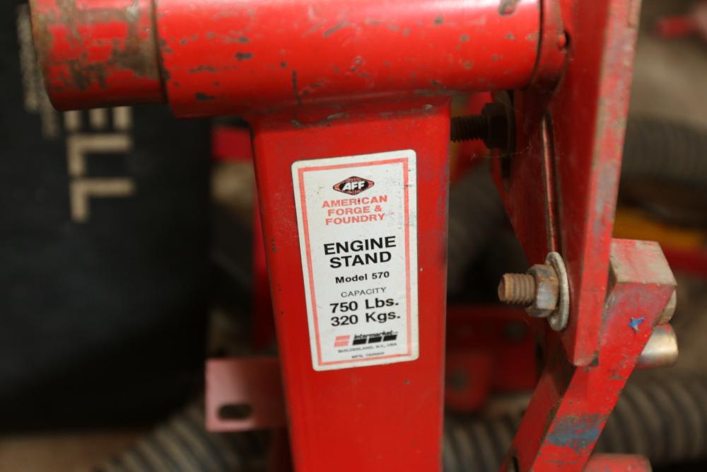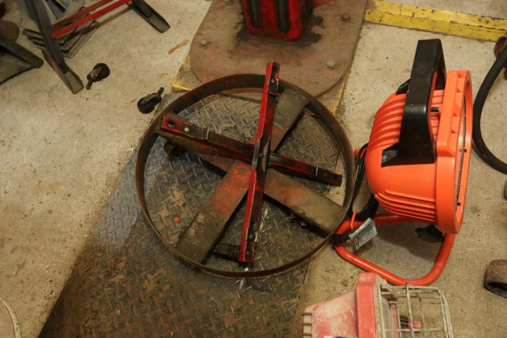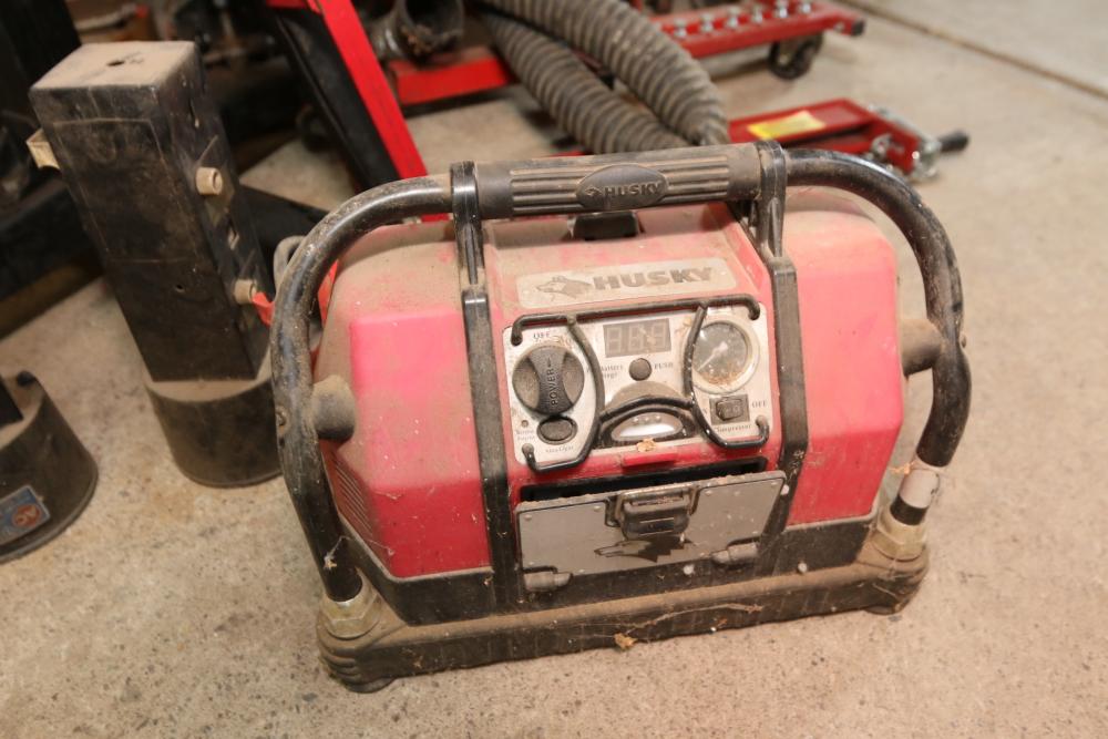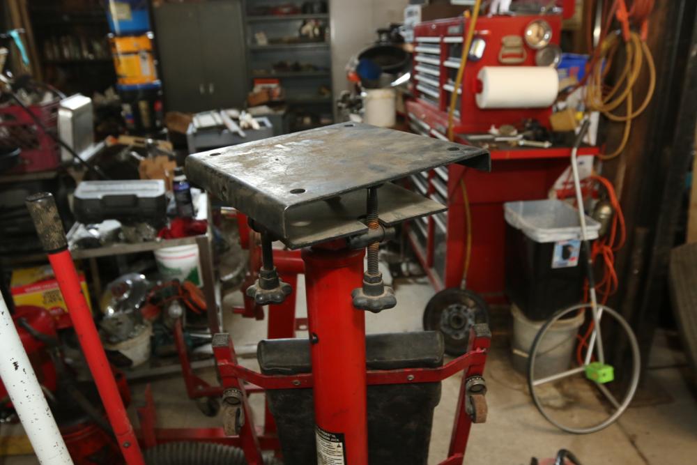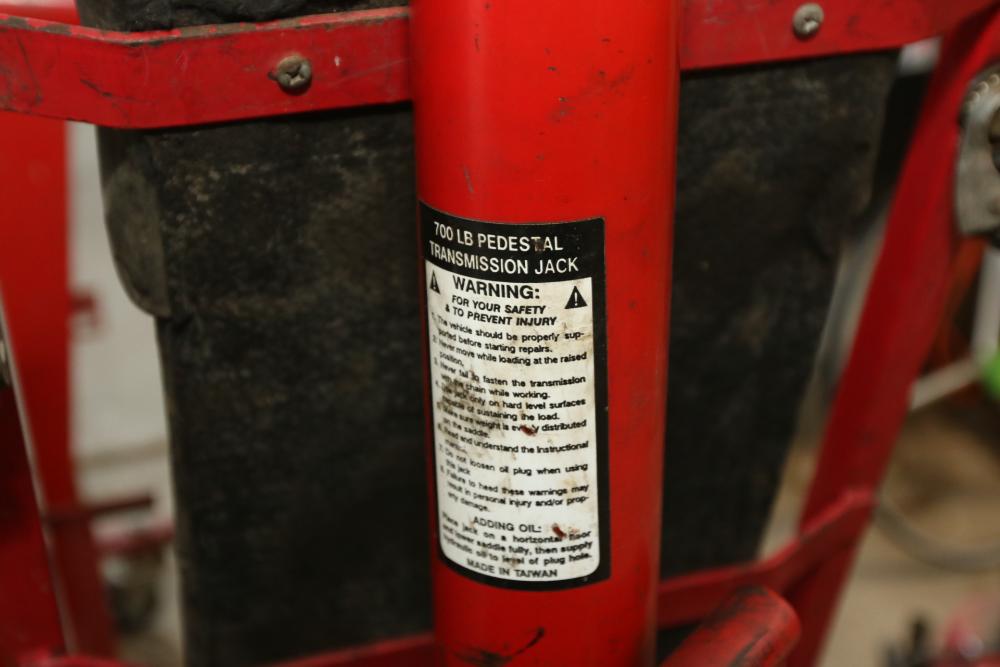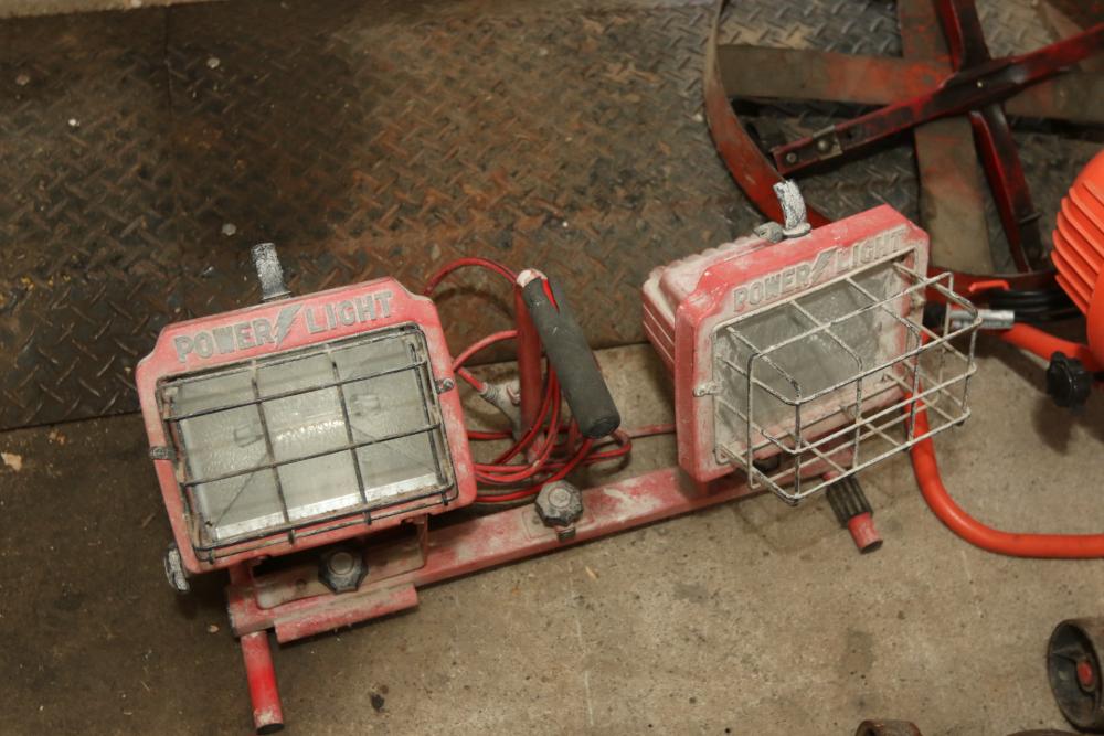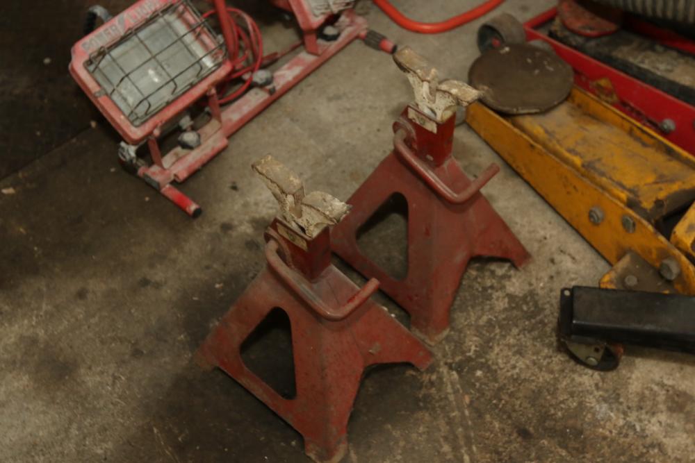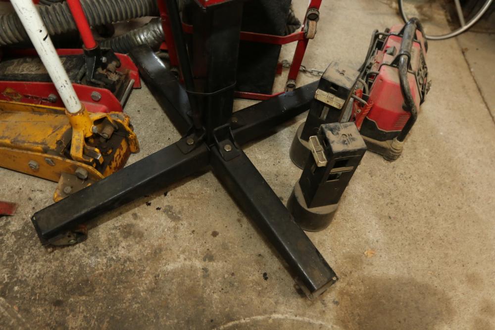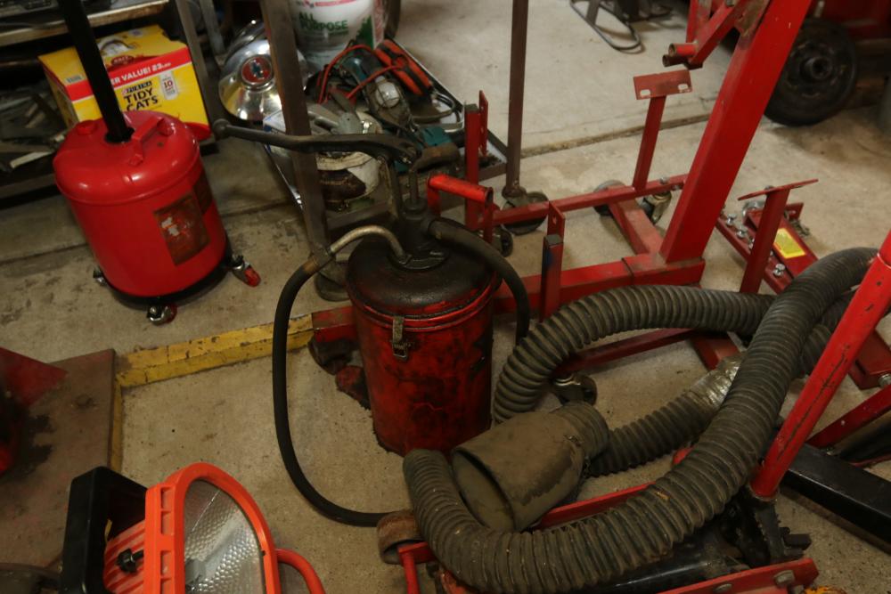 Various automotive tools including jacks, lights, battery charger, headlight aimer, Ex-Cell creeper, oil pump, transmission jack, oil stand, barrel roller, etc.