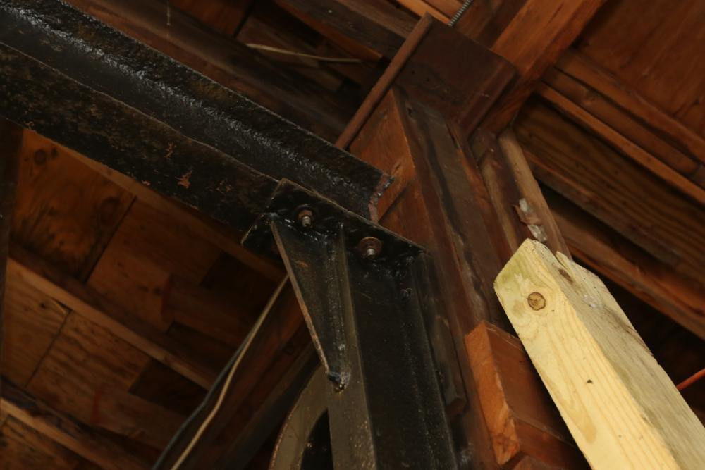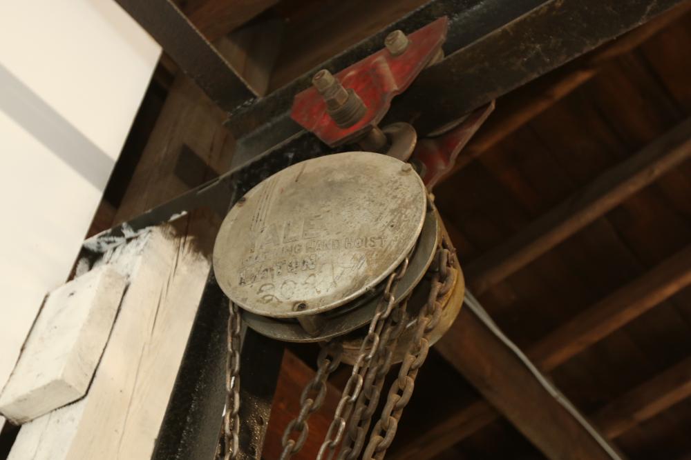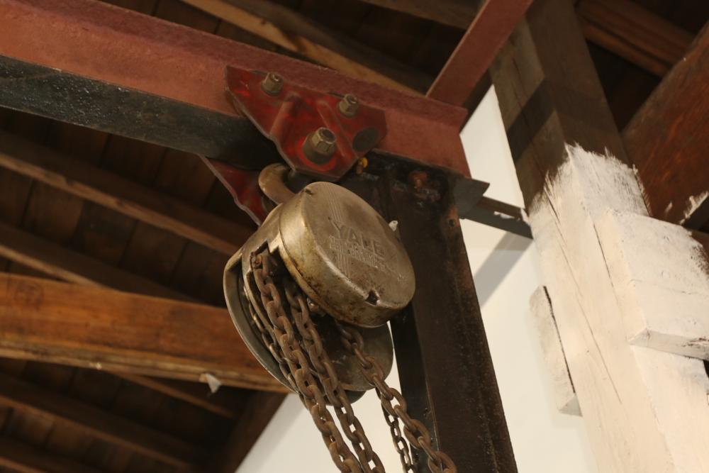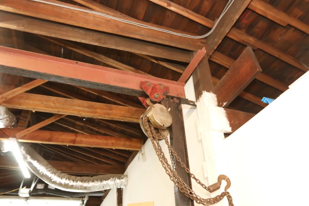 Yale Load King hand hoist 1 1/2 ton block and tackle eye beam system, approx. 160 wide and 12 ft tall.