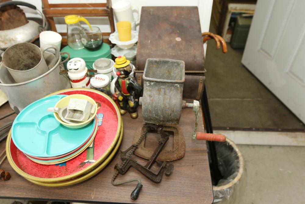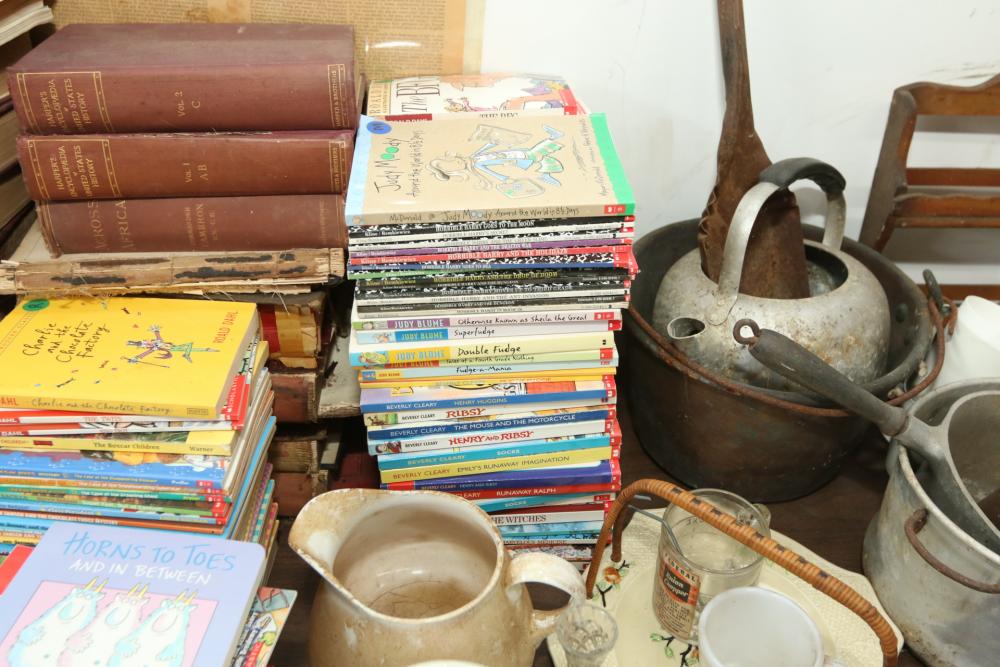 Table lot including various books, magazines, teapots, plates, different sized bottles, cups, vintage Pneuvac sweeper vac early 1910s wooden floor carpet, etc.