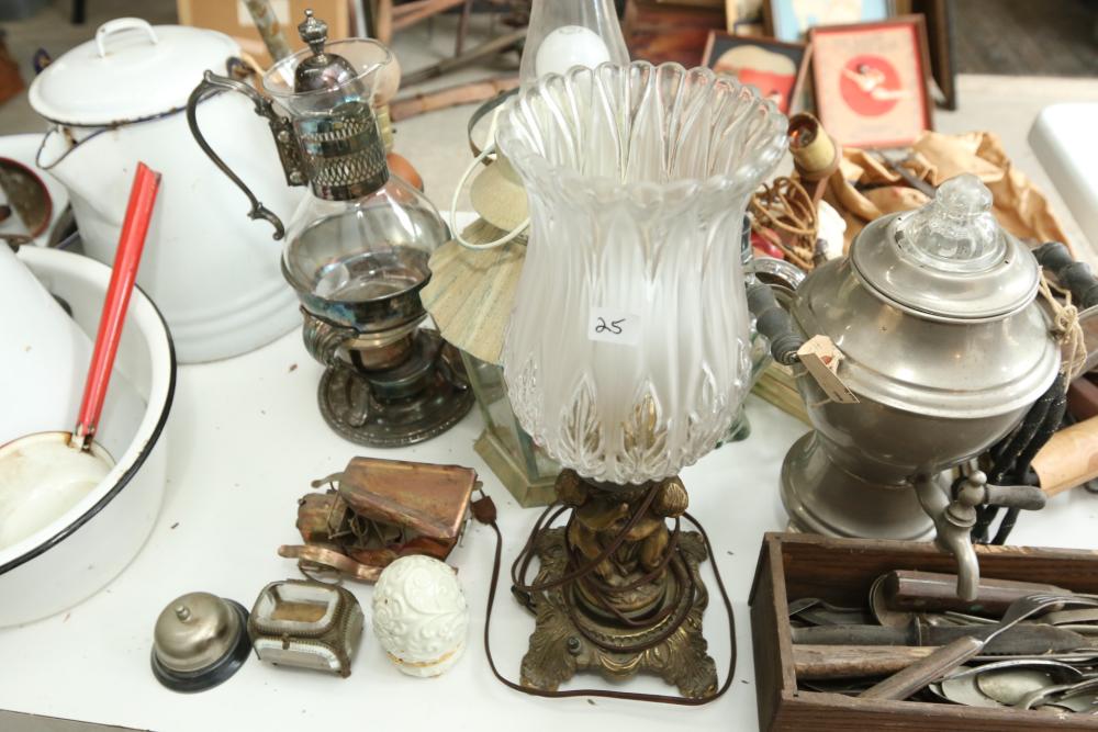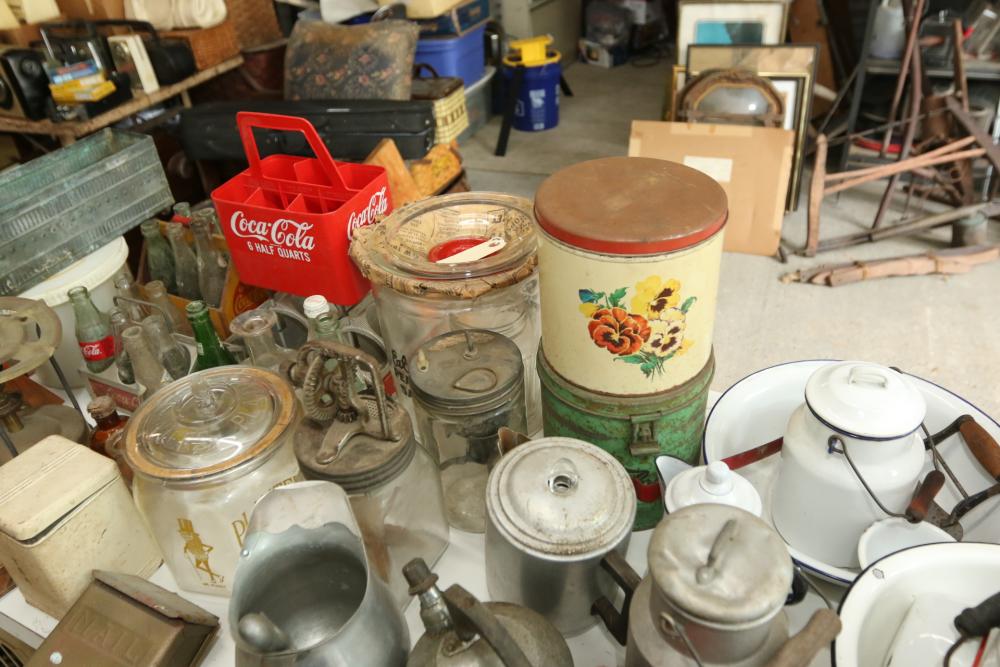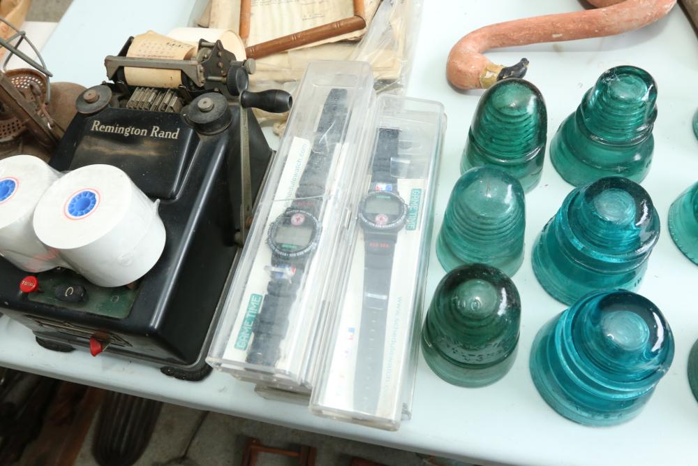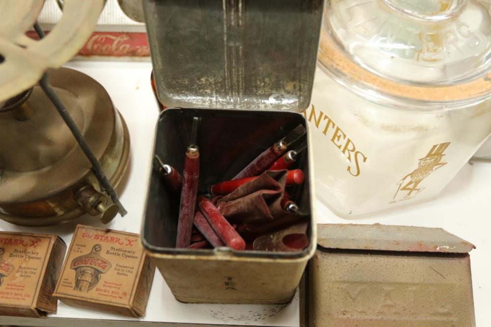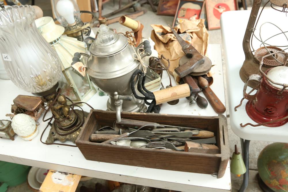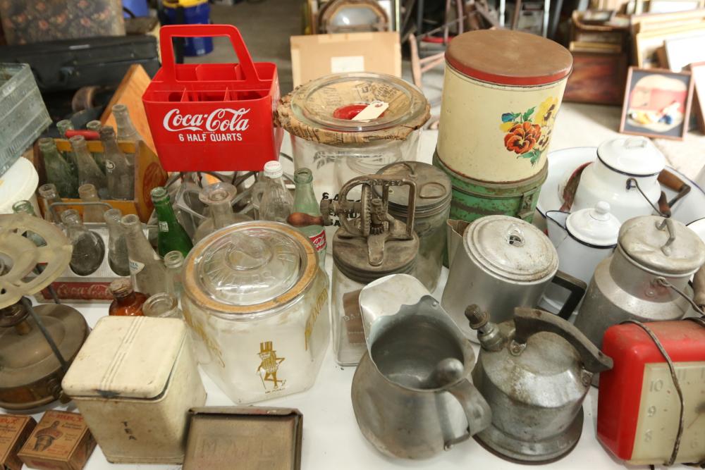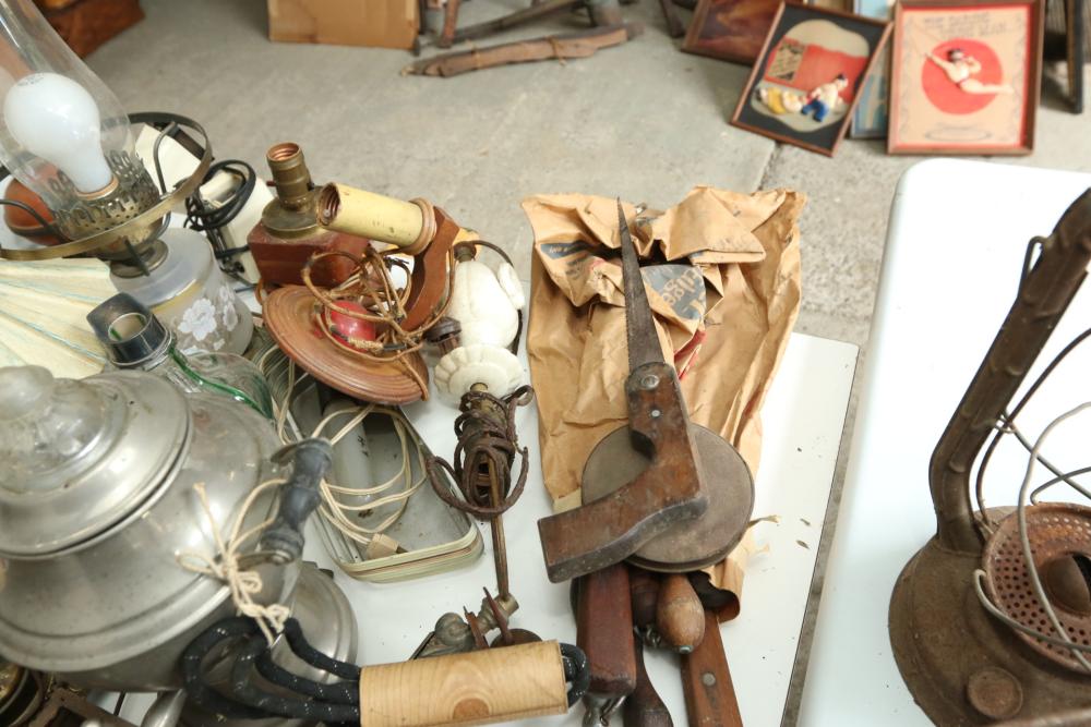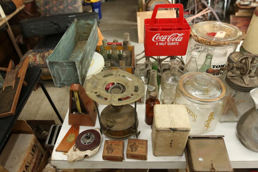 Table lot including planers, receipt machine, lamps, globes, MLB gametime watch, cutlery, teapots, jars, pin insulator, coke glass bottles, sad irons, bottle holders, etc.