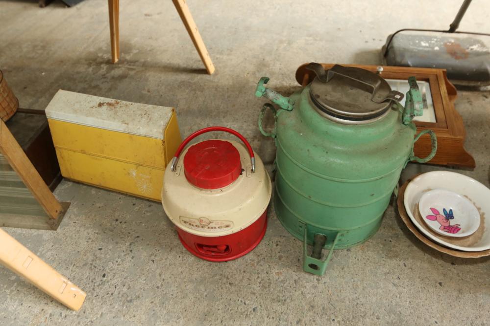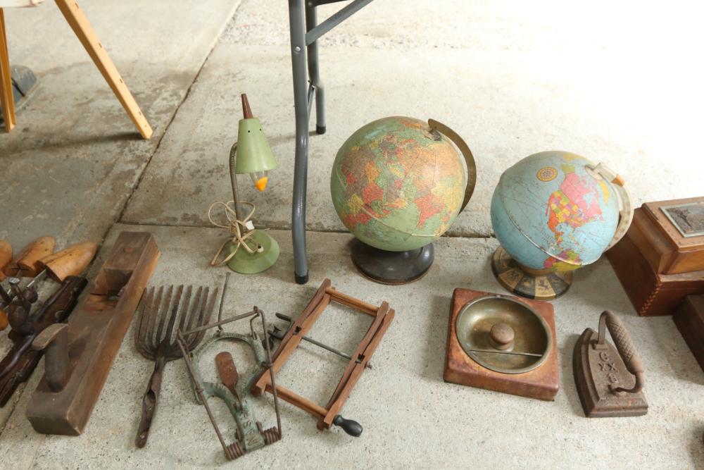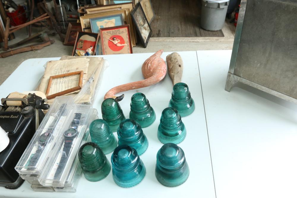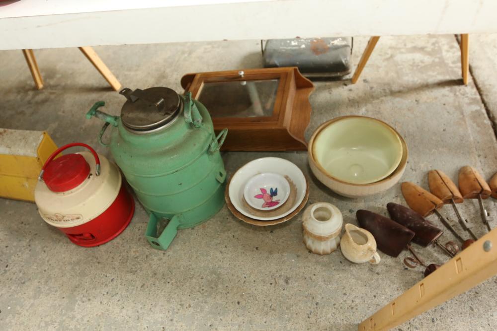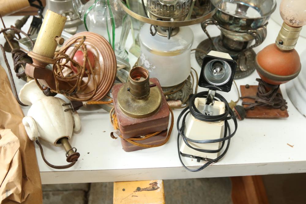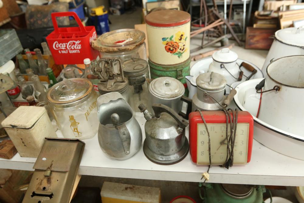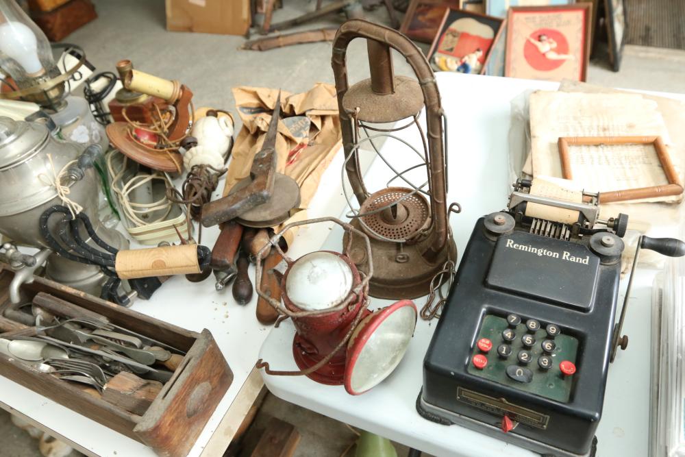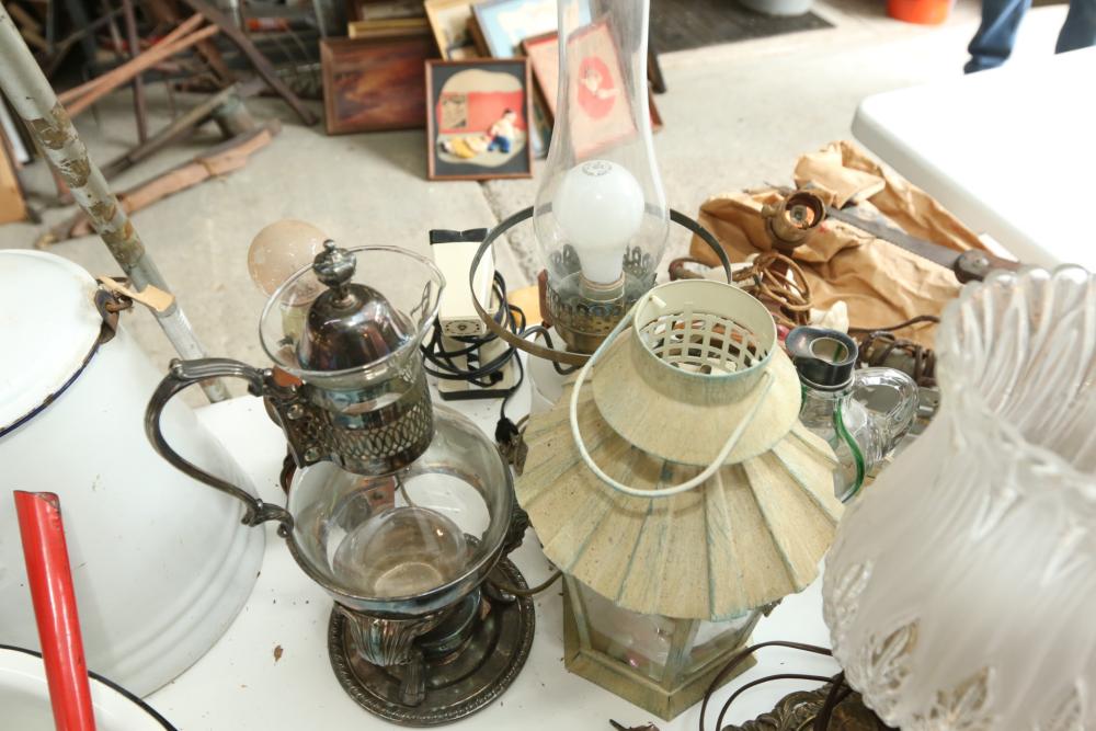 Table lot including planers, receipt machine, lamps, globes, MLB gametime watch, cutlery, teapots, jars, pin insulator, coke glass bottles, sad irons, bottle holders, etc.