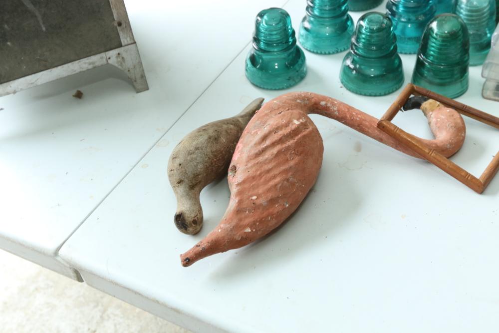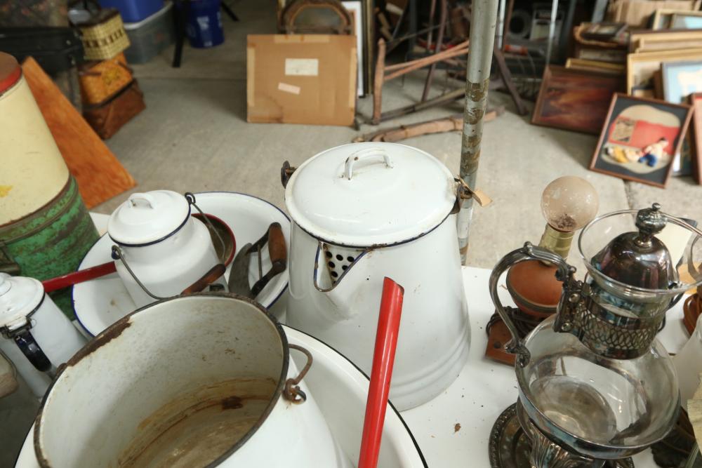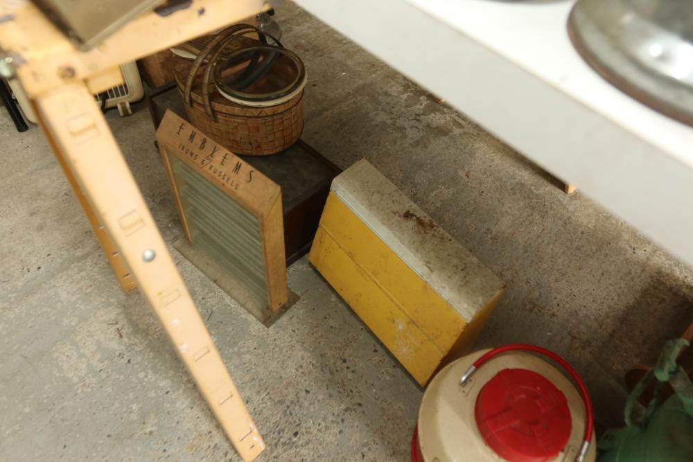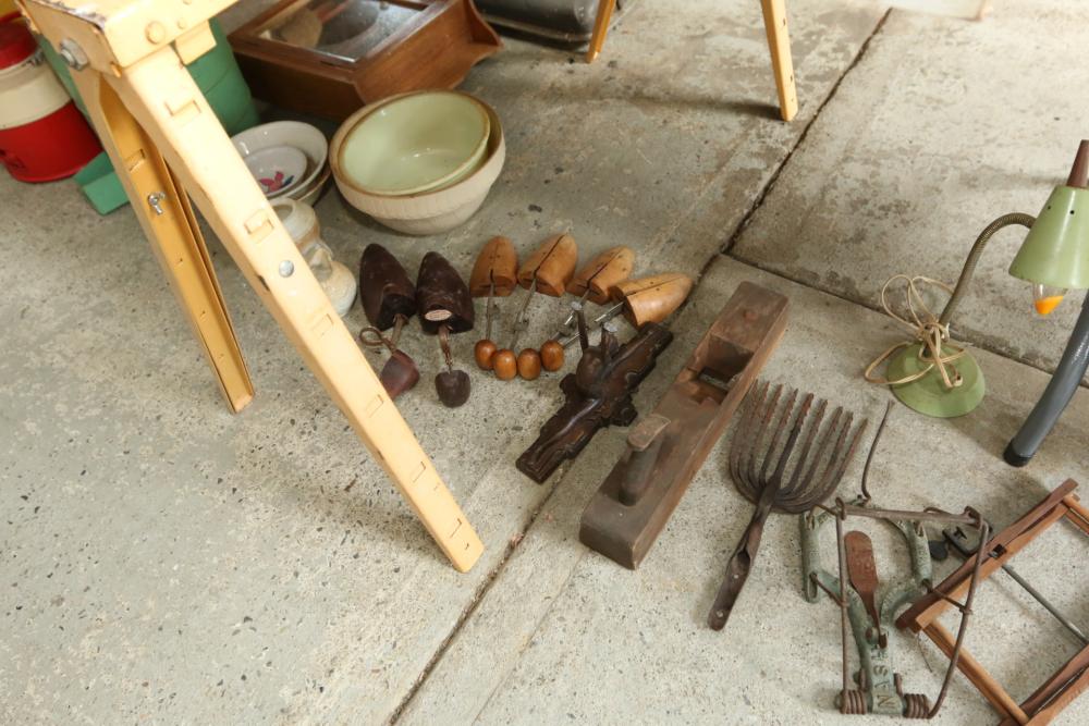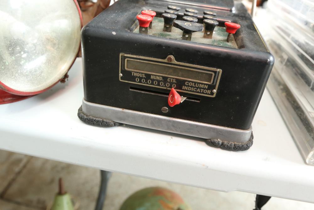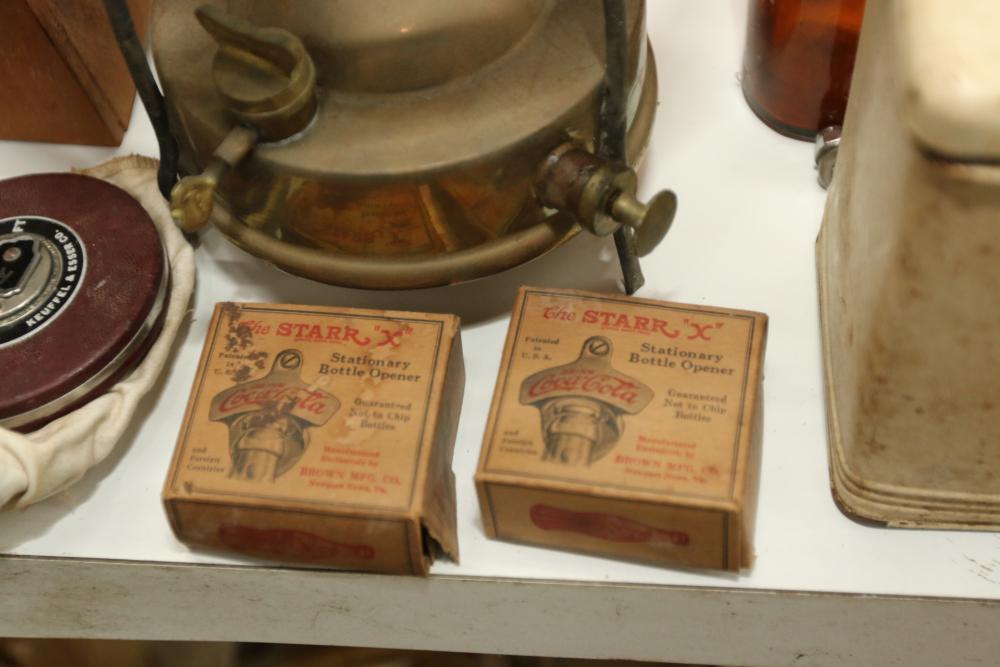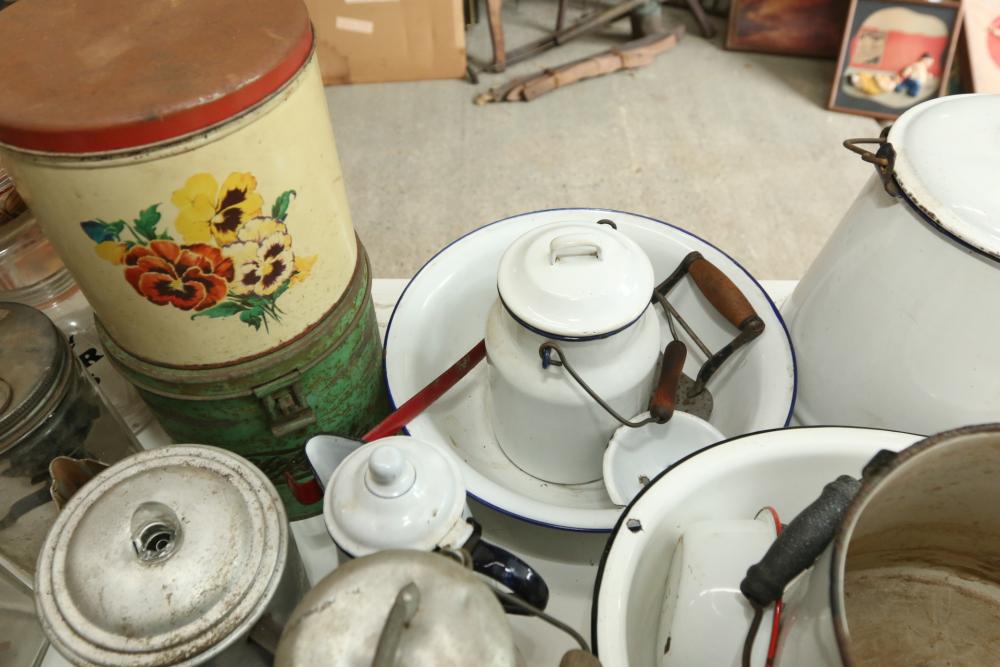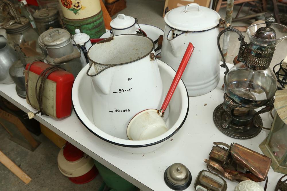 Table lot including planers, receipt machine, lamps, globes, MLB gametime watch, cutlery, teapots, jars, pin insulator, coke glass bottles, sad irons, bottle holders, etc.