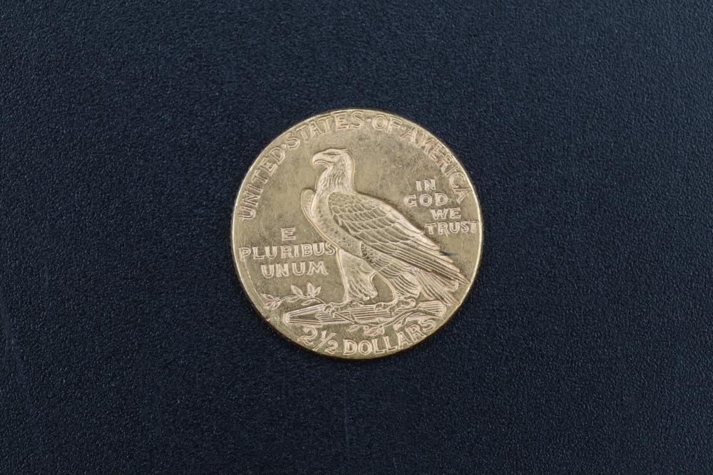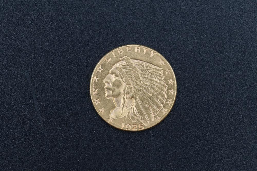 1925 U.S. $2.5 gold quarter eagle, with Indian head capped with war hat on obverse, and an Eagle on bundle of olive twigs, 4.2 grams total.