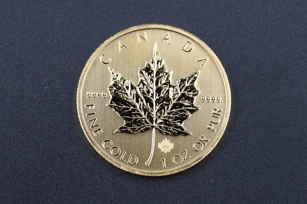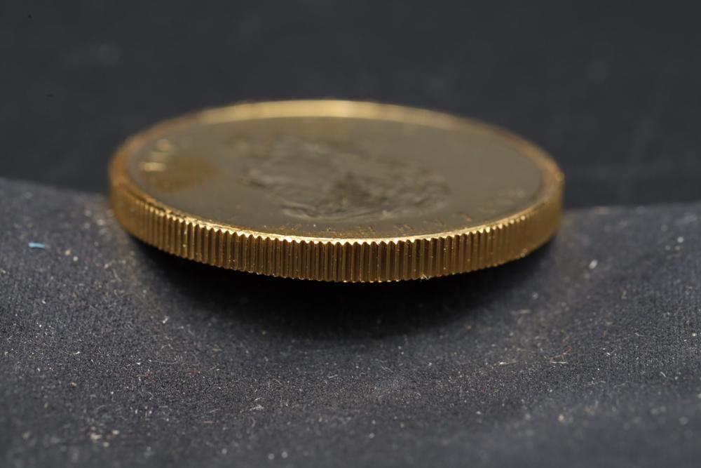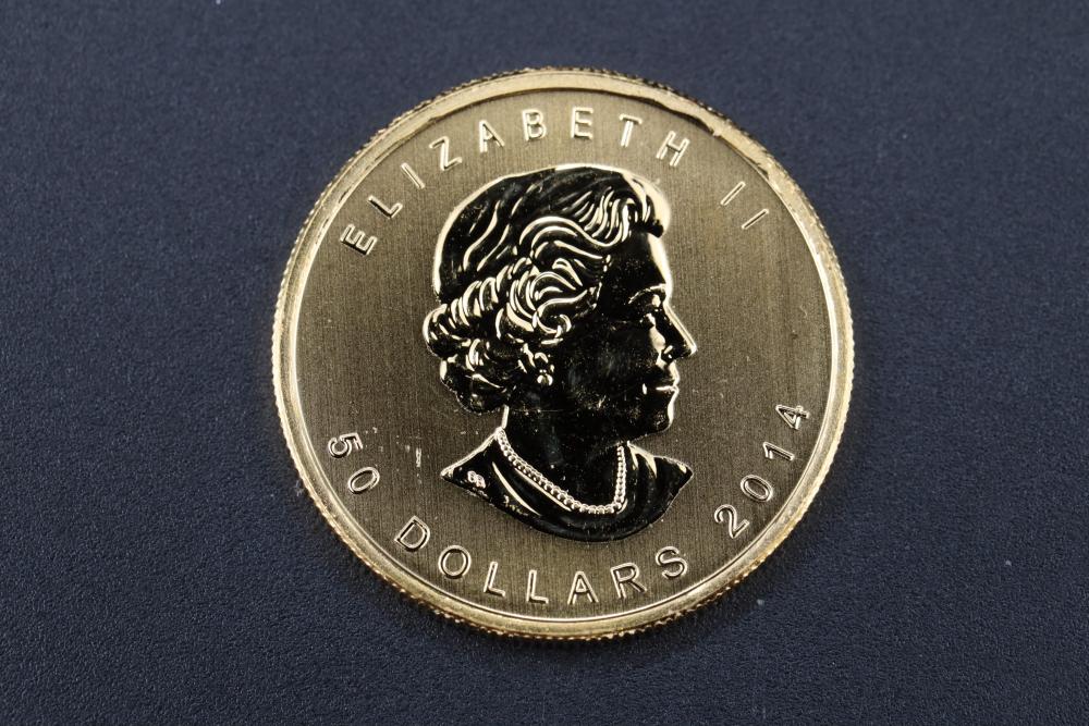 2014 Canadian $50 gold coin with bust of Queen Elizabeth II bare headed, wearing necklace and earrings on obverse, and Canadian maple leaf with security leaf on reverse, 31.1 grams total.