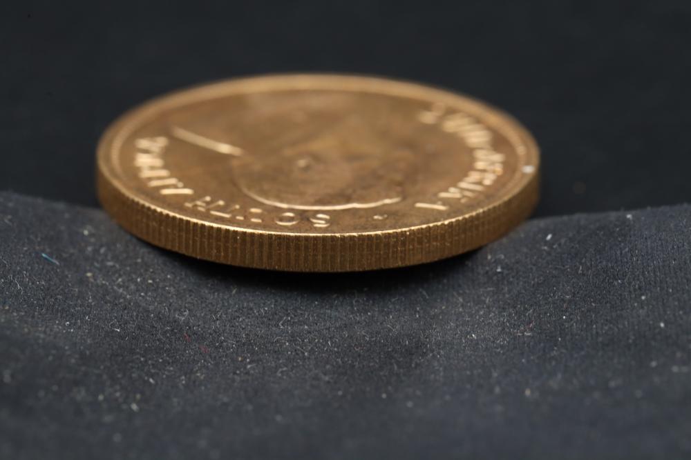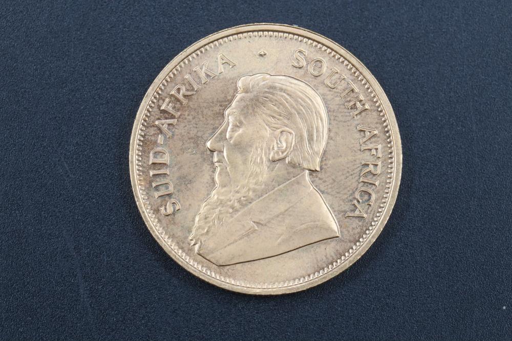 1975 South Africa 1 ounce Krugerrand gold coin, obverse with bust of Paul Kruger, reverse with springbok bounding right, 34 grams total.