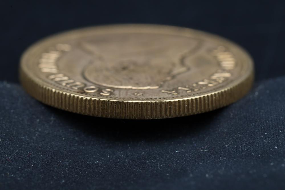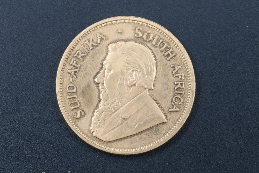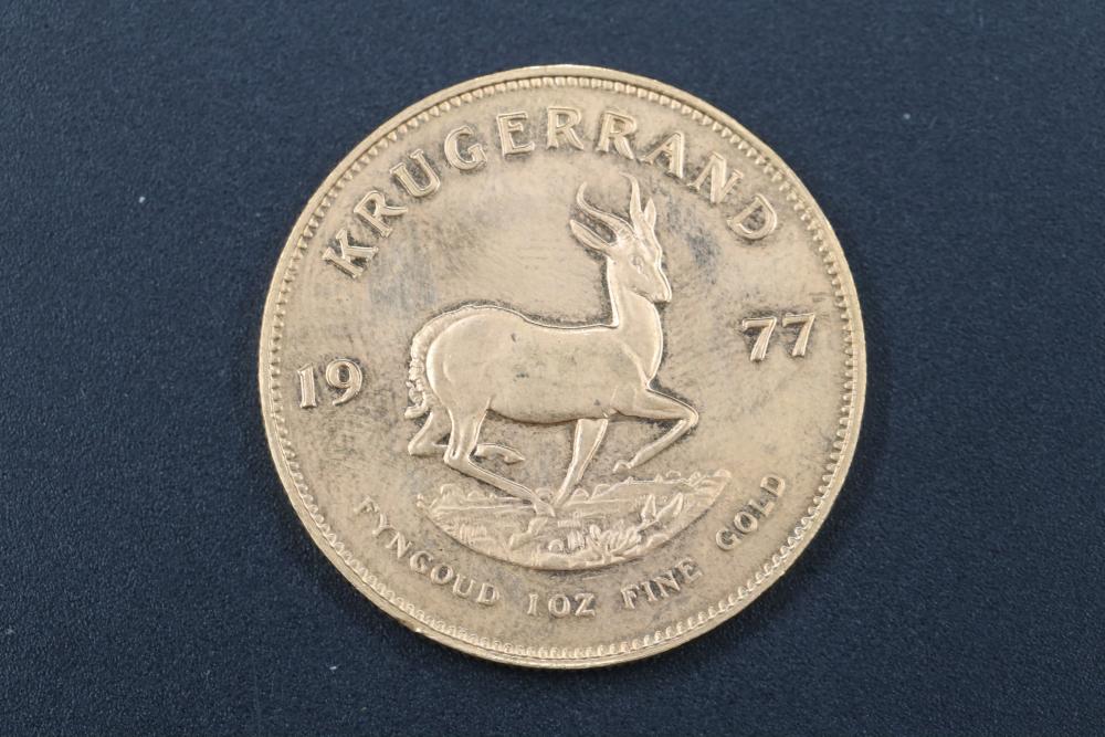 1977 South Africa 1 ounce Krugerrand gold coin, obverse with bust of Paul Kruger, reverse with springbok bounding right, 34 grams total.
