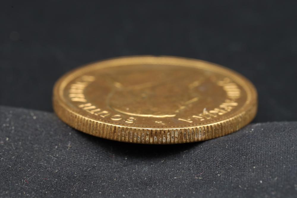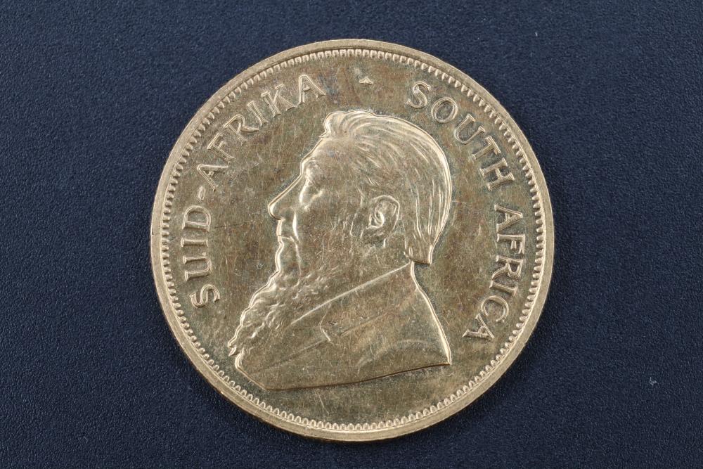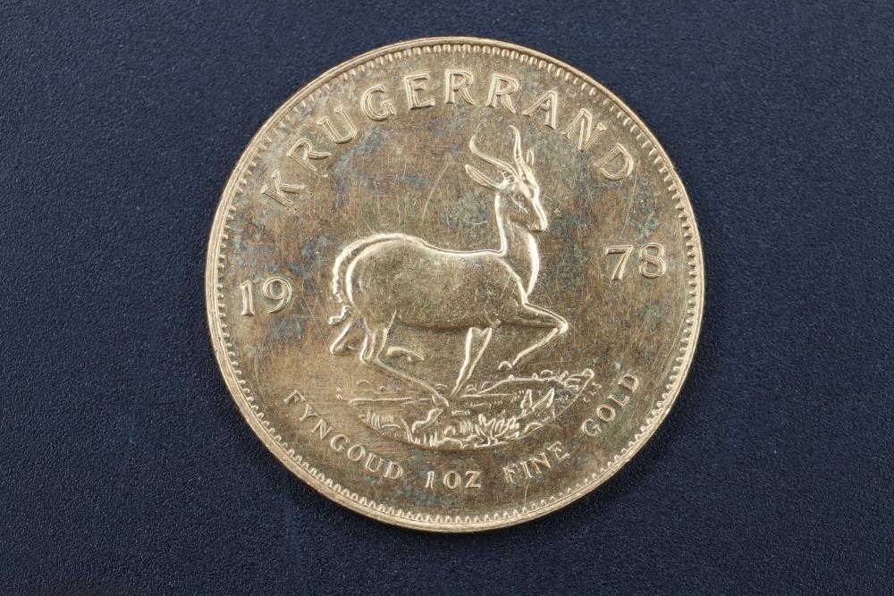 1978 South Africa 1 ounce Krugerrand gold coin, obverse with bust of Paul Kruger, reverse with springbok bounding right, 34 grams total.