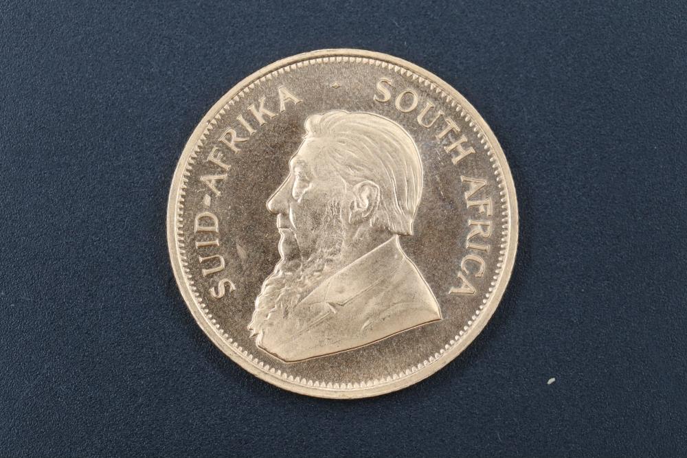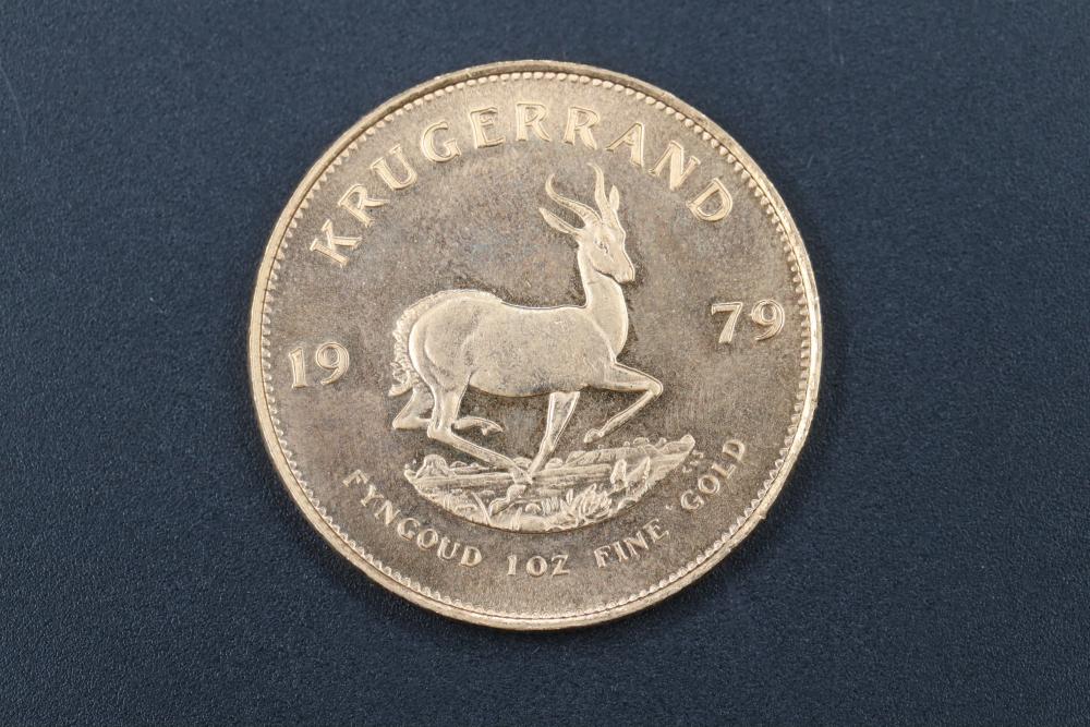 1979 South Africa 1 ounce Krugerrand gold coin, obverse with bust of Paul Kruger, reverse with springbok bounding right, 34 grams total.