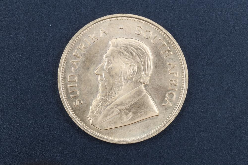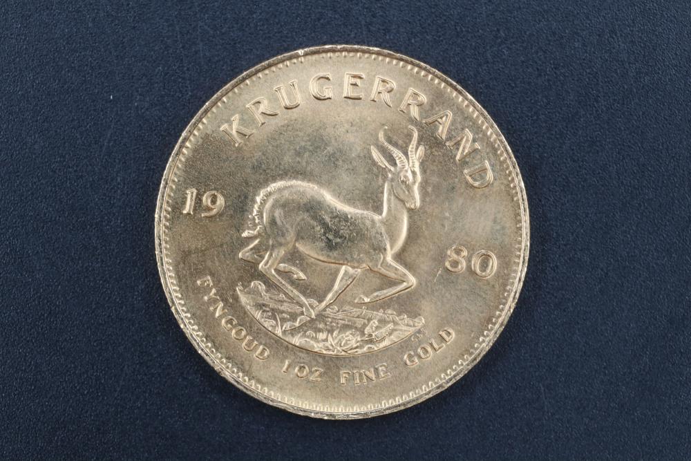 1980 South Africa 1 ounce Krugerrand gold coin, obverse with bust of Paul Kruger, reverse with springbok bounding right, 34 grams total.