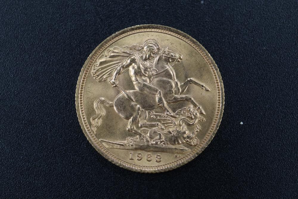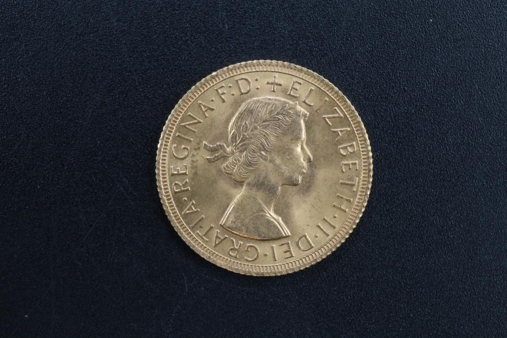 1963 gold sovereign depicting young laureate head of Queen Elizabeth II on obverse, George slaying dragon design on reverse, 8 grams total.
