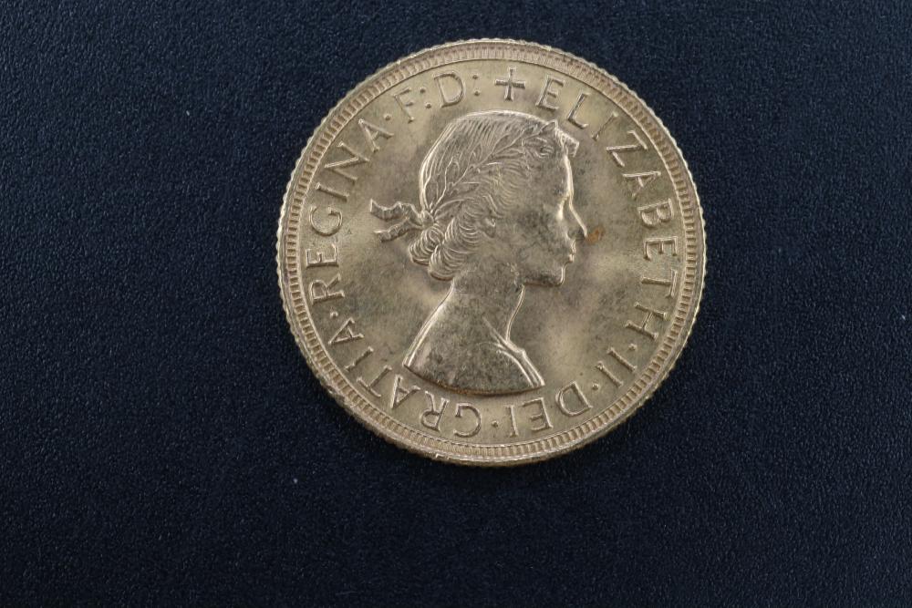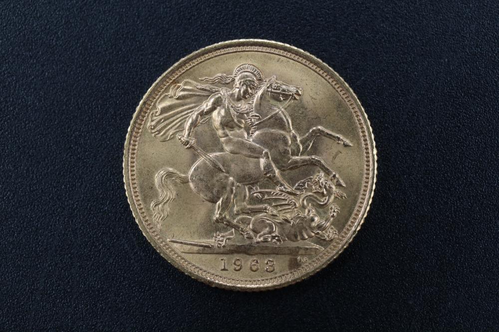 1963 gold sovereign depicting young laureate head of Queen Elizabeth II on obverse, George slaying dragon design on reverse, 8 grams total.