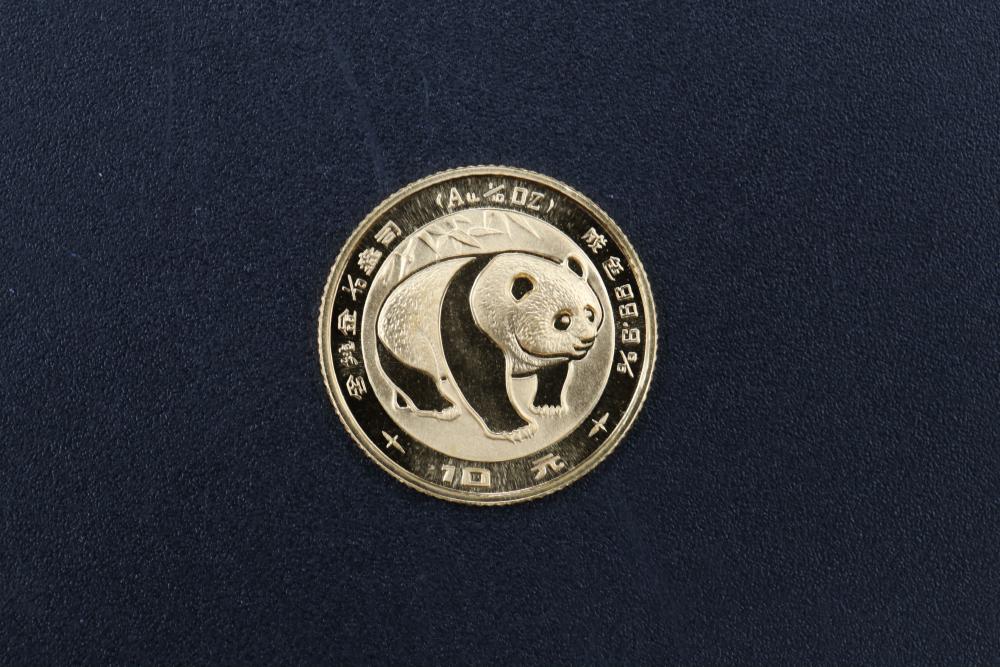 1983 10 Yuan Panda gold coin with Temple of Heaven on obverse, and Panda climbing rock on reverse, 3.2 grams total.
