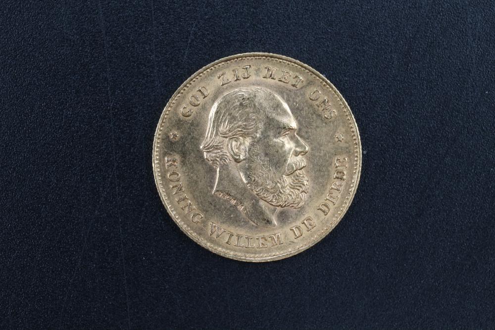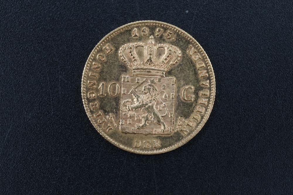 1875 10G gold coin with portrait of King Willem III on obverse, and coat of arms on reverse, 6.7 grams total.