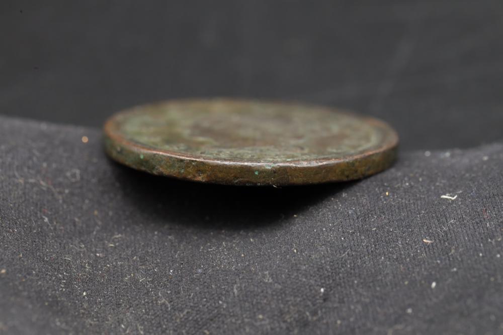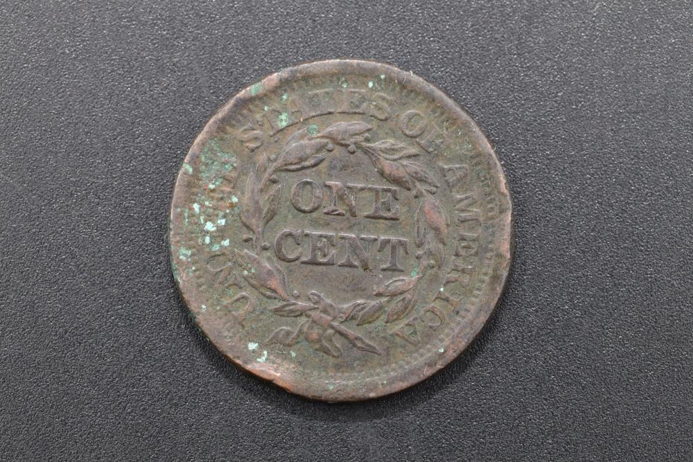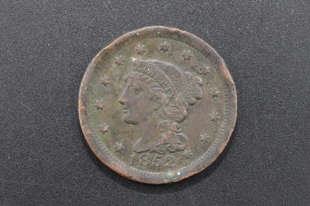 1852 large 1 cent copper penny, with portrait of liberty on obverse, and value within wreath on reverse.