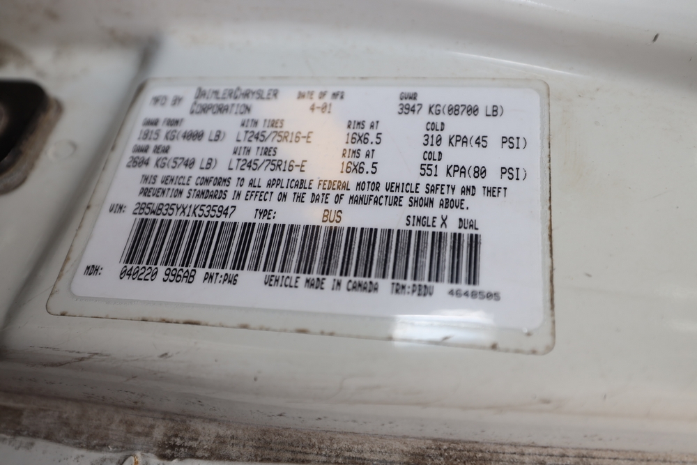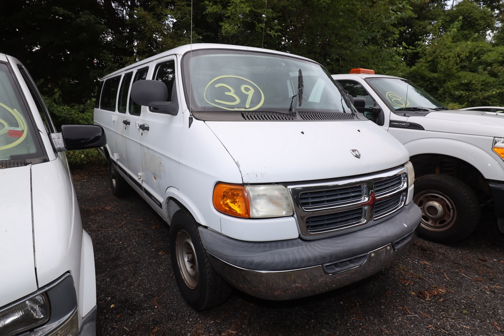 2001 Dodge B3500 van, VIN#: 2B5WB35YX1K535947. Odometer reading: 29222, seller's comments: Age & mileage, runs rough, parts missing, dents, 12 volt battery - no good. Engine: 5.2L V8. Title available. Fleet#: 07100
